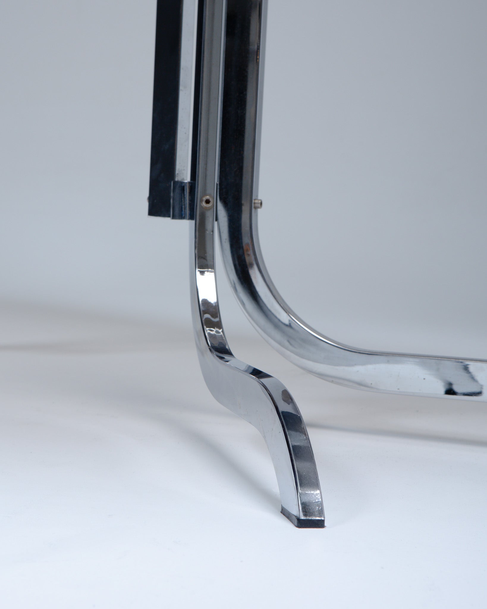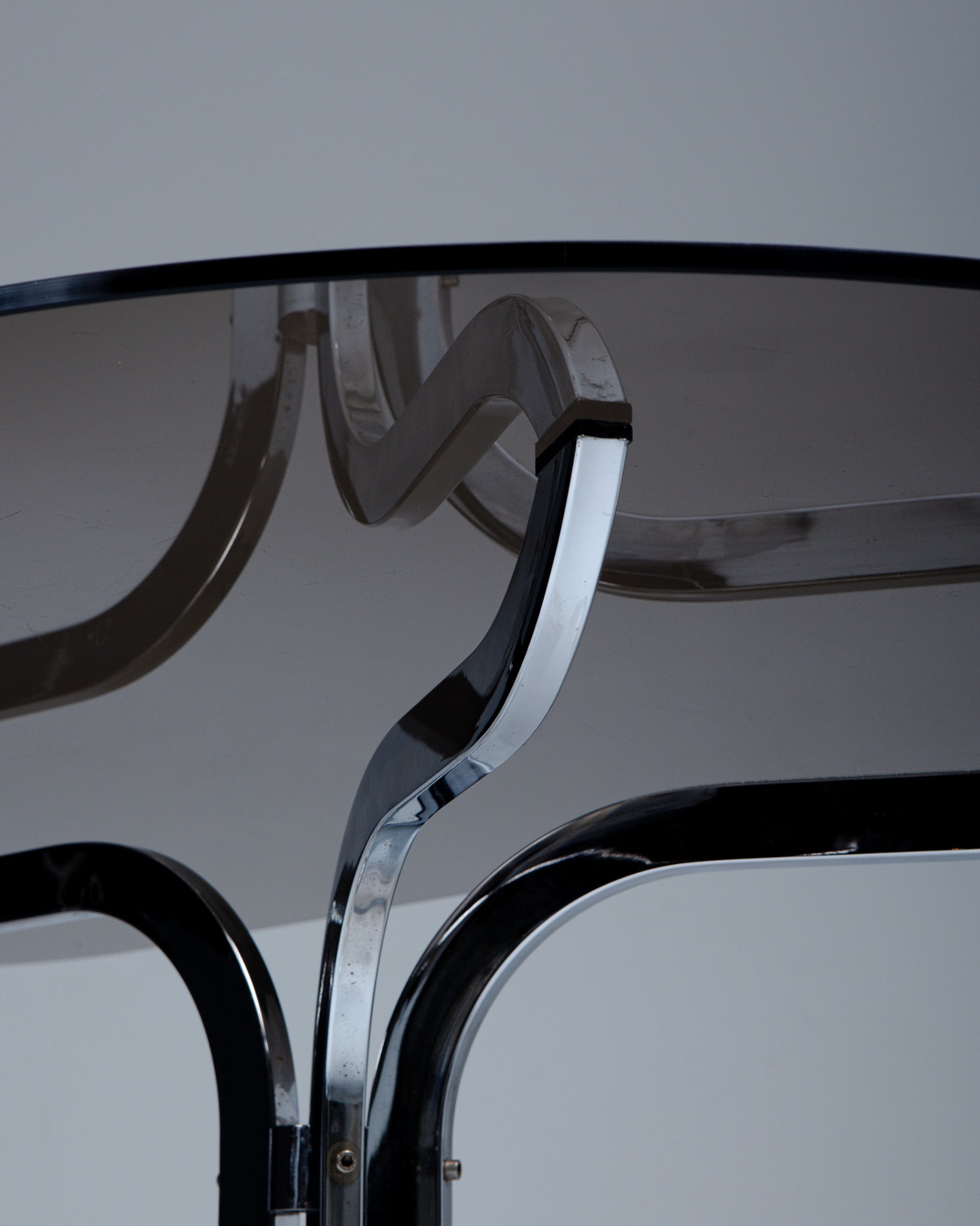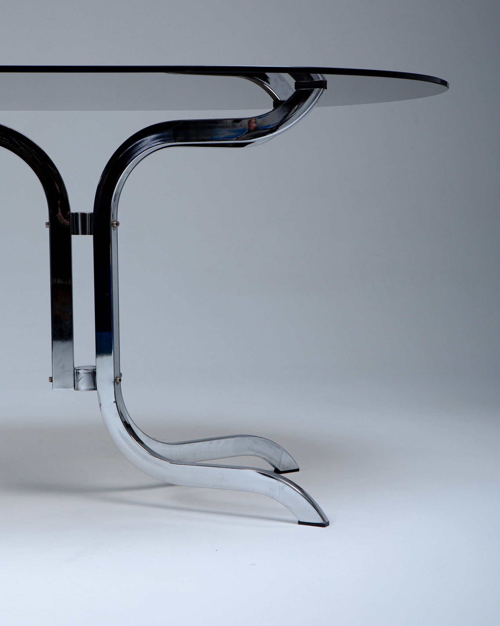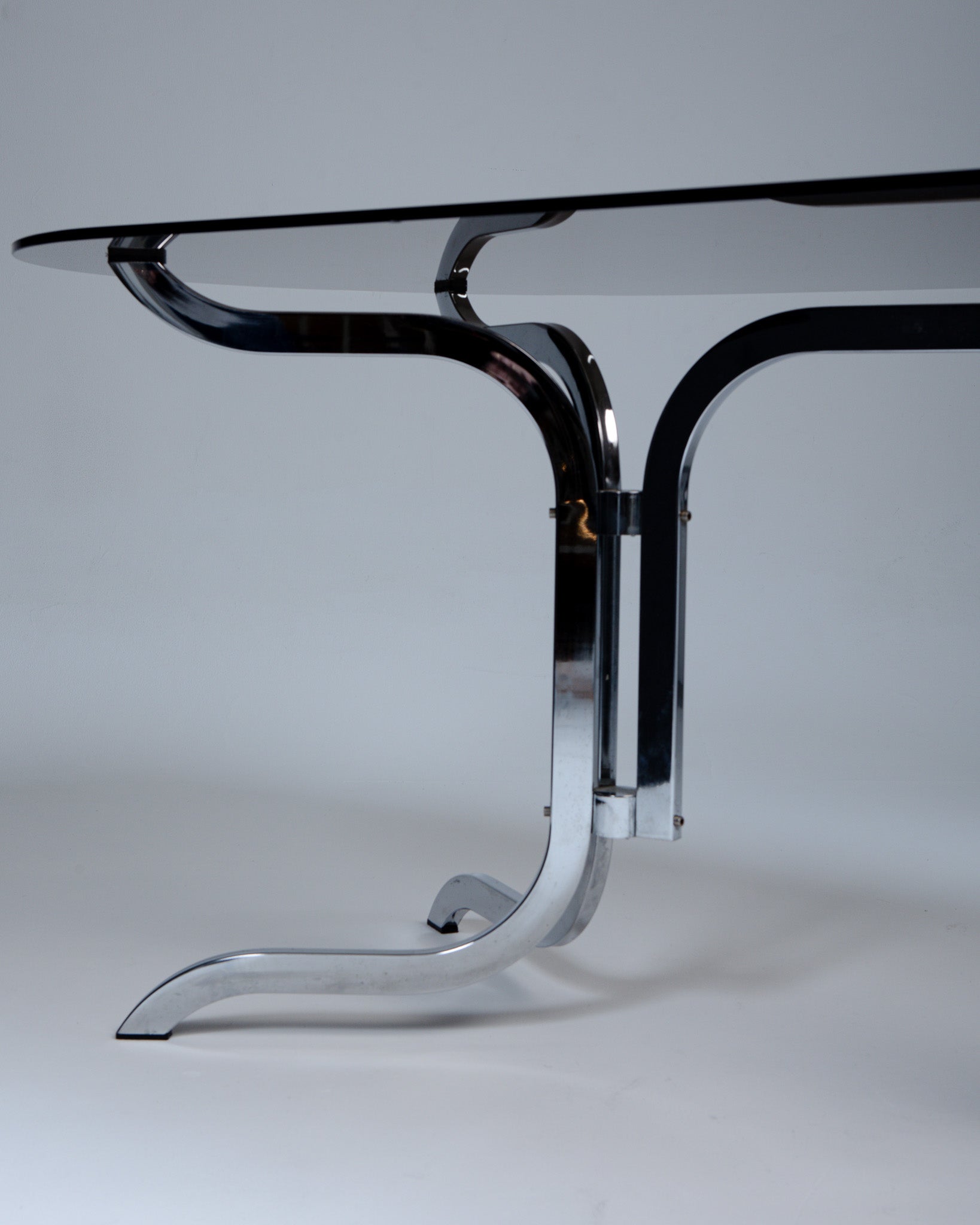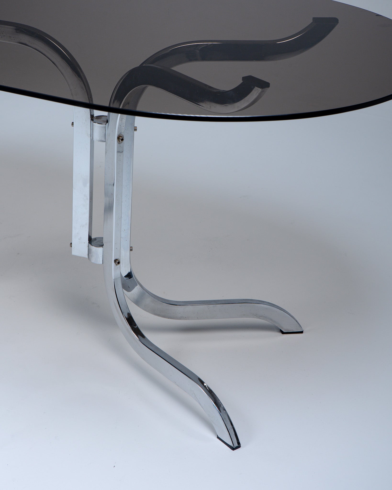 Grande table à manger éditée par Roche Bobois dans les années 1970. Structure sculpturale en métal chromé formant des pieds courbés et entrelacés. Plateau en verre fumé reposant sur une base centrale à quatre branches. Lignes fluides et design emblématique du modernisme des années 70.