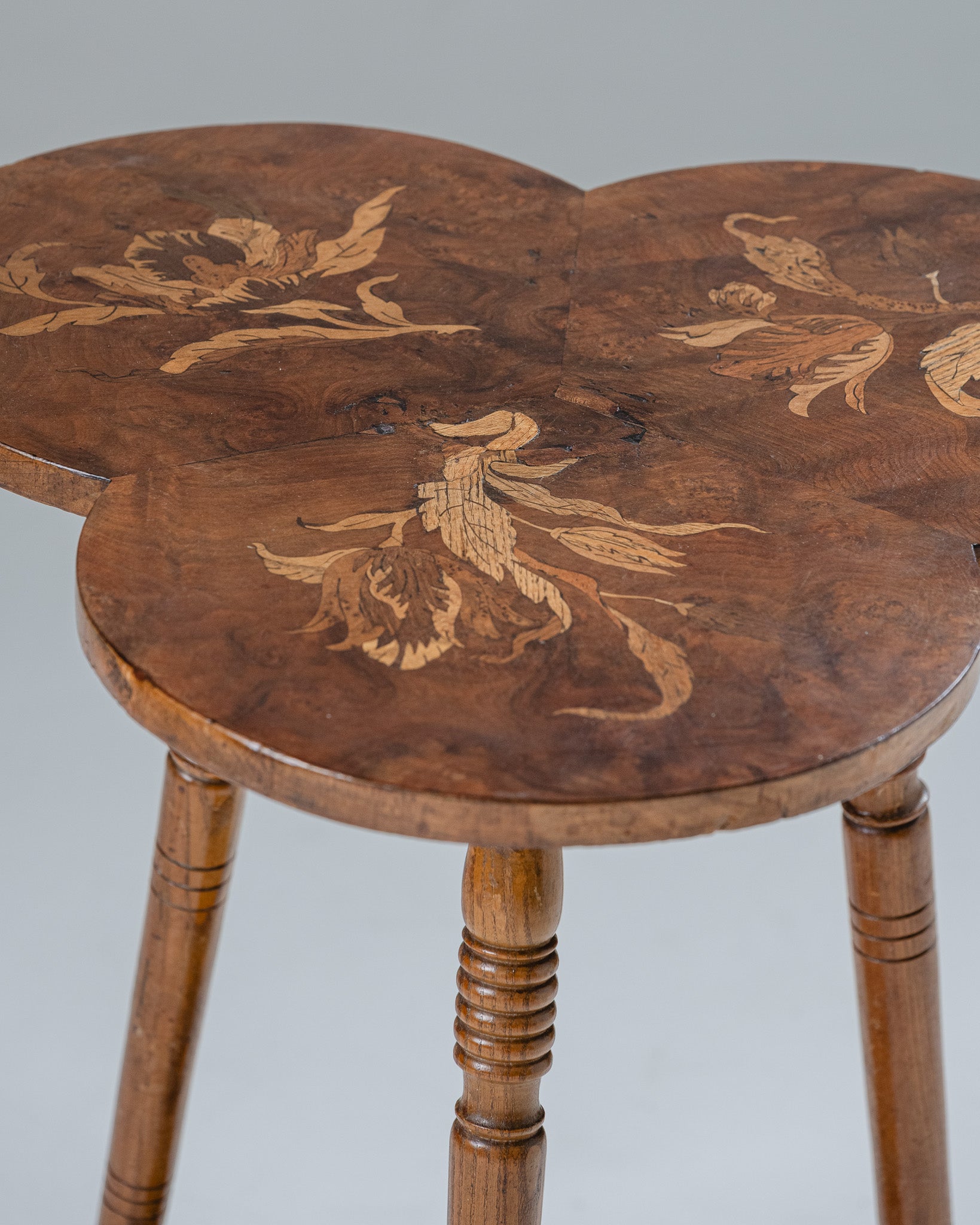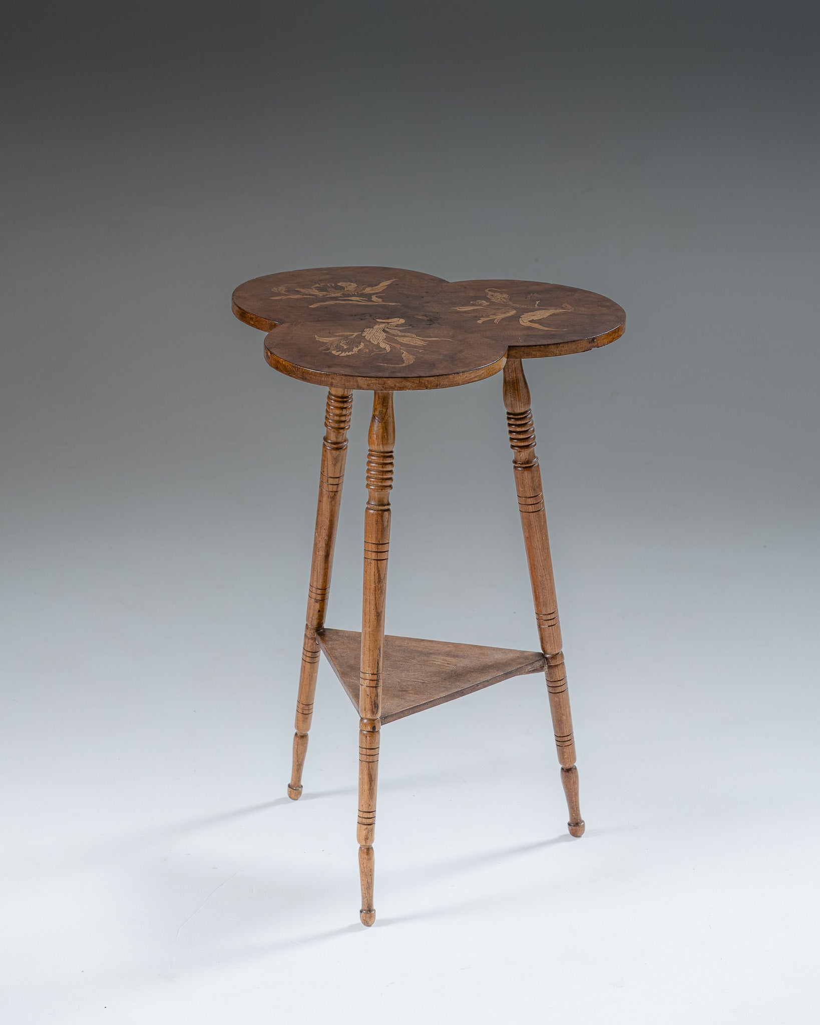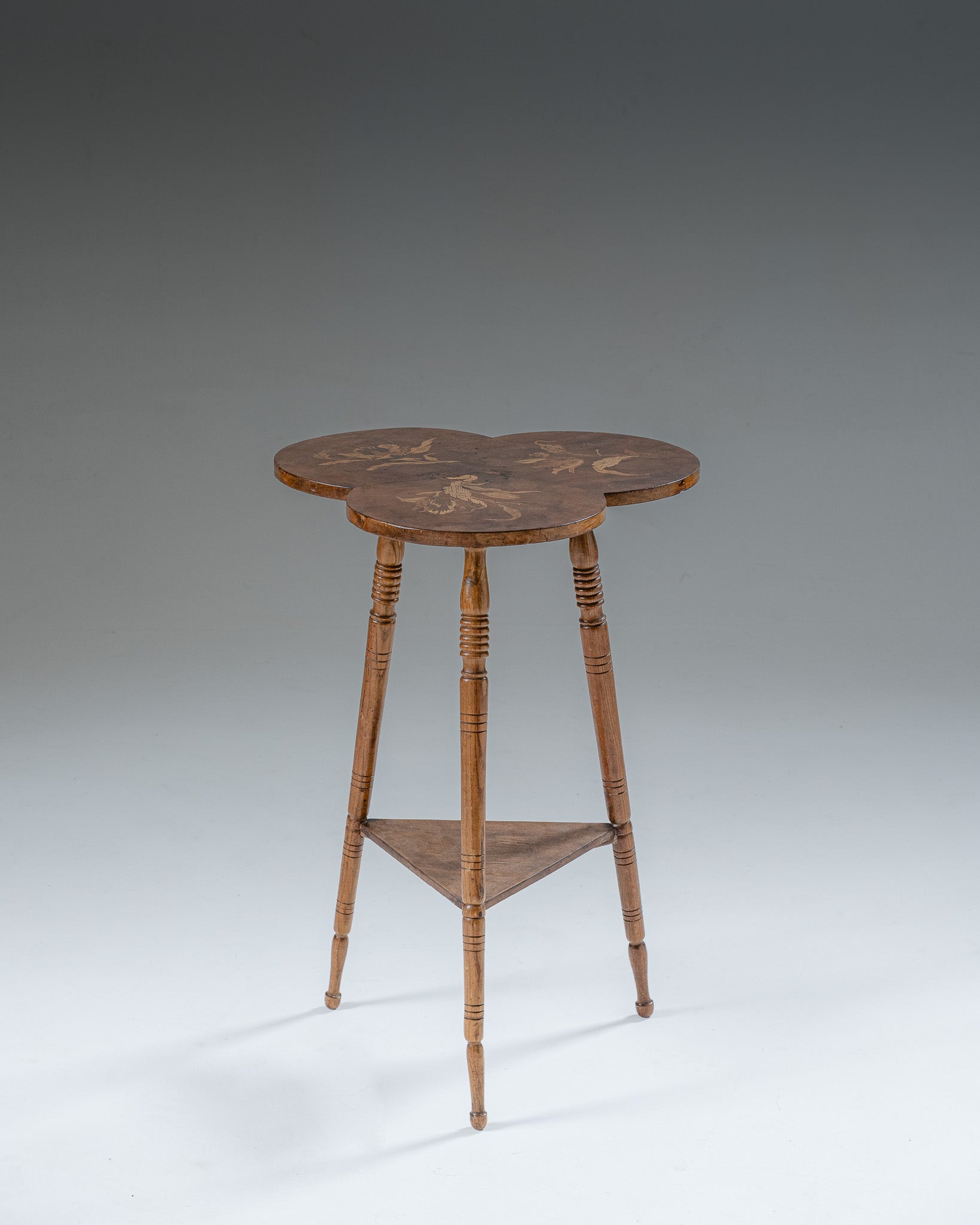 Guéridon tripode à plateau en forme de trèfle. Structure en bois massif. Plateau composé de trois lobes circulaires assemblés, décor marqueté à motif floral. Piètement à trois pieds tournés, reliés par une entretoise triangulaire assurant la stabilité. Production de style Art nouveau, début XXe siècle.