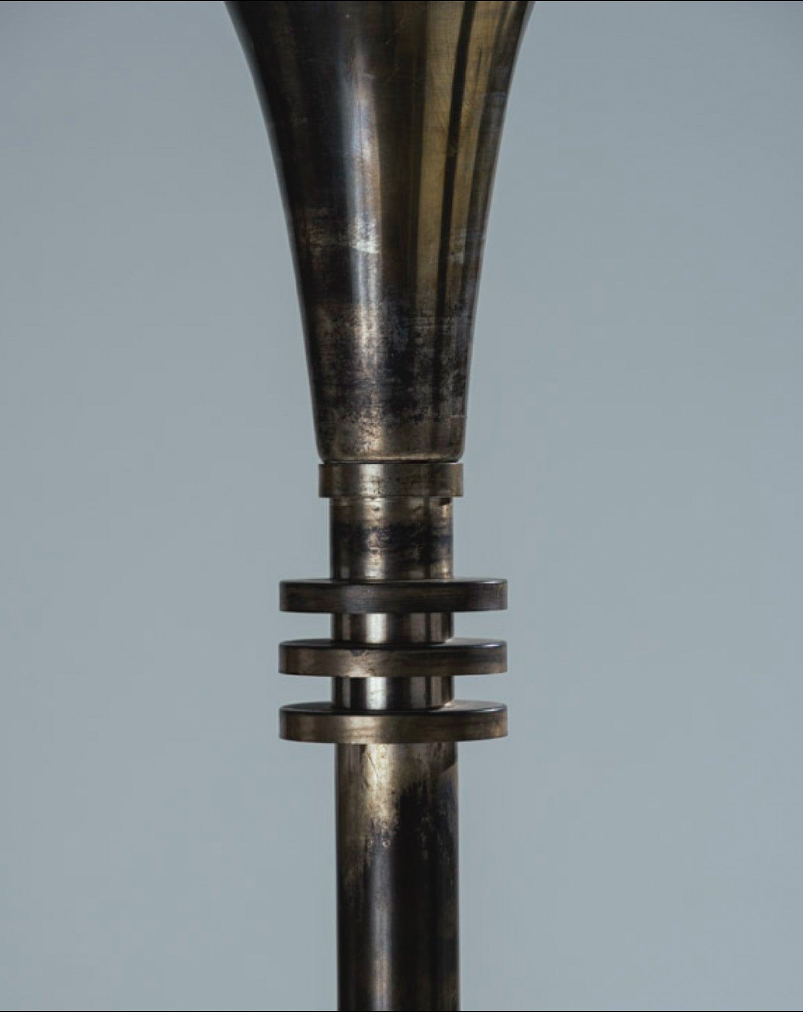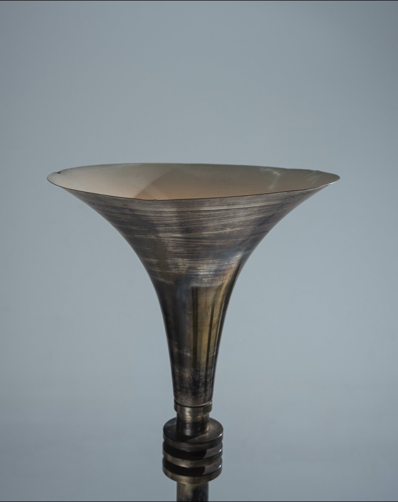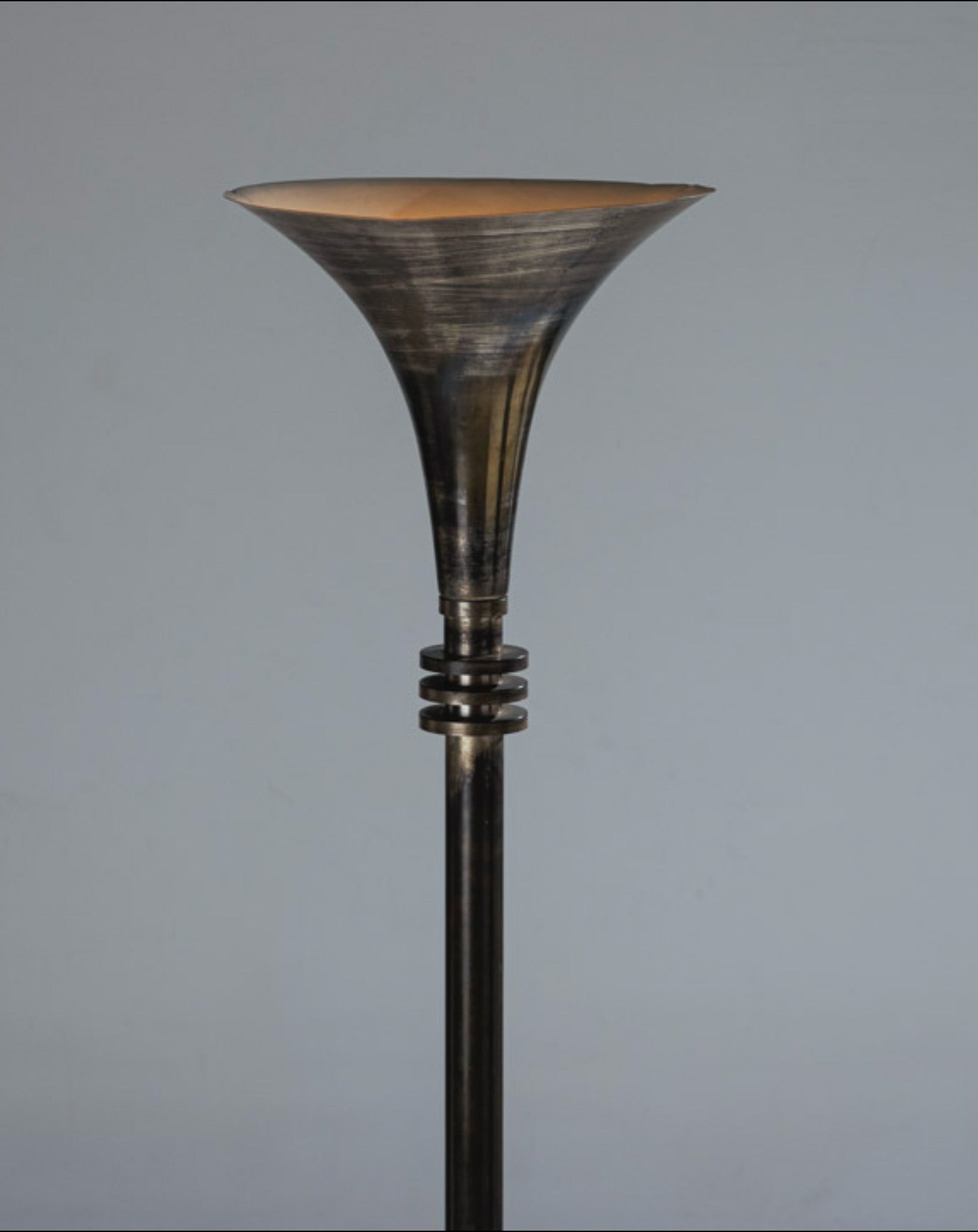 Lampadaire en métal prenant la forme d’une trompette, dans le style Art déco des années 1930. Le fût s’évase en partie haute en forme de tulip, monté sur un pied cylindrique entouré d’un triple cerclage en haut et en bas, et reposant sur une base circulaire.