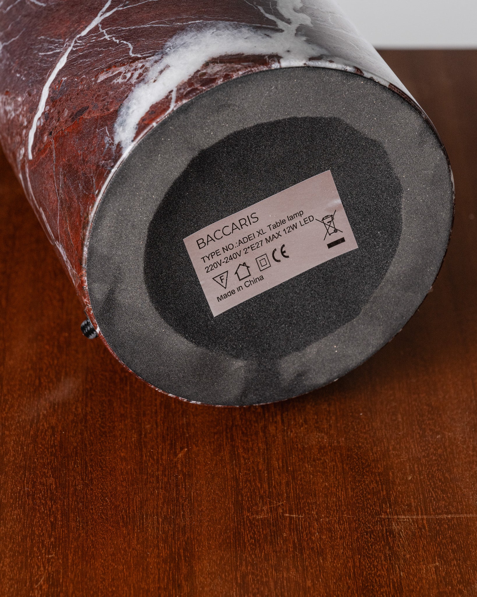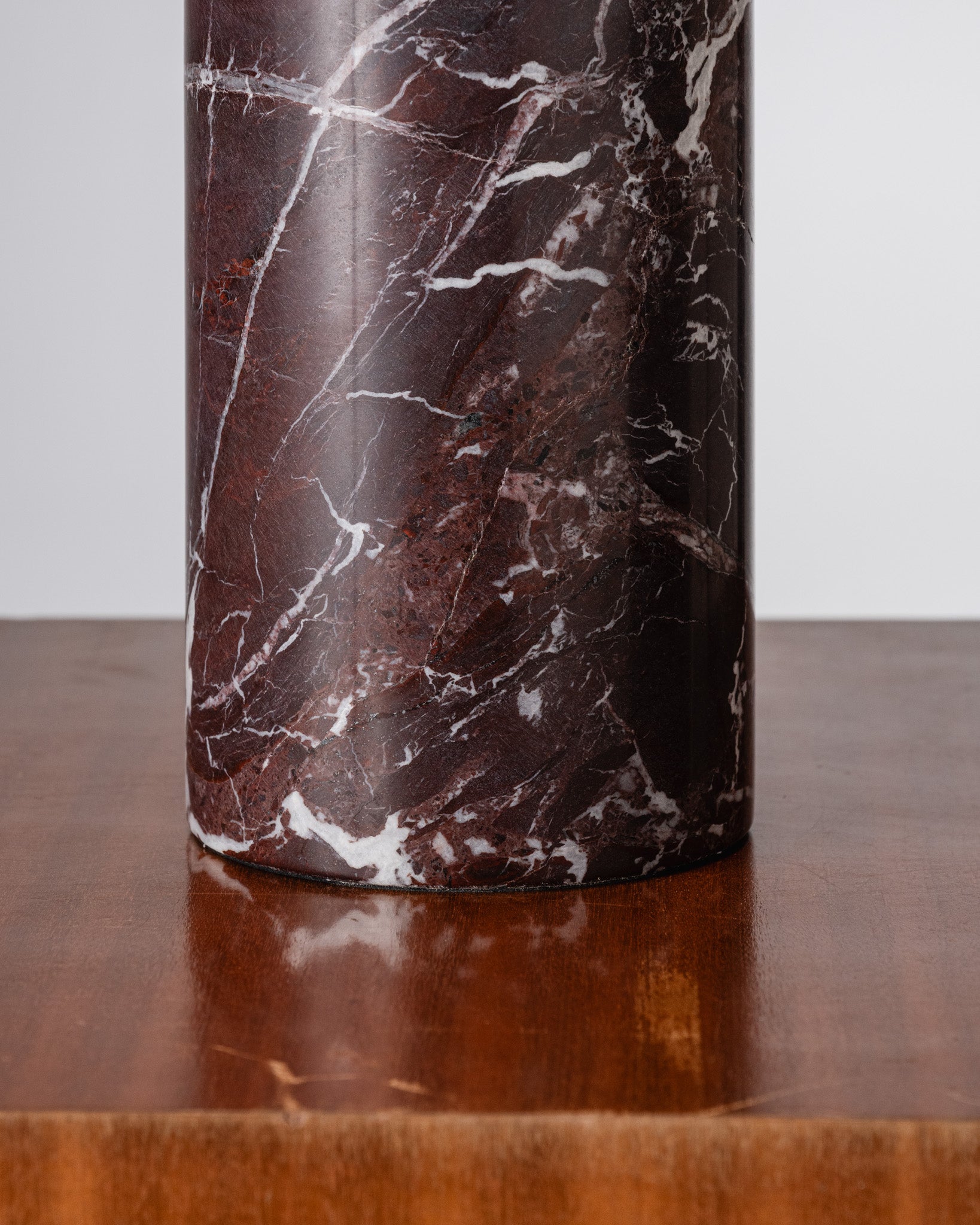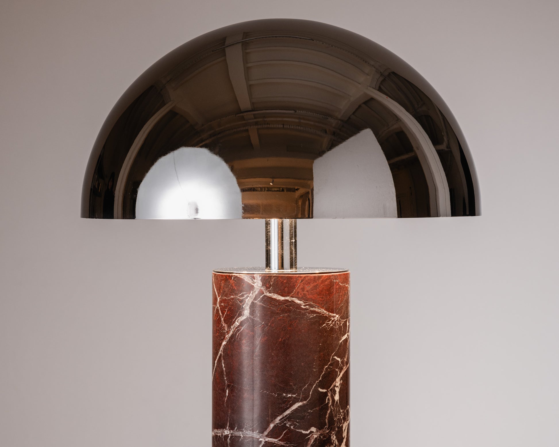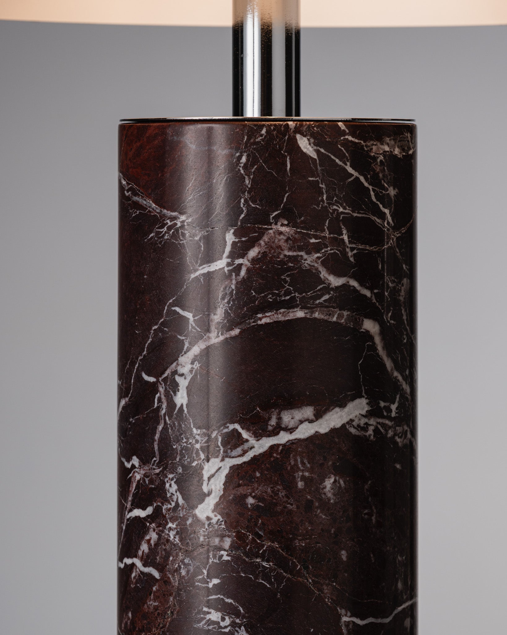 Lampe de table éditée par ADEI signée. Le fût cylindrique en marbre rouge veiné est surmonté d’un abat-jour hémisphérique en métal chromé.
