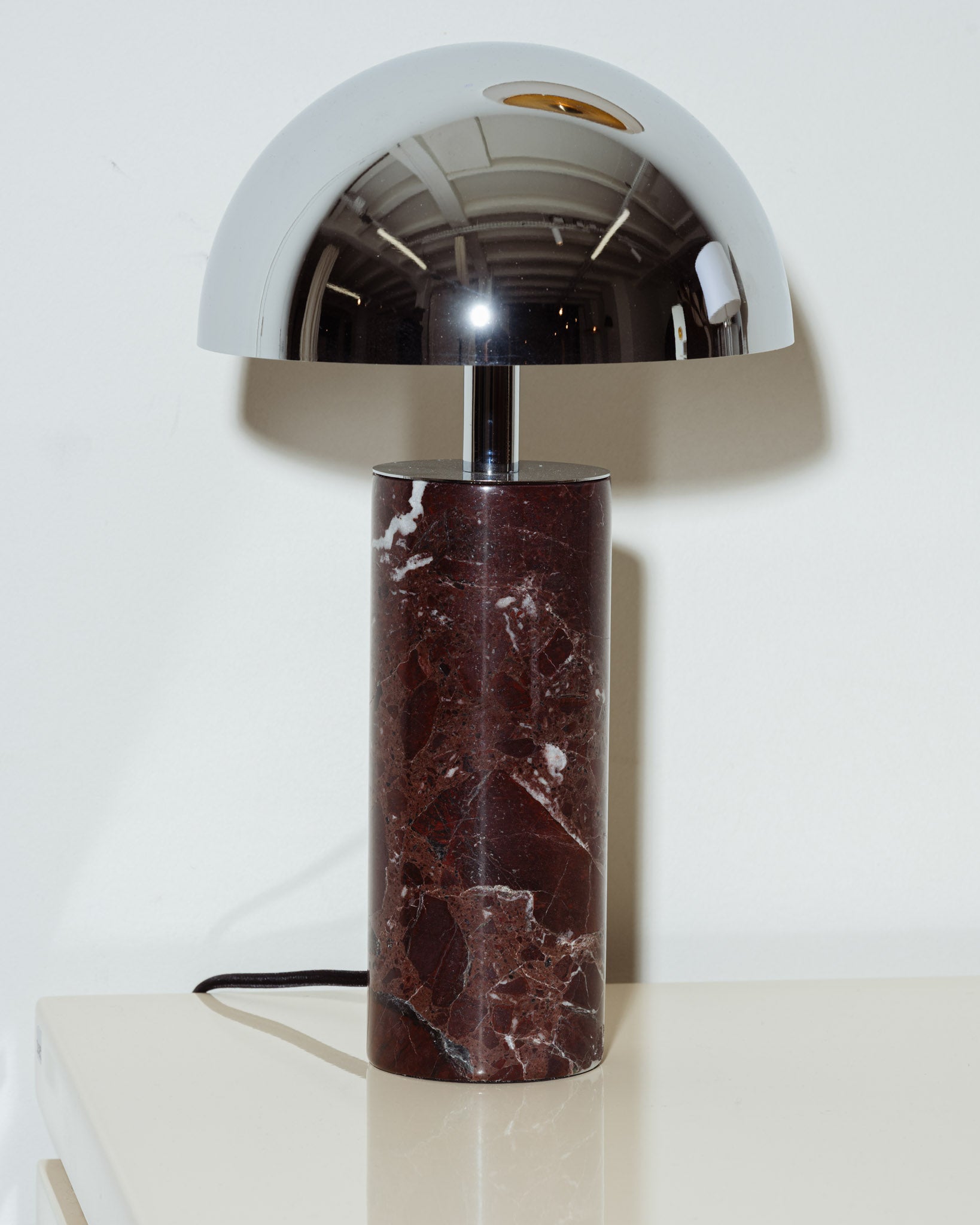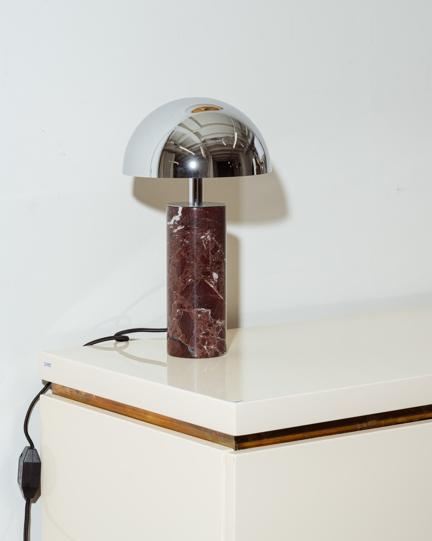 Lampe de table éditée par ADEI signée, en taille M. Le fût cylindrique en marbre rouge veiné est surmonté d’un abat-jour hémisphérique en métal chromé.
