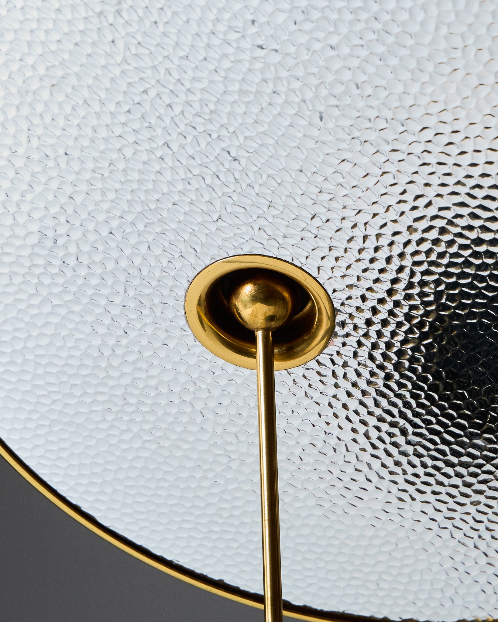 Lampe à poser en laiton, modèle TOS par Florian Schultz. Design moderniste allemand des années 1990. La base cylindrique accueille la source lumineuse et est surmontée d’une tige centrale supportant un large réflecteur circulaire. L’intérieur du réflecteur est texturé, conçu pour diffuser et réfléchir la lumière vers le bas. Interrupteur intégré à la base permettant de régler l’intensité lumineuse. Très bel état général.