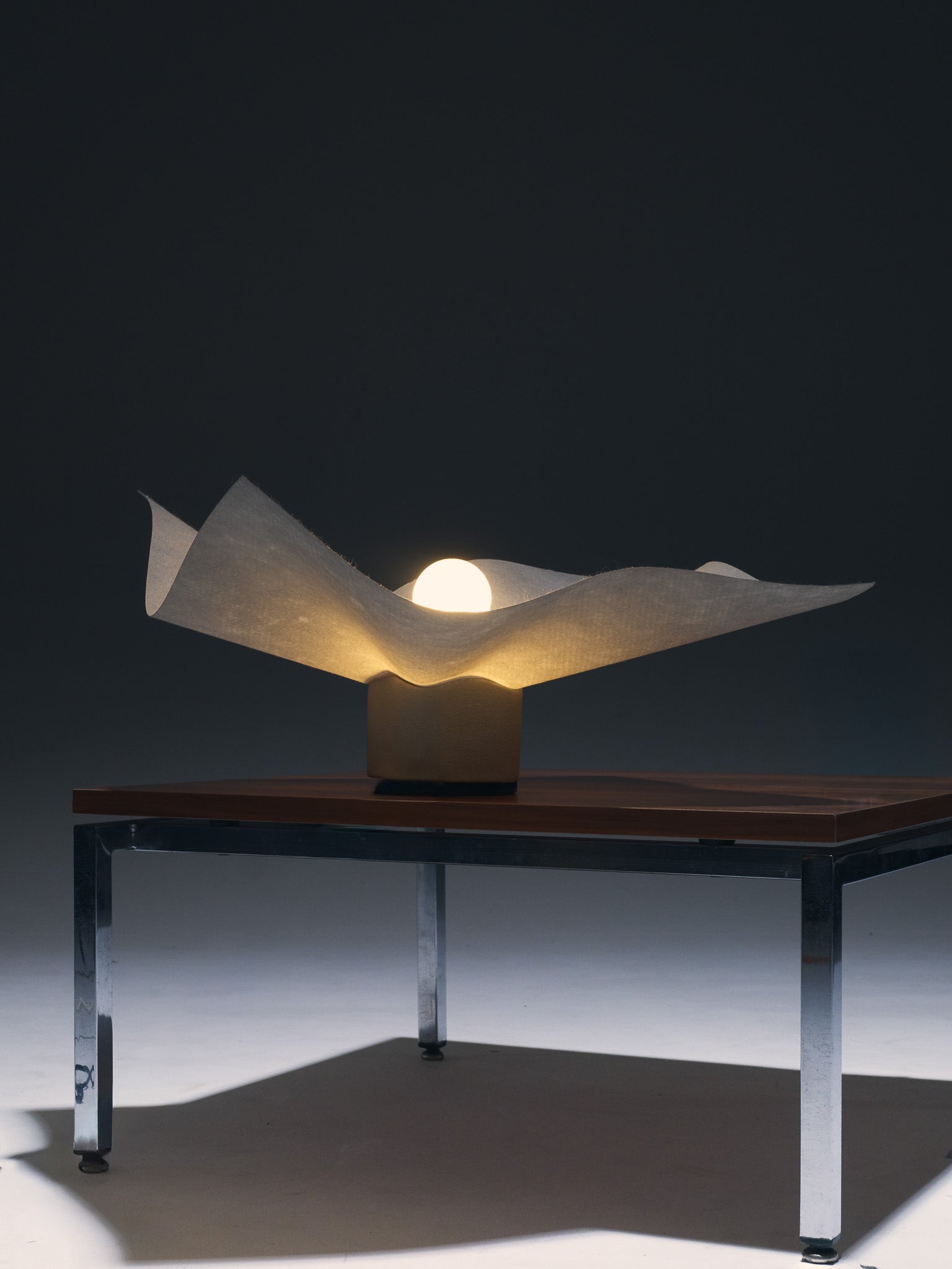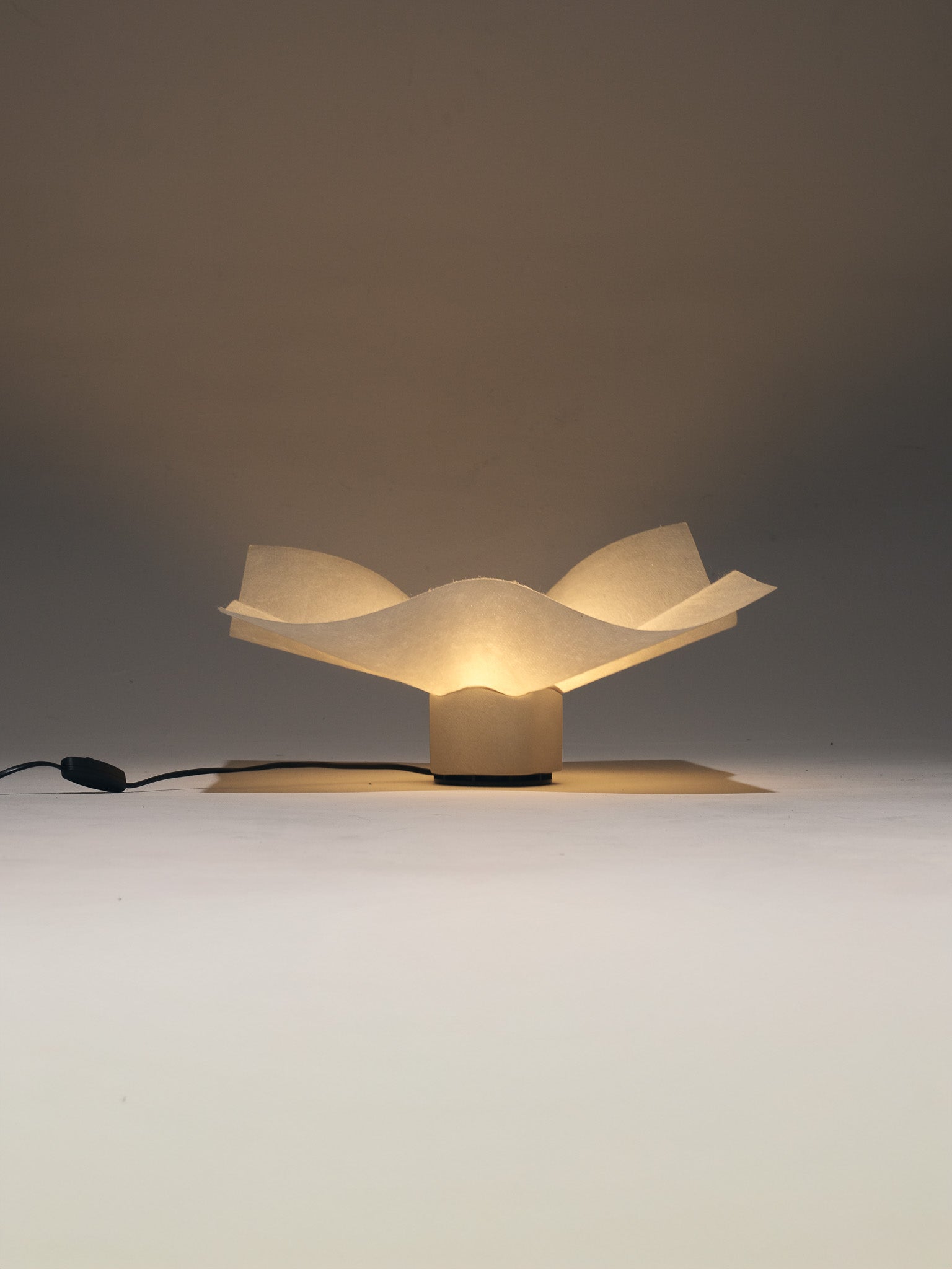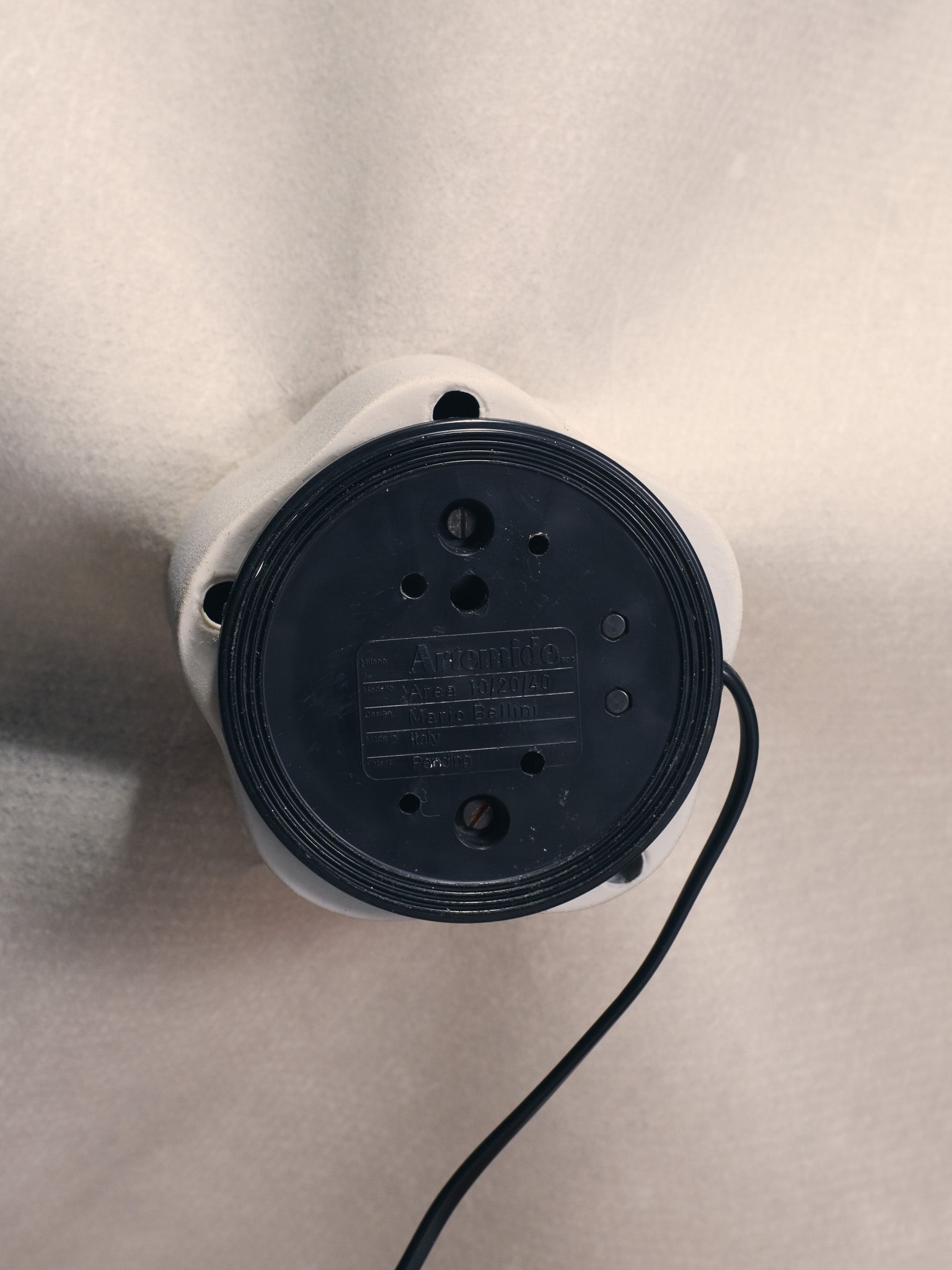 Lampe à poser "Area 10" éditée par Artemide en 1974, design Mario Bellini. Piètement sculptural en céramique émaillée crème, surmonté d'un diffuseur beige thermoformé, reprenant la silhouette ondulée emblématique de la série Area.