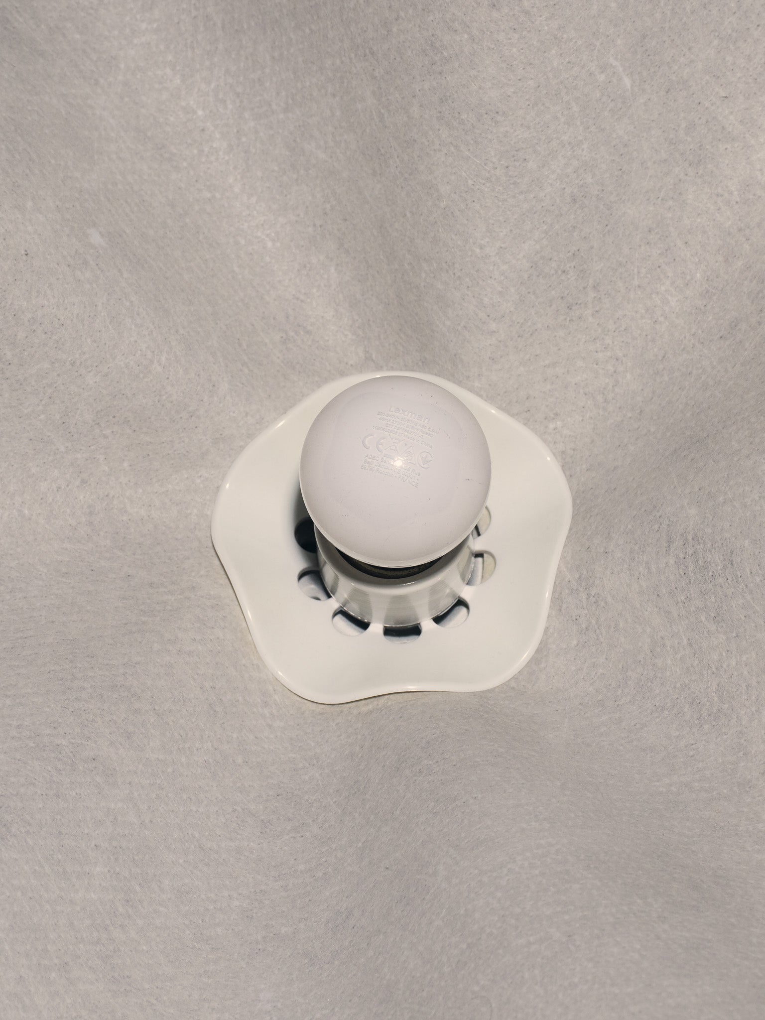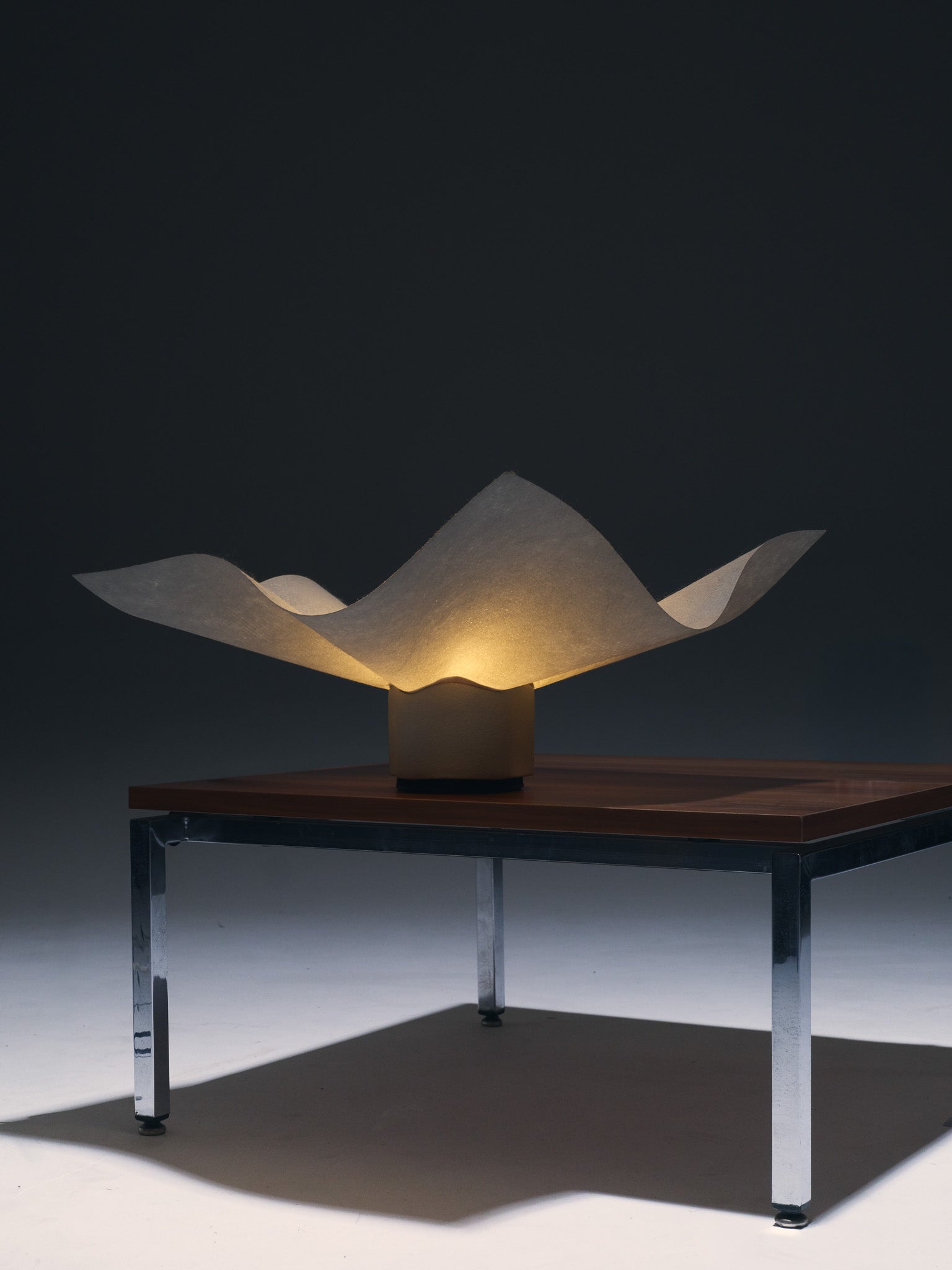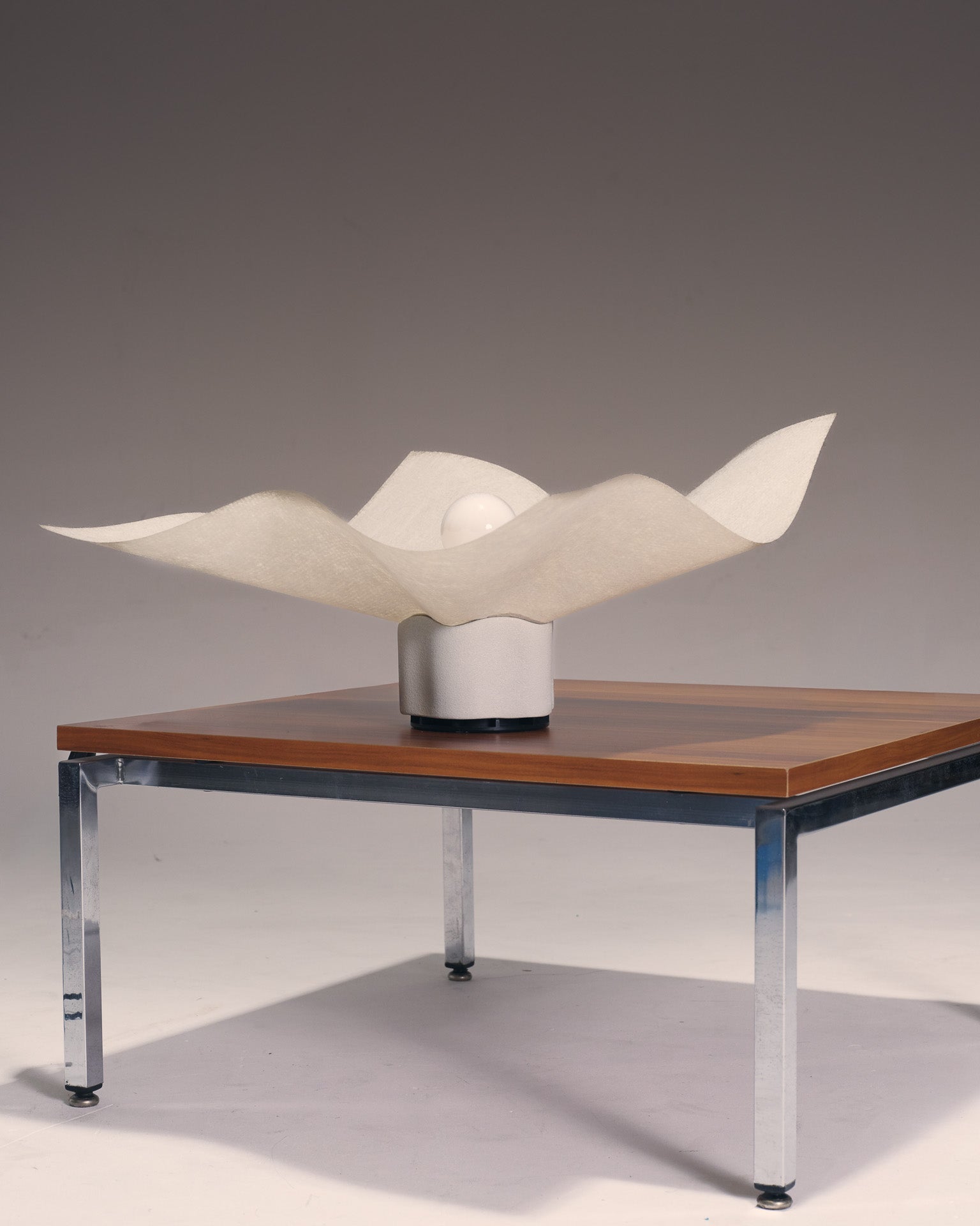 Lampe à poser "Area 10" éditée par Artemide en 1974, design Mario Bellini. Piètement sculptural en céramique émaillée crème, surmonté d'un diffuseur beige thermoformé, reprenant la silhouette ondulée emblématique de la série Area.