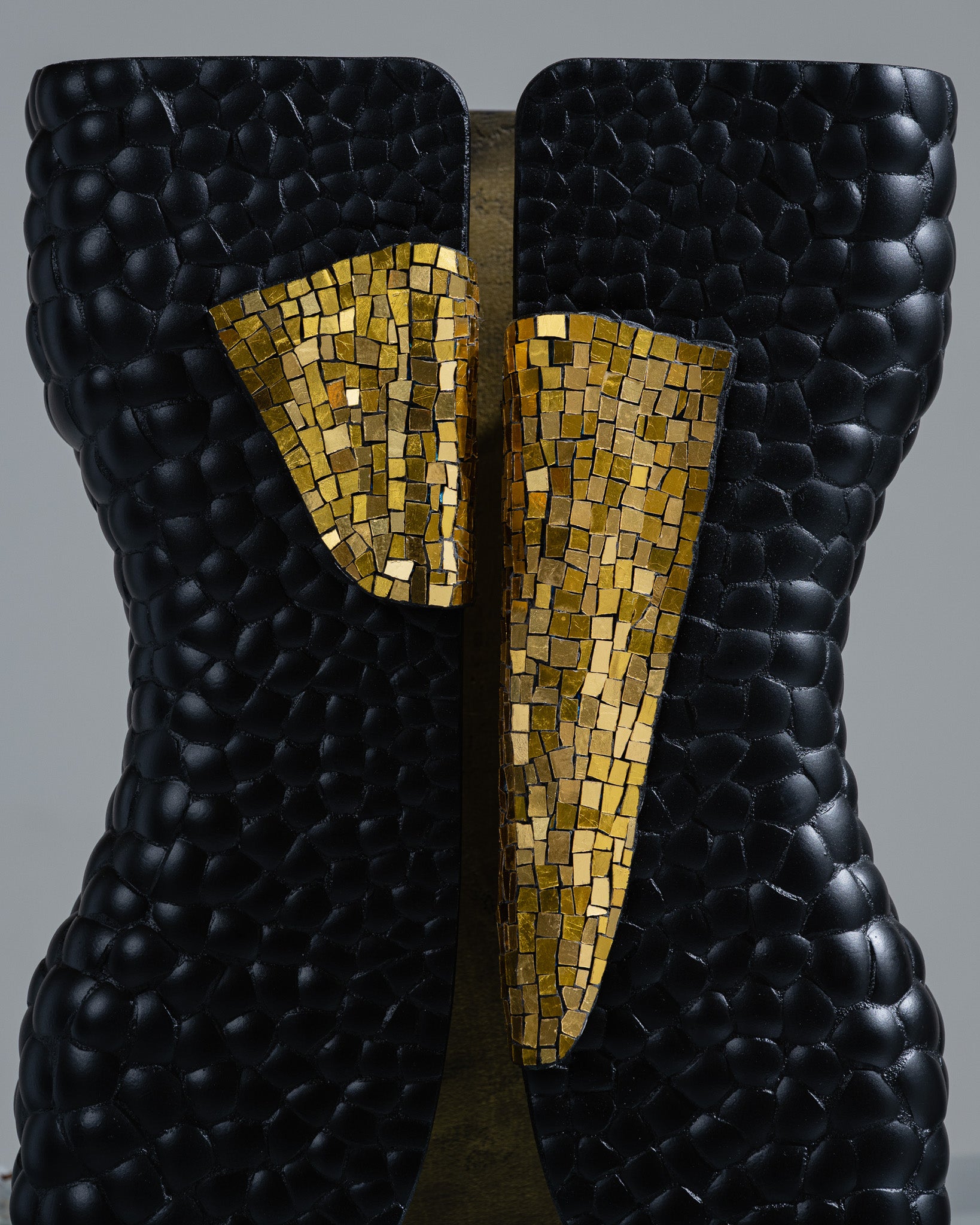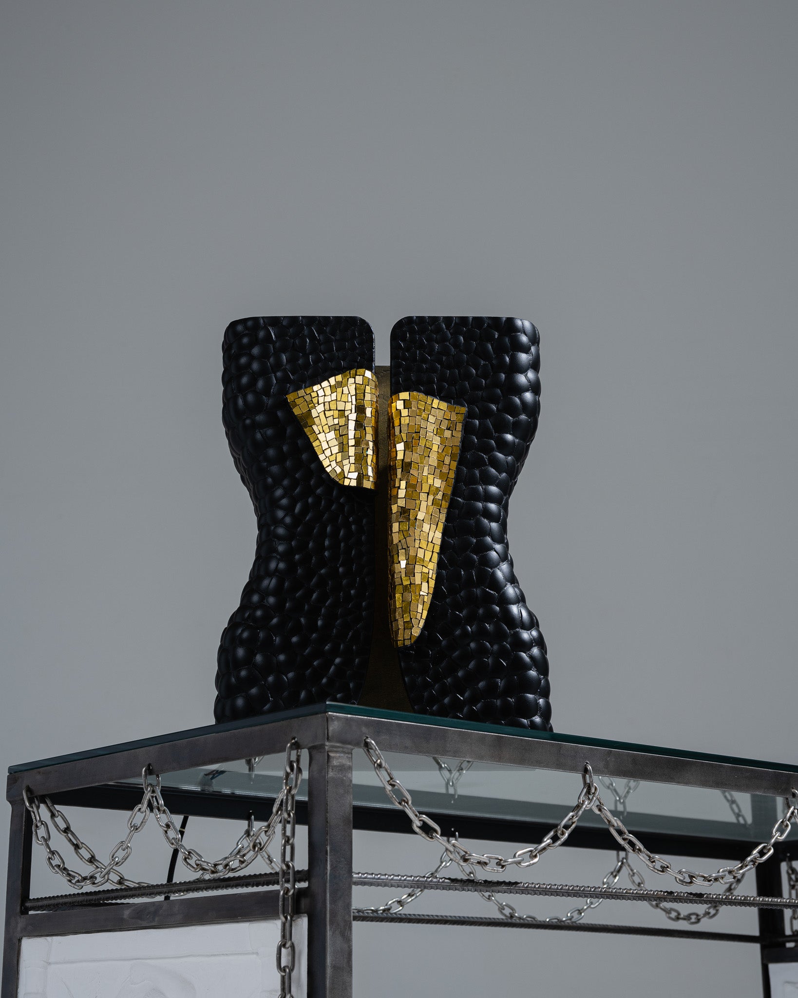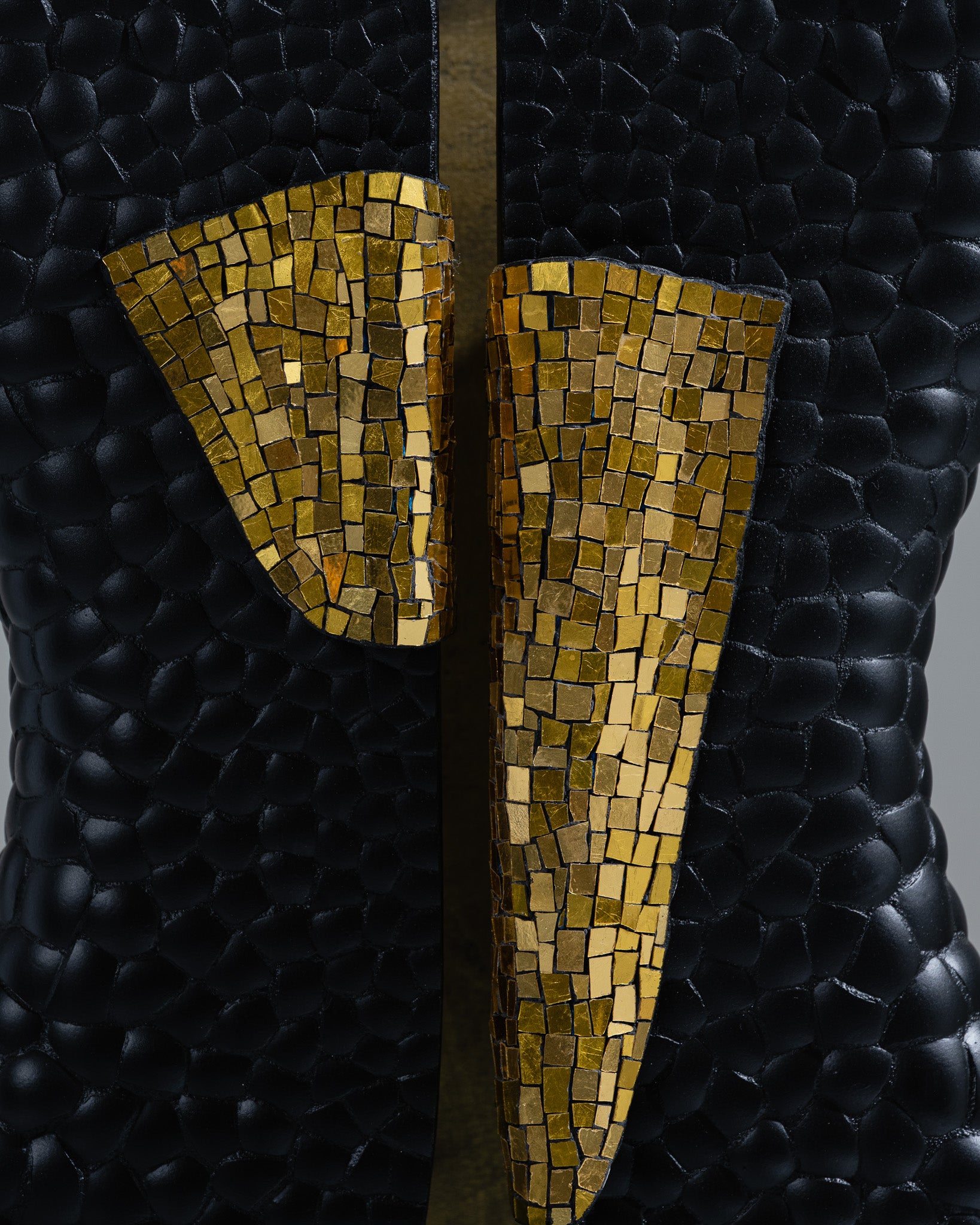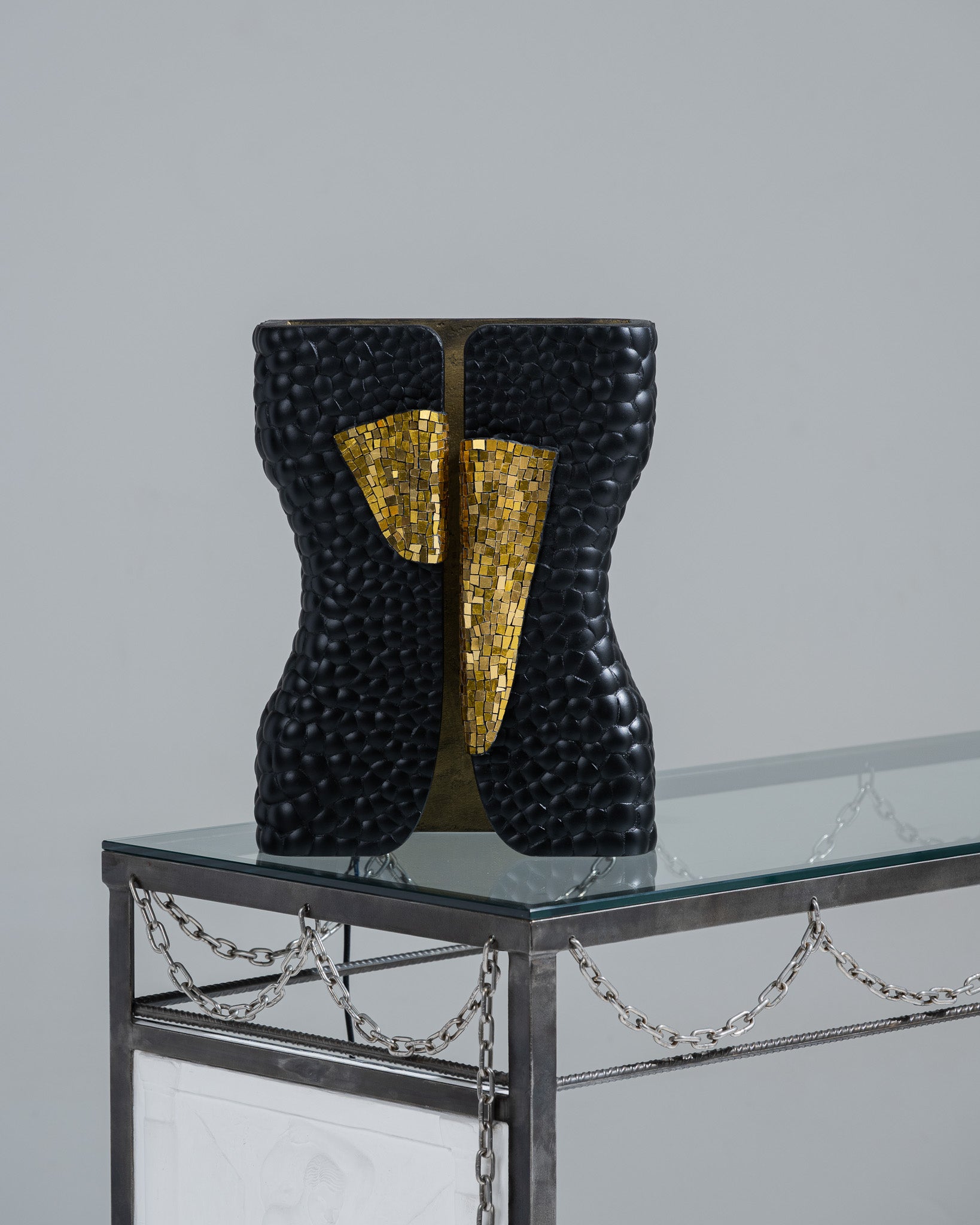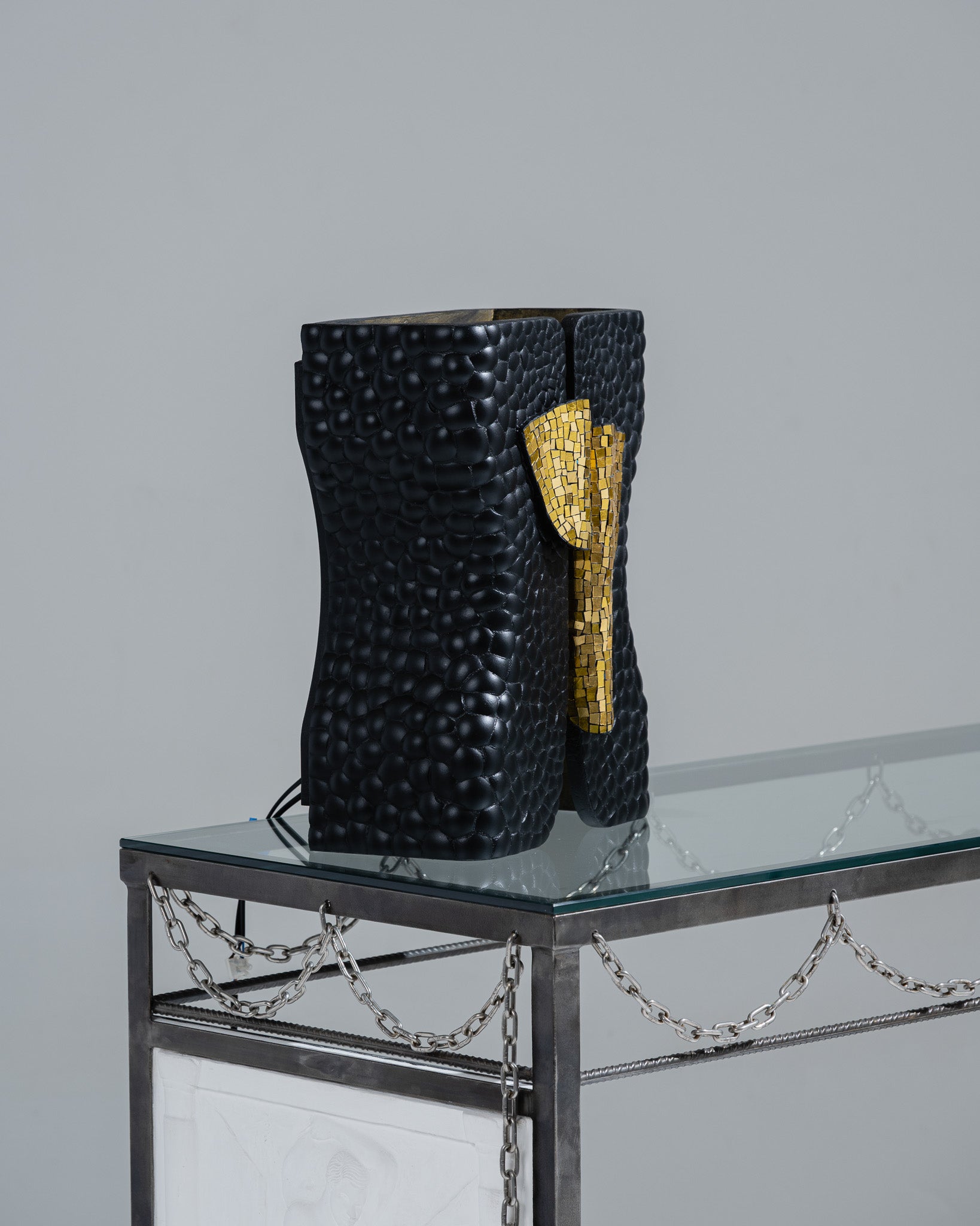 Lampe à poser issue de la collection Smok de Studio Karen B, en collaboration avec l’Atelier Nathalie Chaulaic. Sa silhouette s’inspire du smoking féminin imaginé par Yves Saint Laurent, habillée de tesselles de mosaïque en pâte de verre dorée et d’éclats de coquilles d’œufs, l’intérieur reçoit une patine laiton qui intensifie la luminosité et le contraste.