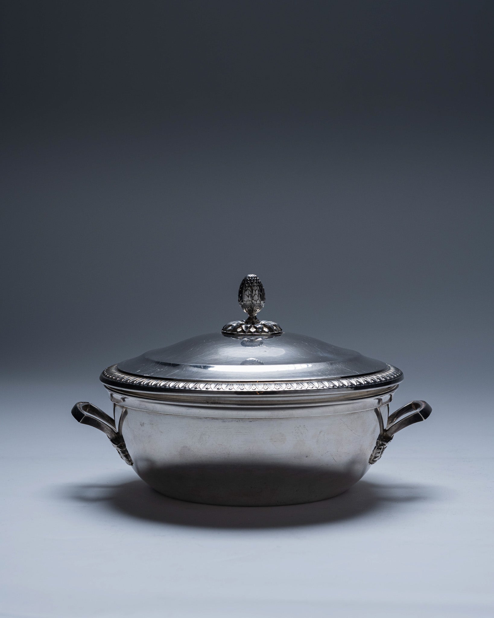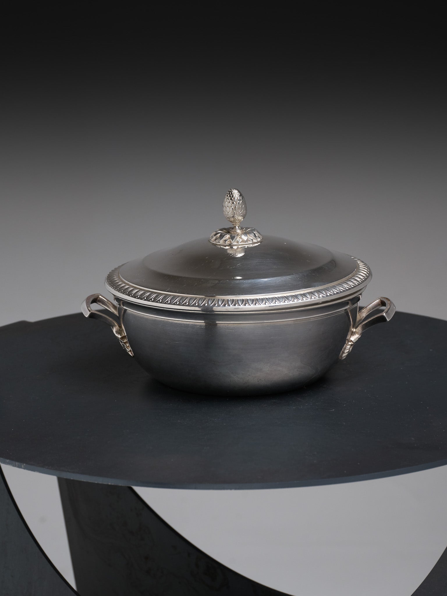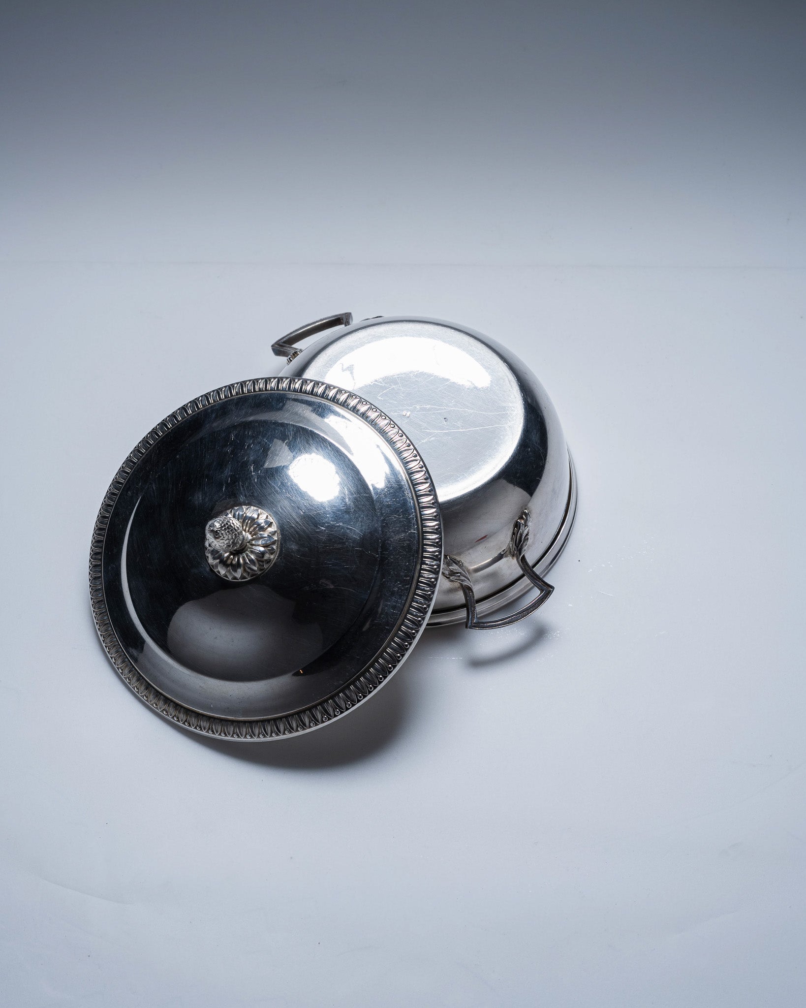 Légumier en métal argenté de forme circulaire, travail des années 1970. Présente des anses au décor de feuille. Couvercle assorti, souligné d'une frise de feuille d'acanthe muni d'un bouton central en forme de pomme de pin sur un piédouche surmontant un ensemble de feuillage à deux étages. Poinçonné sous la base.