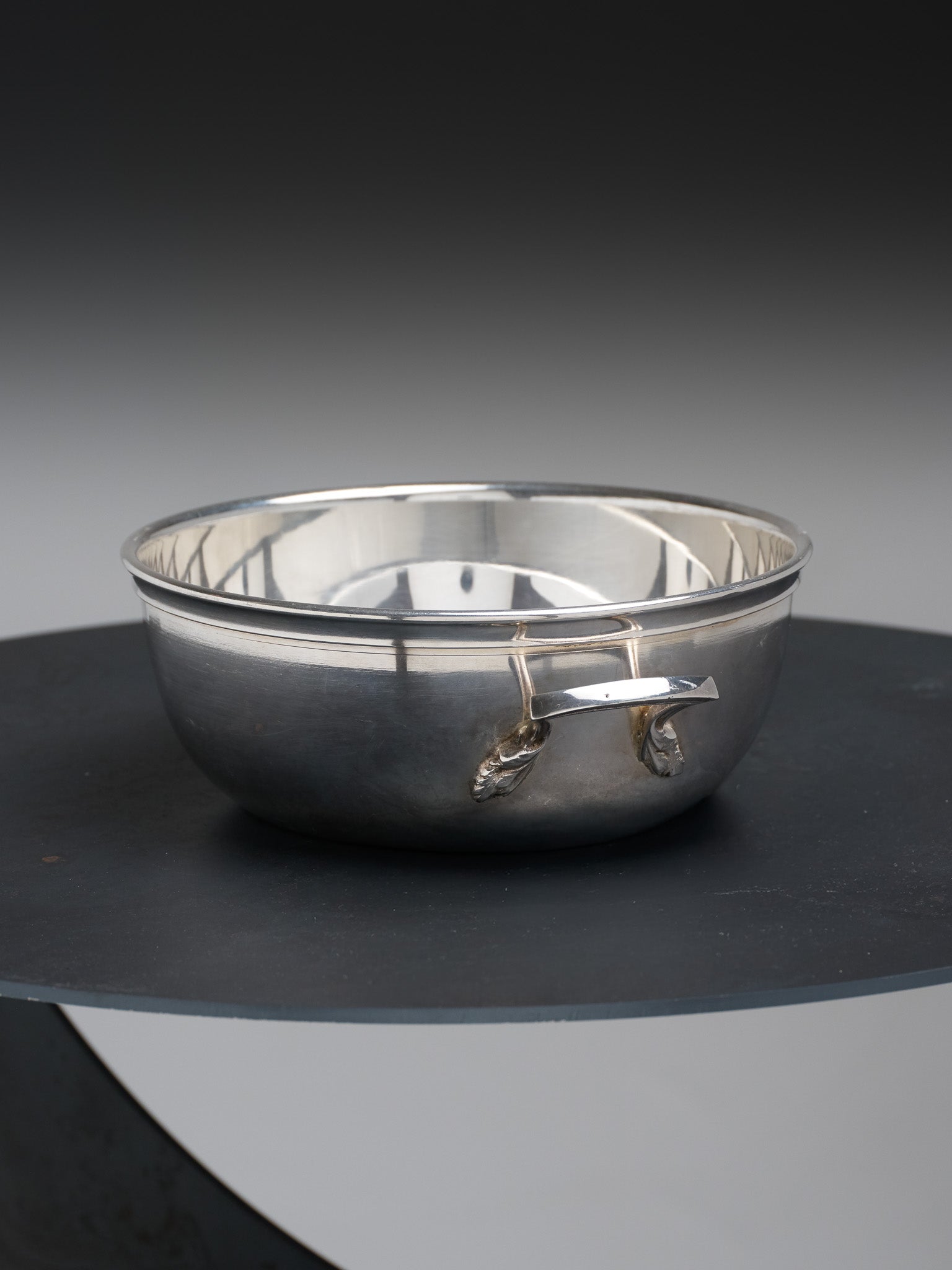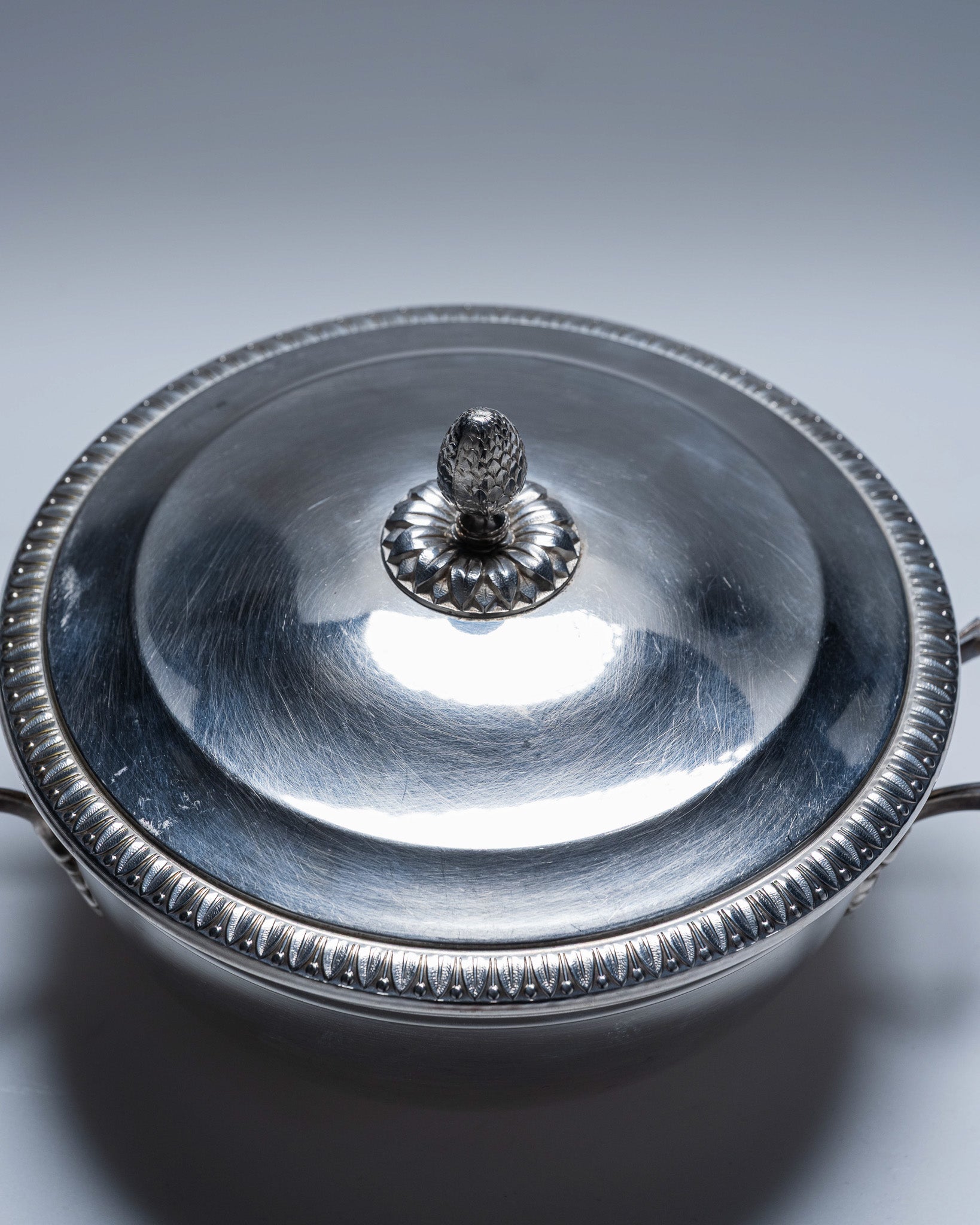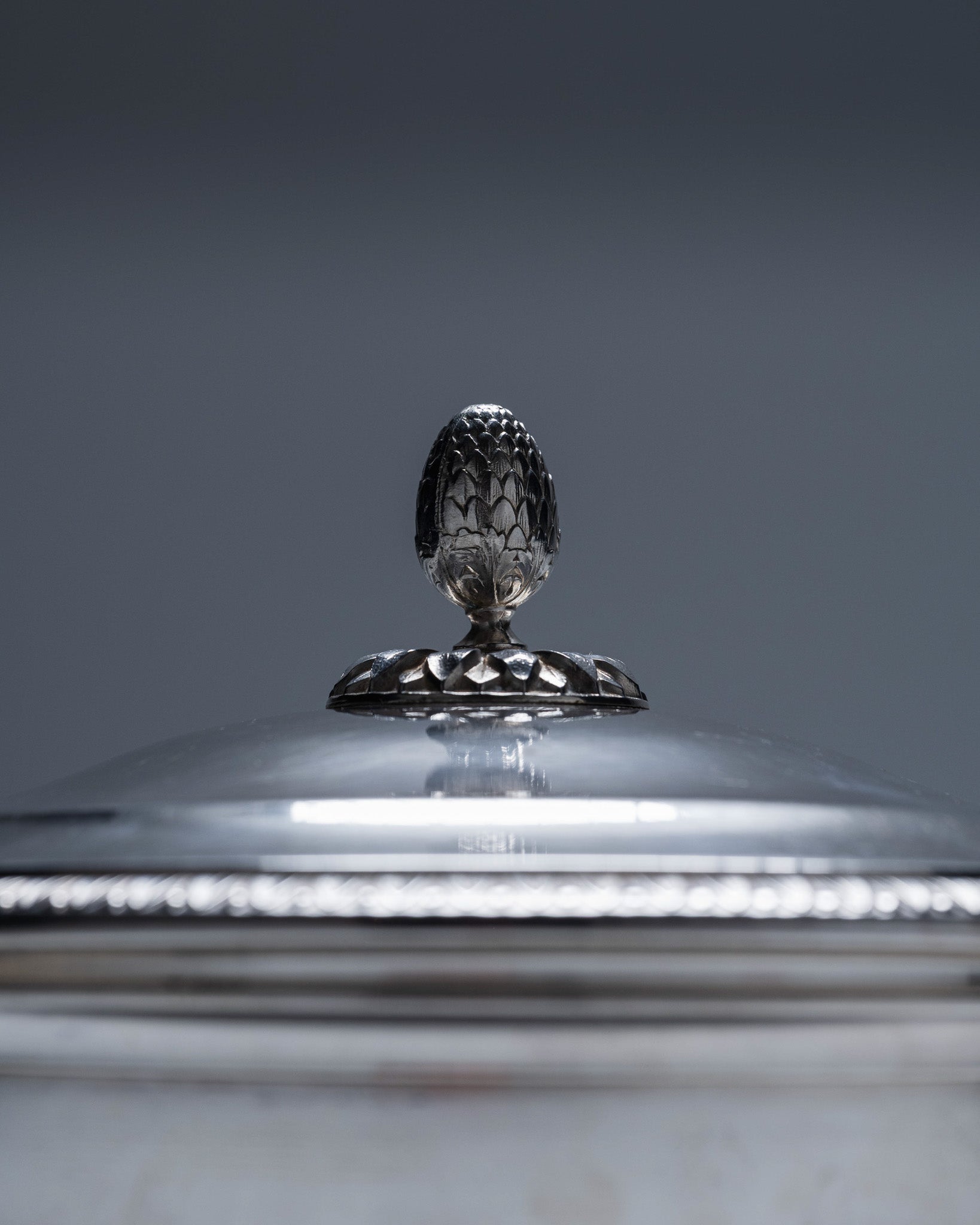 Légumier en métal argenté de forme circulaire, travail des années 1970. Présente des anses au décor de feuille. Couvercle assorti, souligné d'une frise de feuille d'acanthe muni d'un bouton central en forme de pomme de pin sur un piédouche surmontant un ensemble de feuillage à deux étages. Poinçonné sous la base.