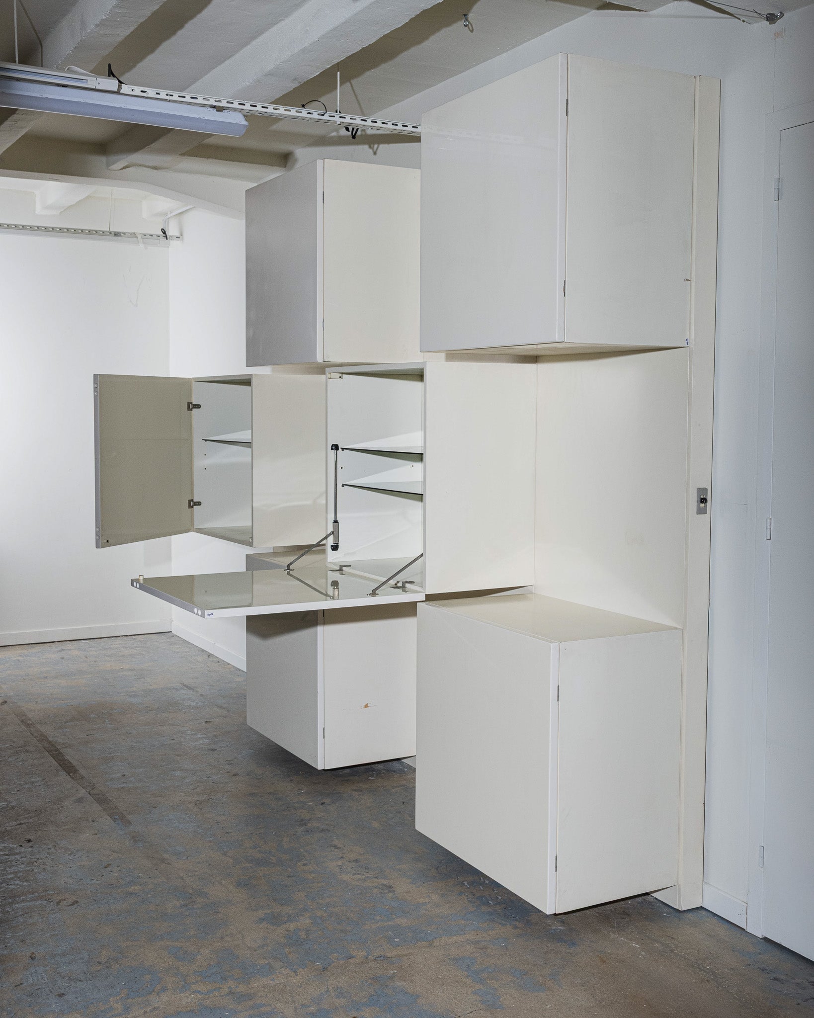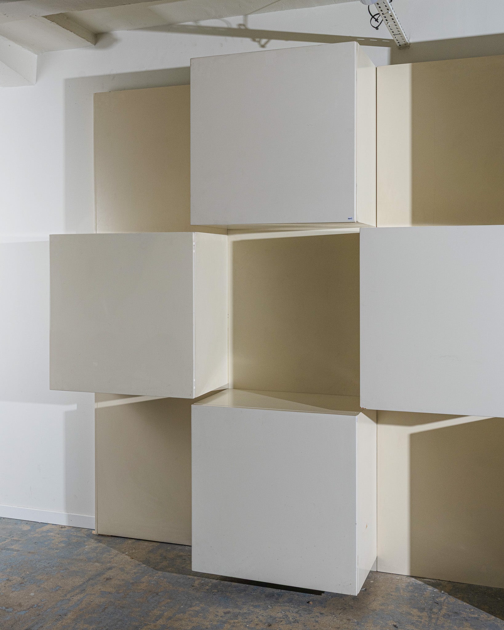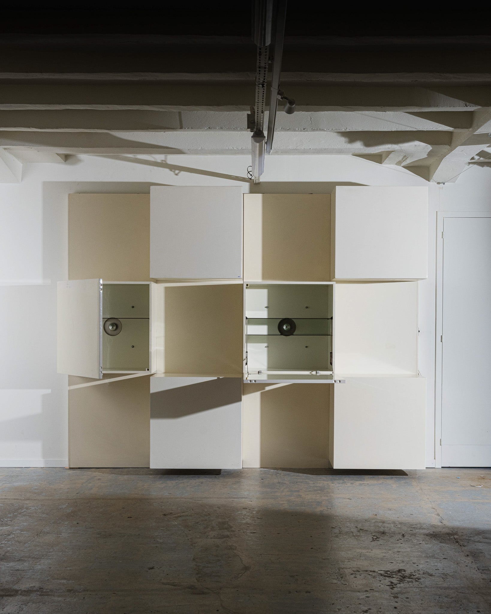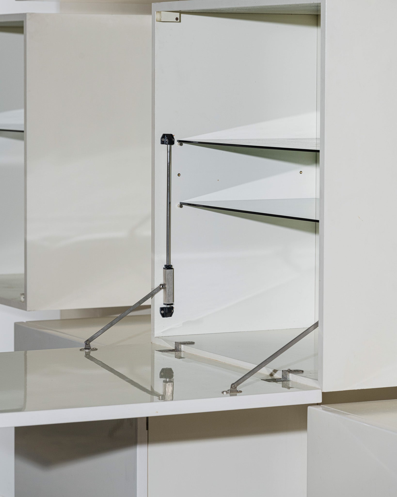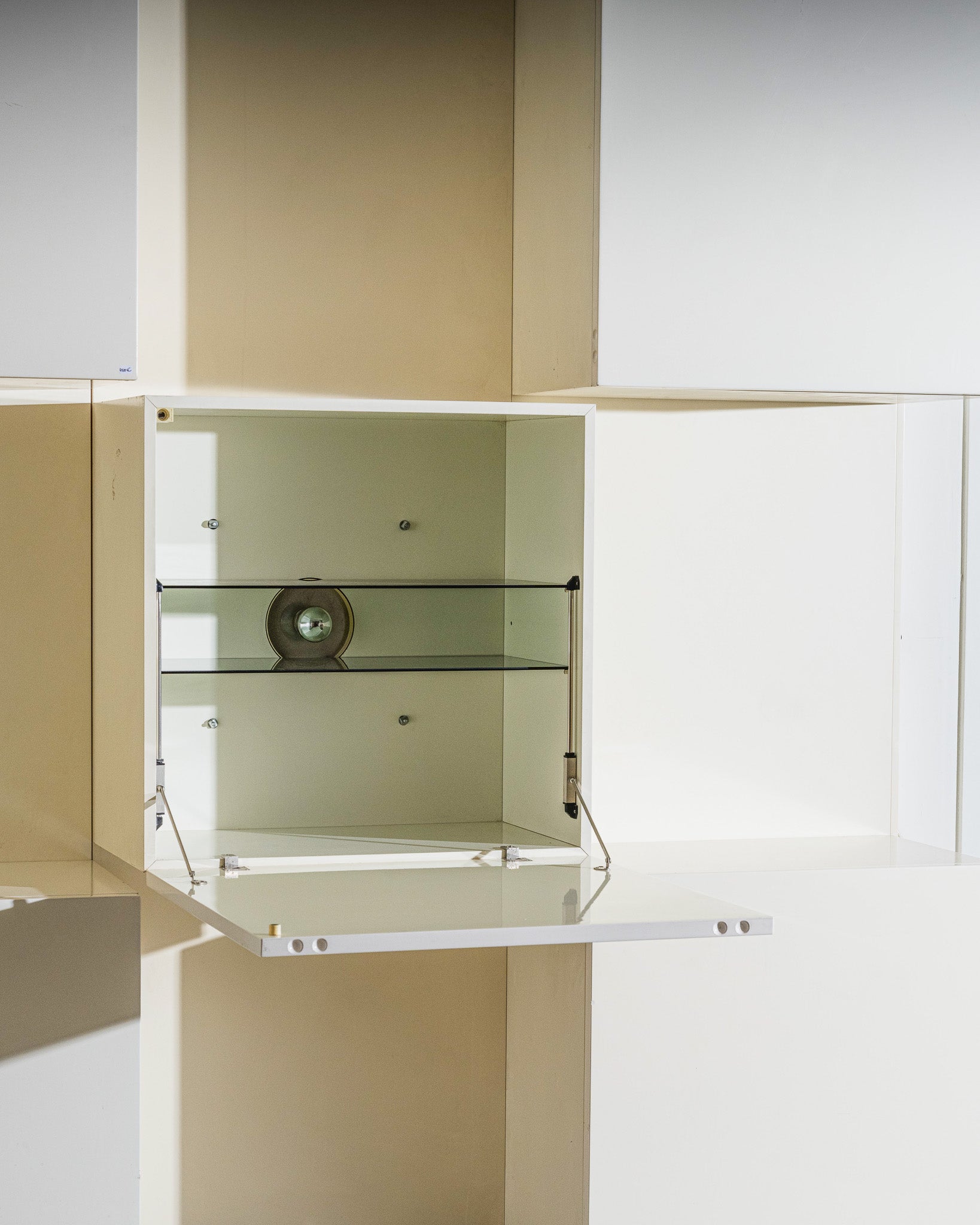 Meuble de rangement modèle Life par Roberto Monsani pour Acerbis dans les années 1970. Ensemble composé de modules cubiques ouverts et fermés. Strcture en panneaux de bois laqué blanc brillant, typique du design italien des années 1970. Bel état général, présente quelques marques conformes à l'âge et l'usage.