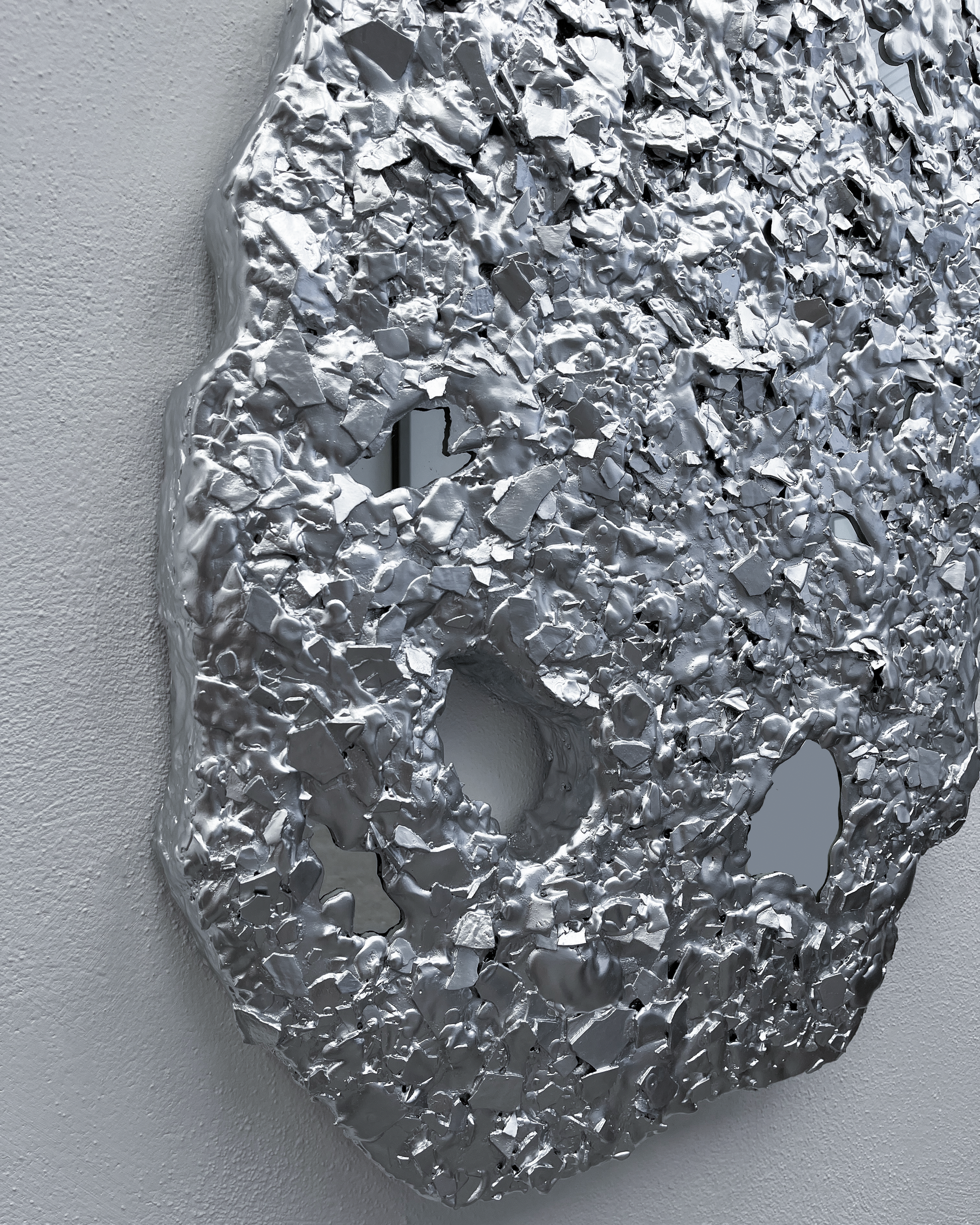 Miroir "FRAN" par l'architecte et designer Paul Hardy. De forme organique, le miroir est conçue en plâtre et sable gris clair, parcemé de morceaux de verre. Le travail de Paul Hardy se distingue par des matériaux de construction détournés tels que le sable, le plâtre, le bois et le verre.