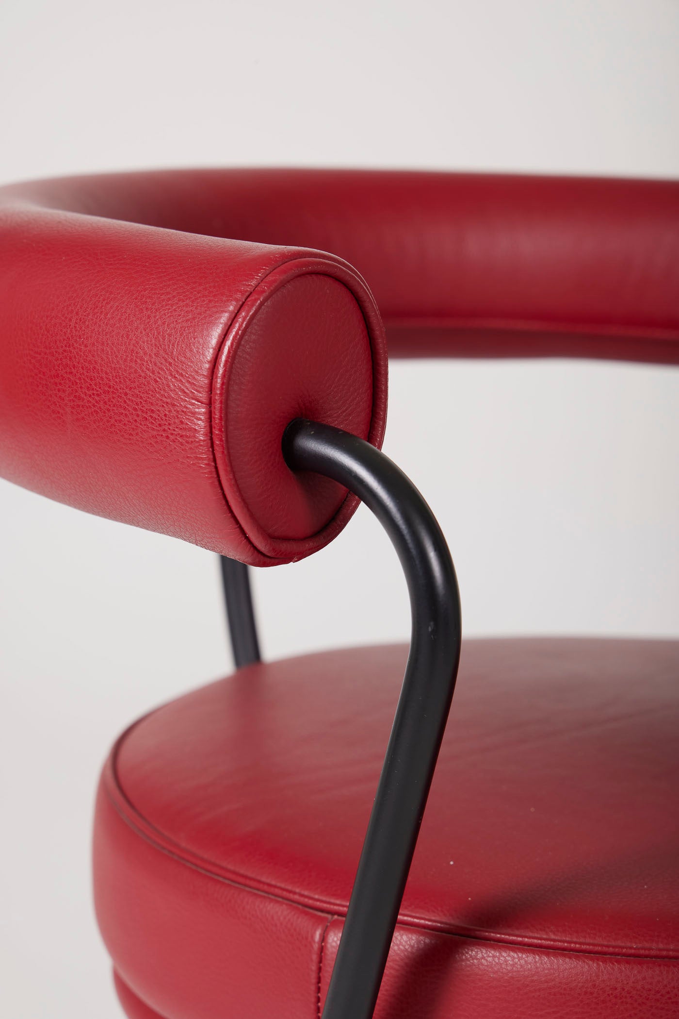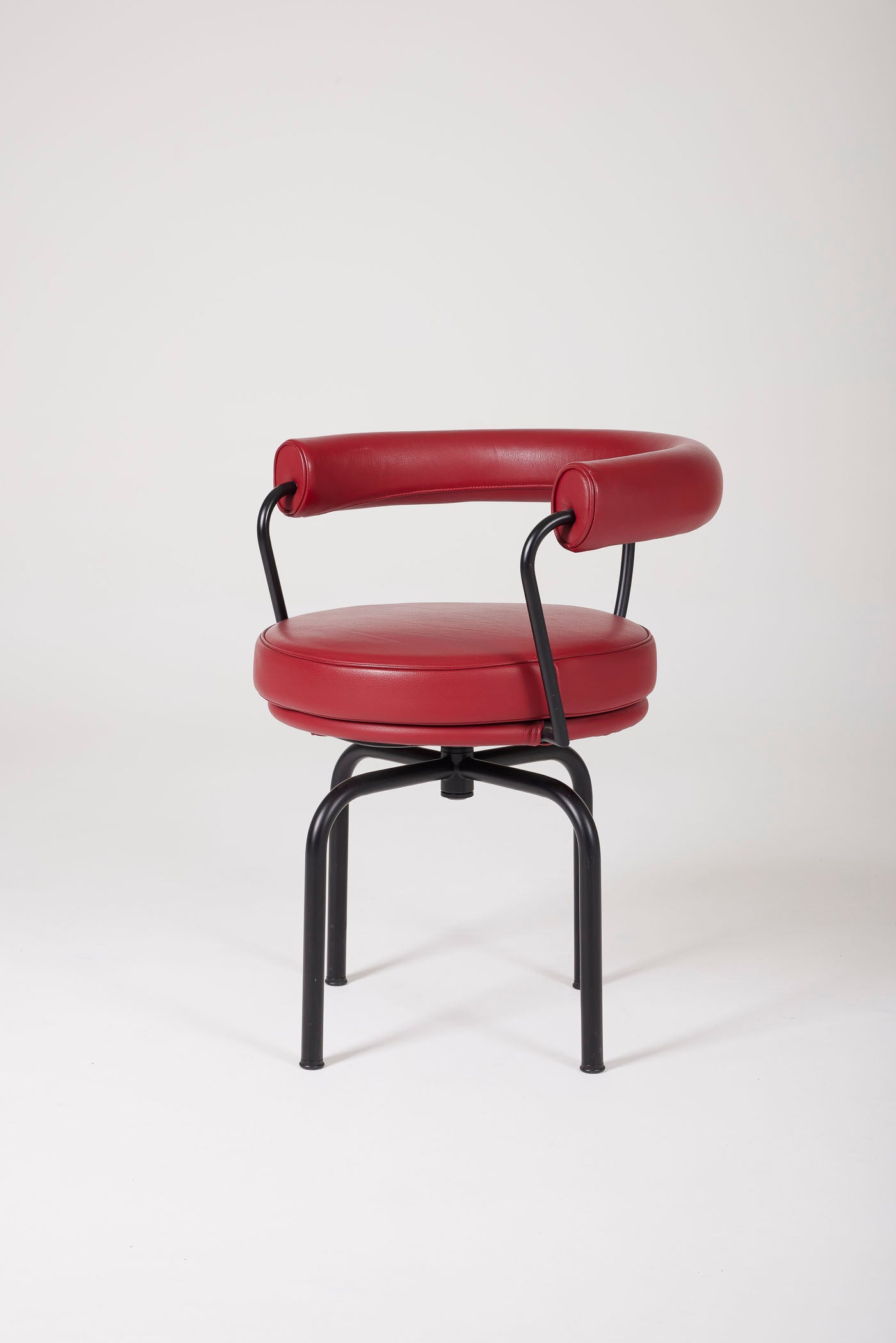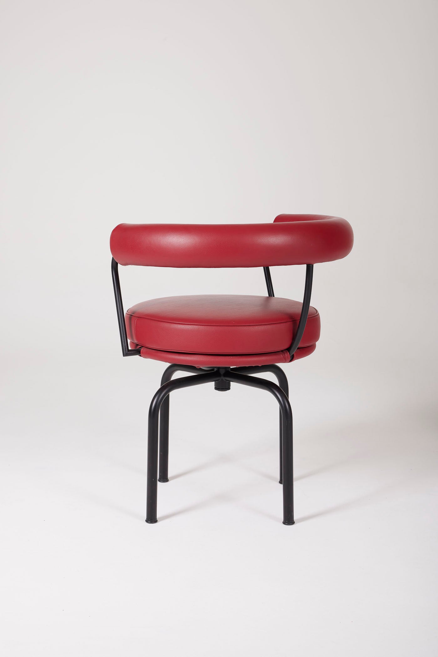 Fauteuil pivotant LC7 du designer Le Corbusier, édition Cassina. Ce modèle a été créé dans les années 1930. Dossier et assise en cuir, structure et piètement en métal laqué noir. Pièce numérotée et signée sur le pied. Très bon état.