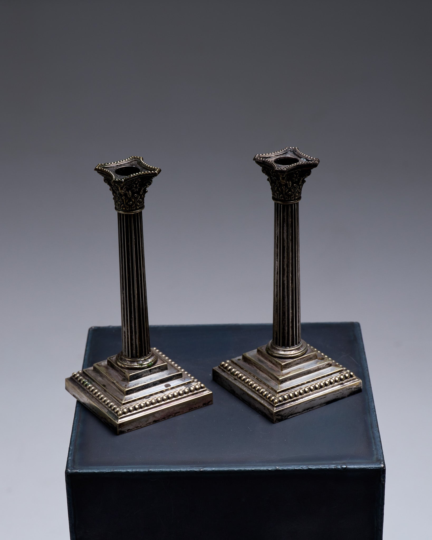Paire de bougeoirs reposant sur une base carrée à degrés, soulignée d'un décor de perles. Fût cannelé de section circulaire, surmonté d'un chapiteau d'inspiration corinthienne finement orné de motifs végétaux stylisés. Bobèche carrée à ouverture circulaire. Travail du milieu du XXe siècle, dans le goût néoclassique.