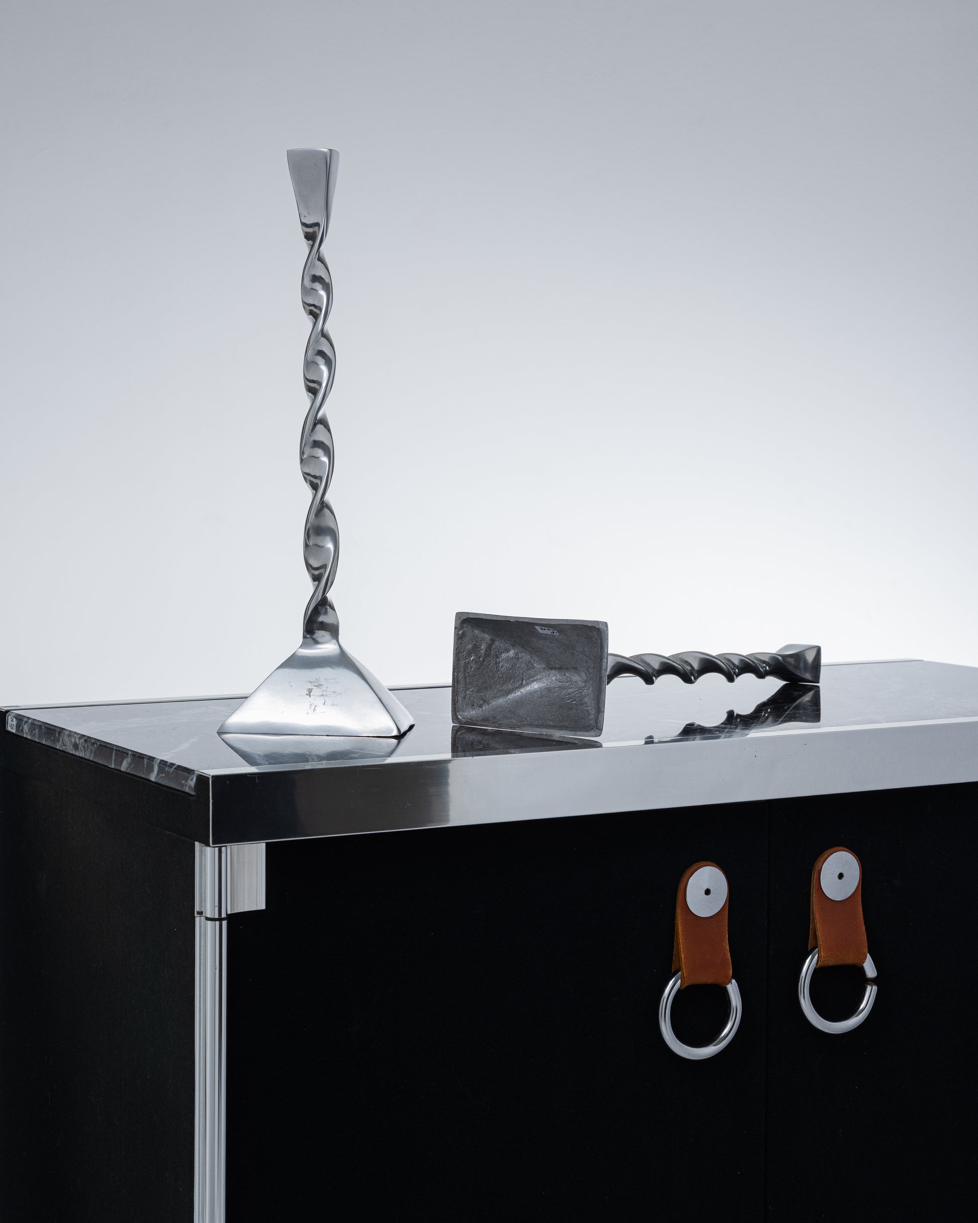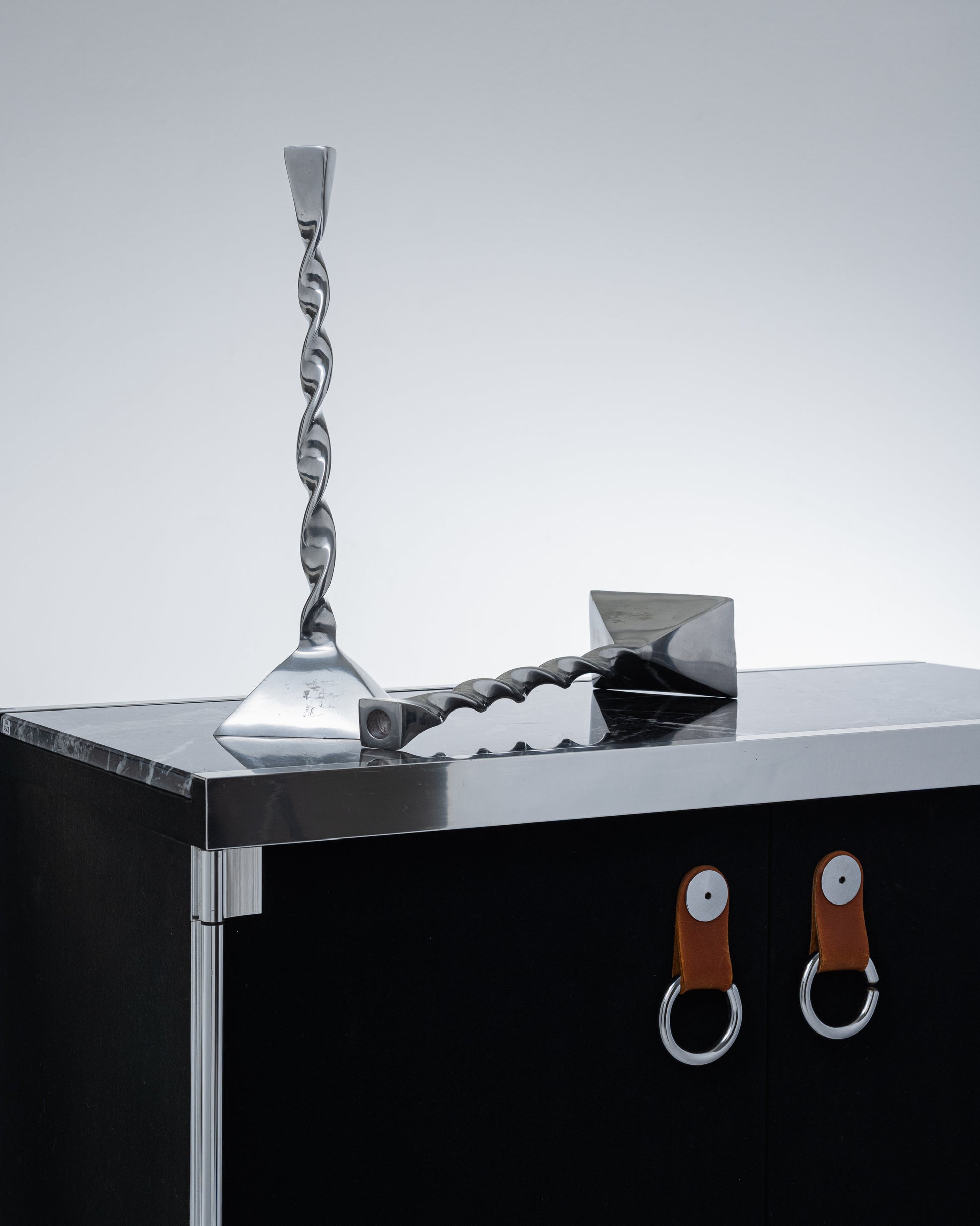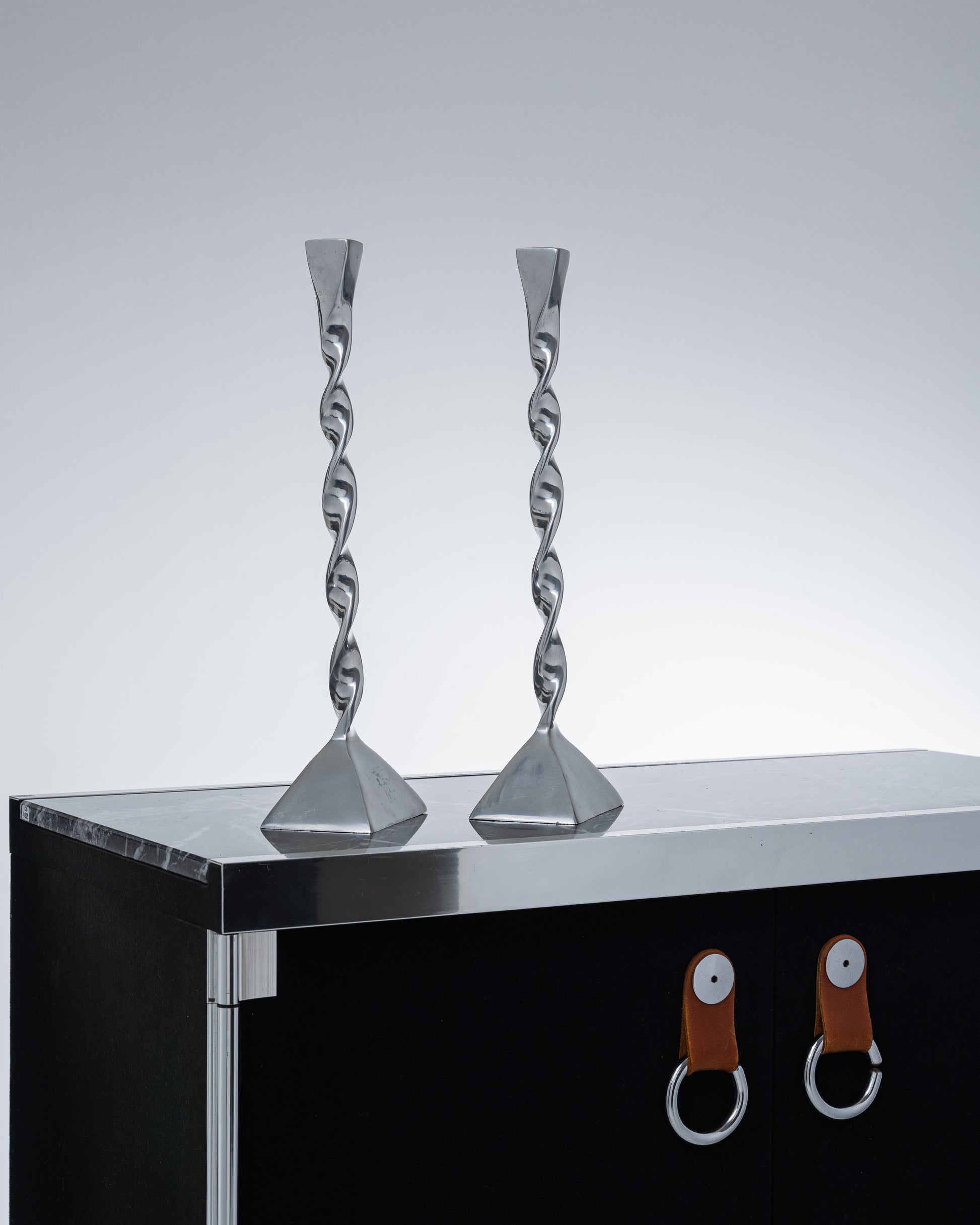 Paire de bougeoirs en métal argenté à forme torsadée, style post-moderne, années 1980. Présente de légères traces d'usure au niveau du piètement. Bel état général.
