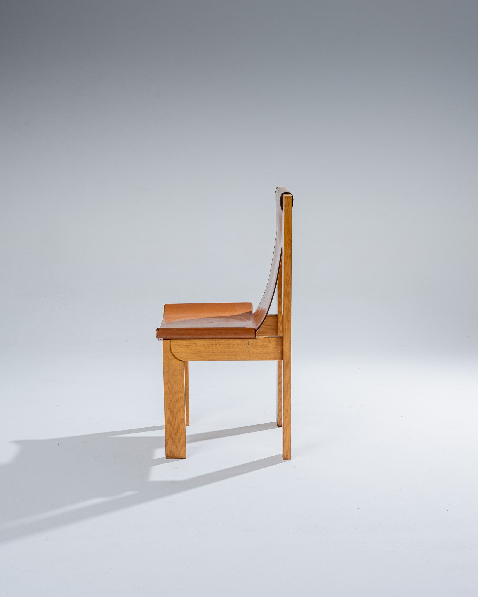 Paire de chaises attribuées à Luigi Gorgoni pour Roche Bobois, années 1970. Structure en orme massif, assise et dossier hauts en cuir pleine fleur marron, tendu sans coutures apparentes. Lignes épurées et minimalistes, typiques du travail de Gorgoni. Bon état vintage, avec quelques traces d’usage aux angles et patine naturelle du cuir.