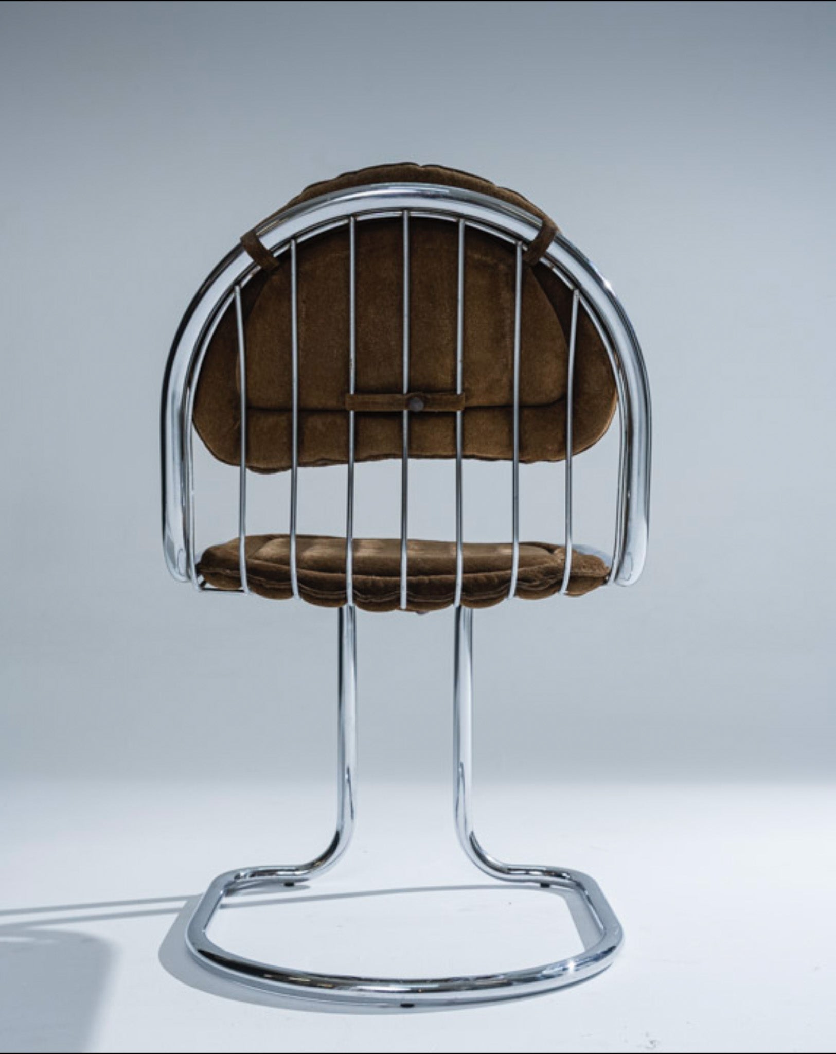Paire de chaises en métal et velours conçue par Gastone Rinaldi pour RIMA dans les années 1970. Sa structure en fil et tube d’acier chromé lui donne une silhouette moderne et légère, typique de l'esthétique des années 70.