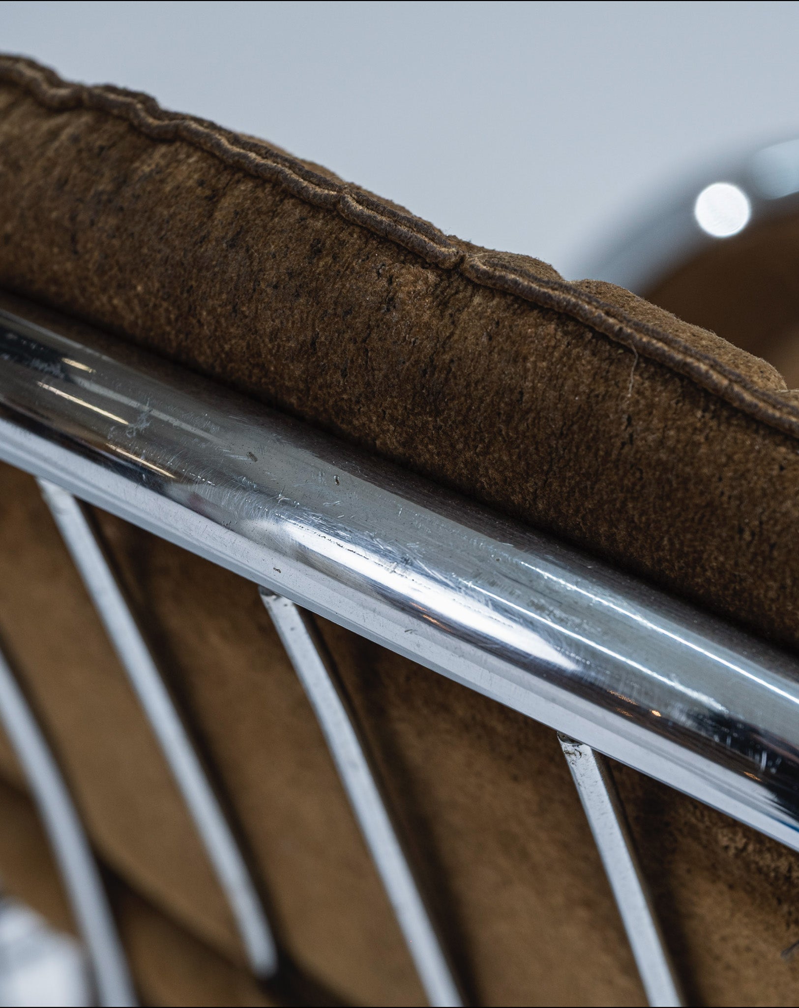 L’assise et le dossier en velours présentent quelques traces d'usage, une légère oxydation du métal est à noter sur la structure.