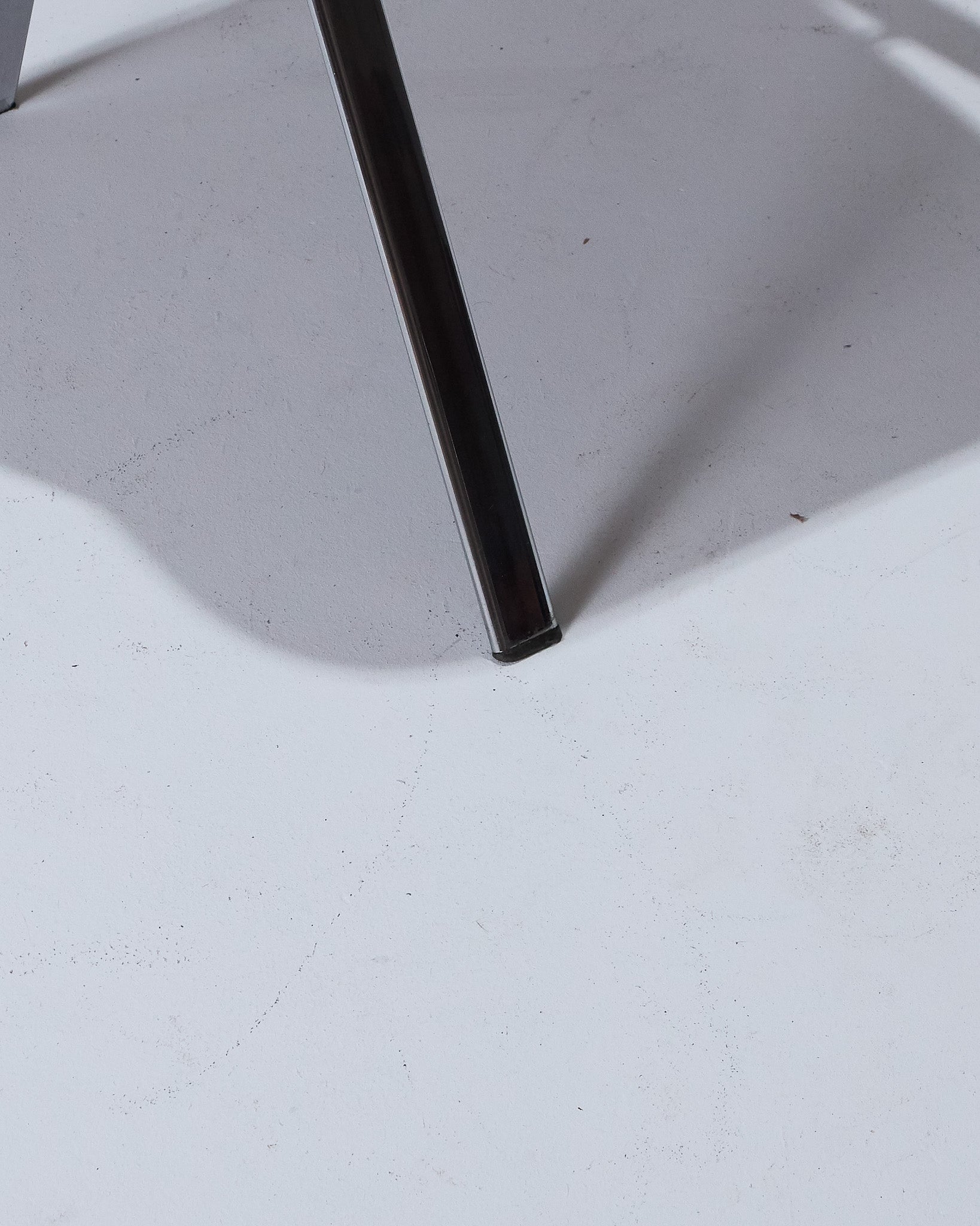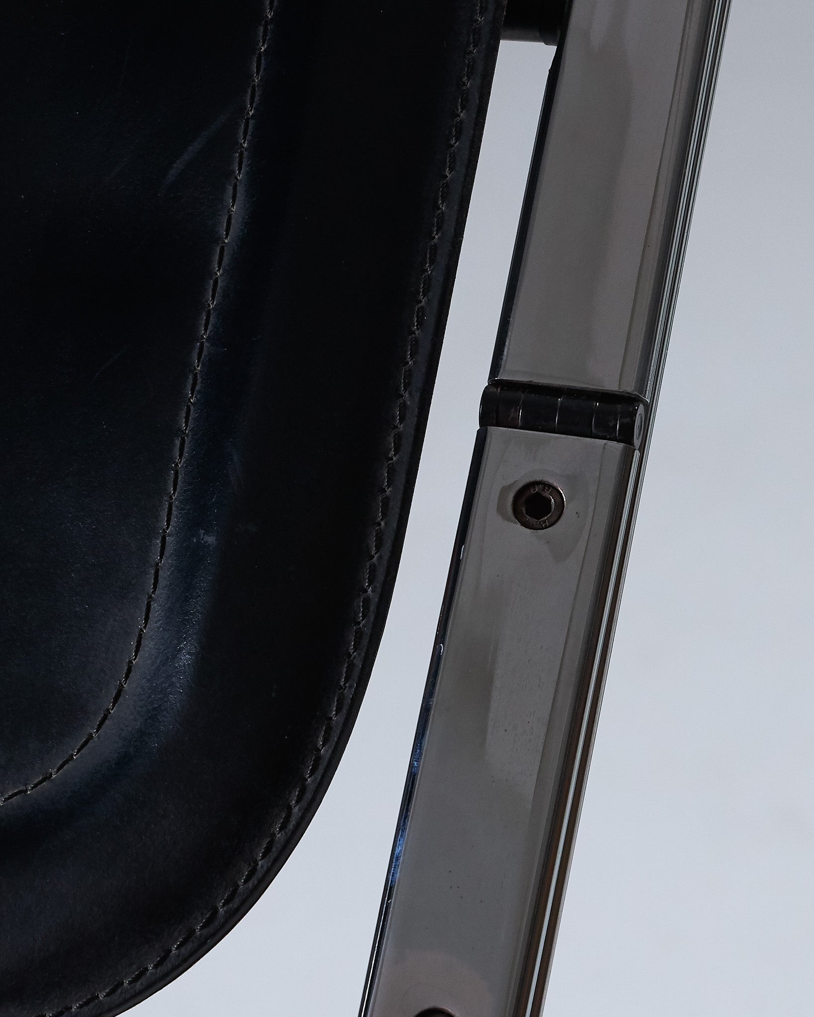 Paire de chaises pliantes, modèle Clio, dessinées par le designer italien Giorgio Cattelan et éditée par Cidue dans les années 1970. Structure en tube d’acier aplati, formant un piétement traîneau. Assise et dossier en cuir noir. Étiquetée Cidue au-dessous. Très bel état général.