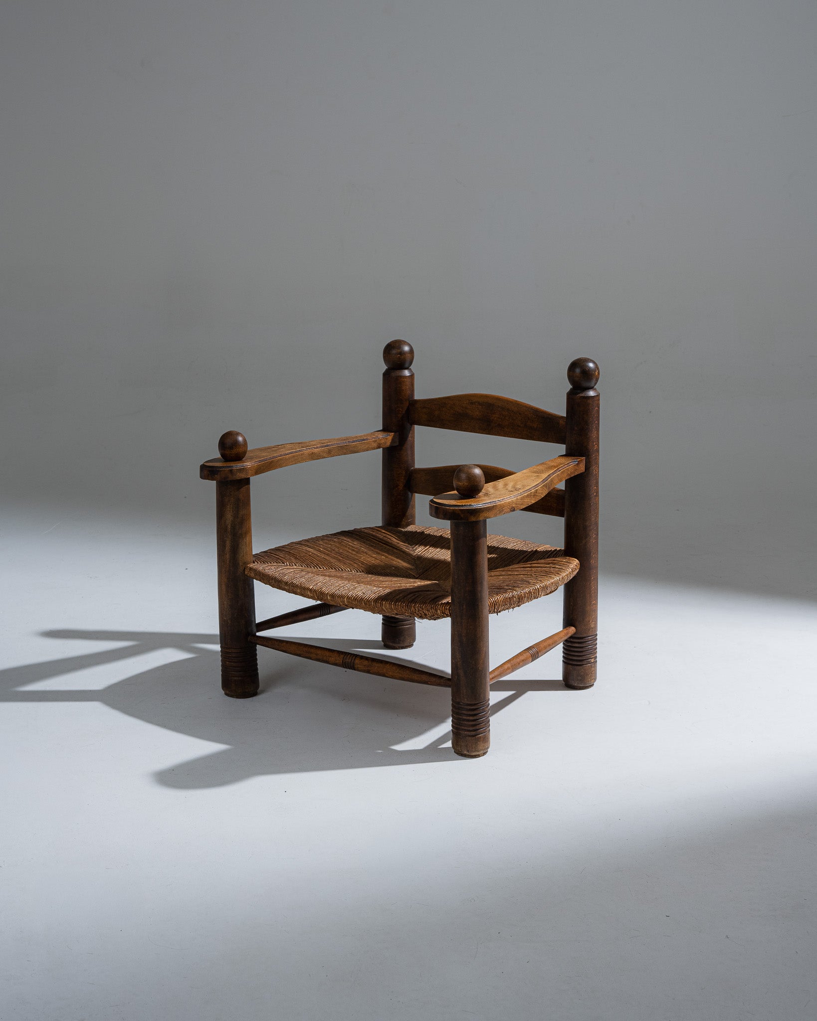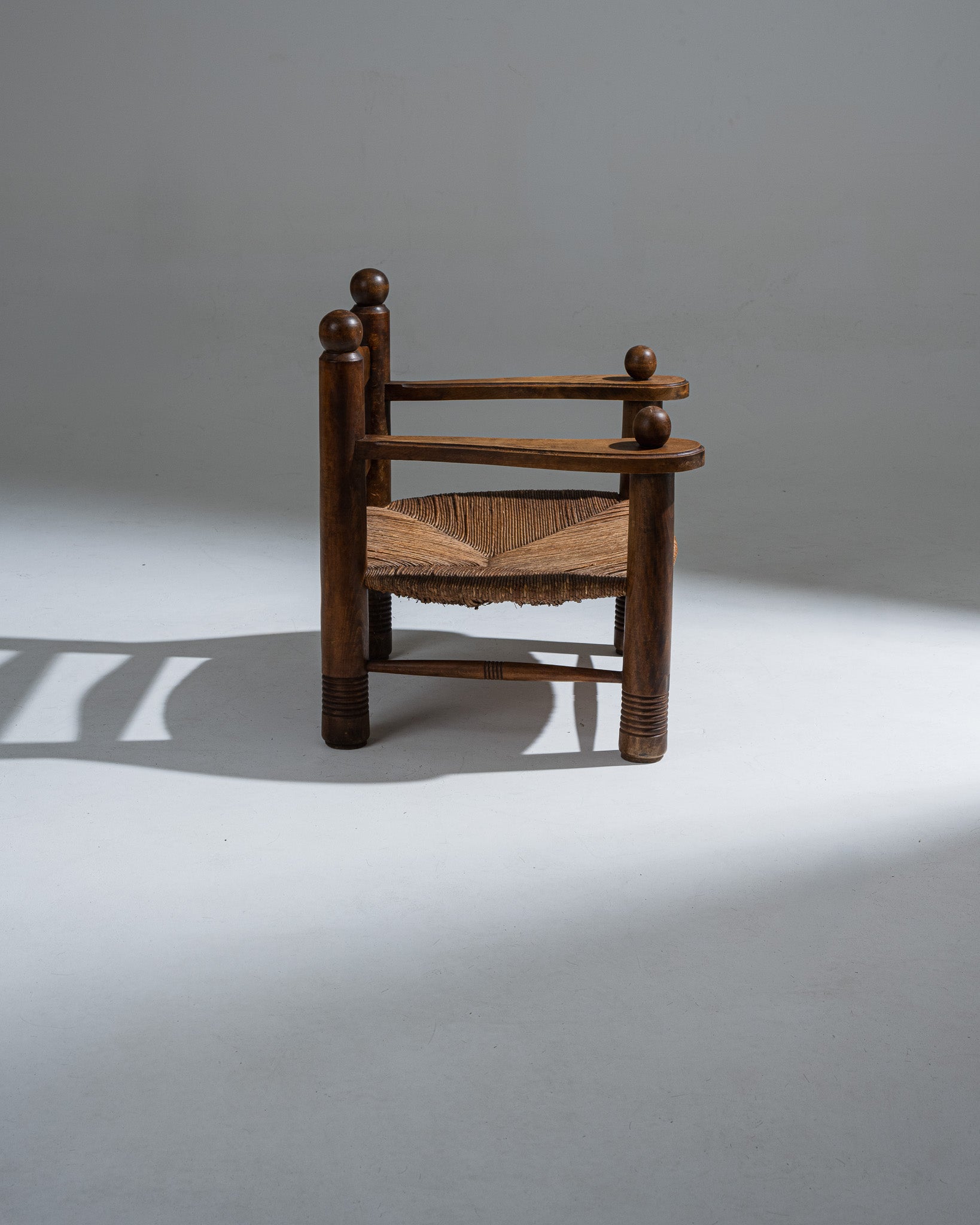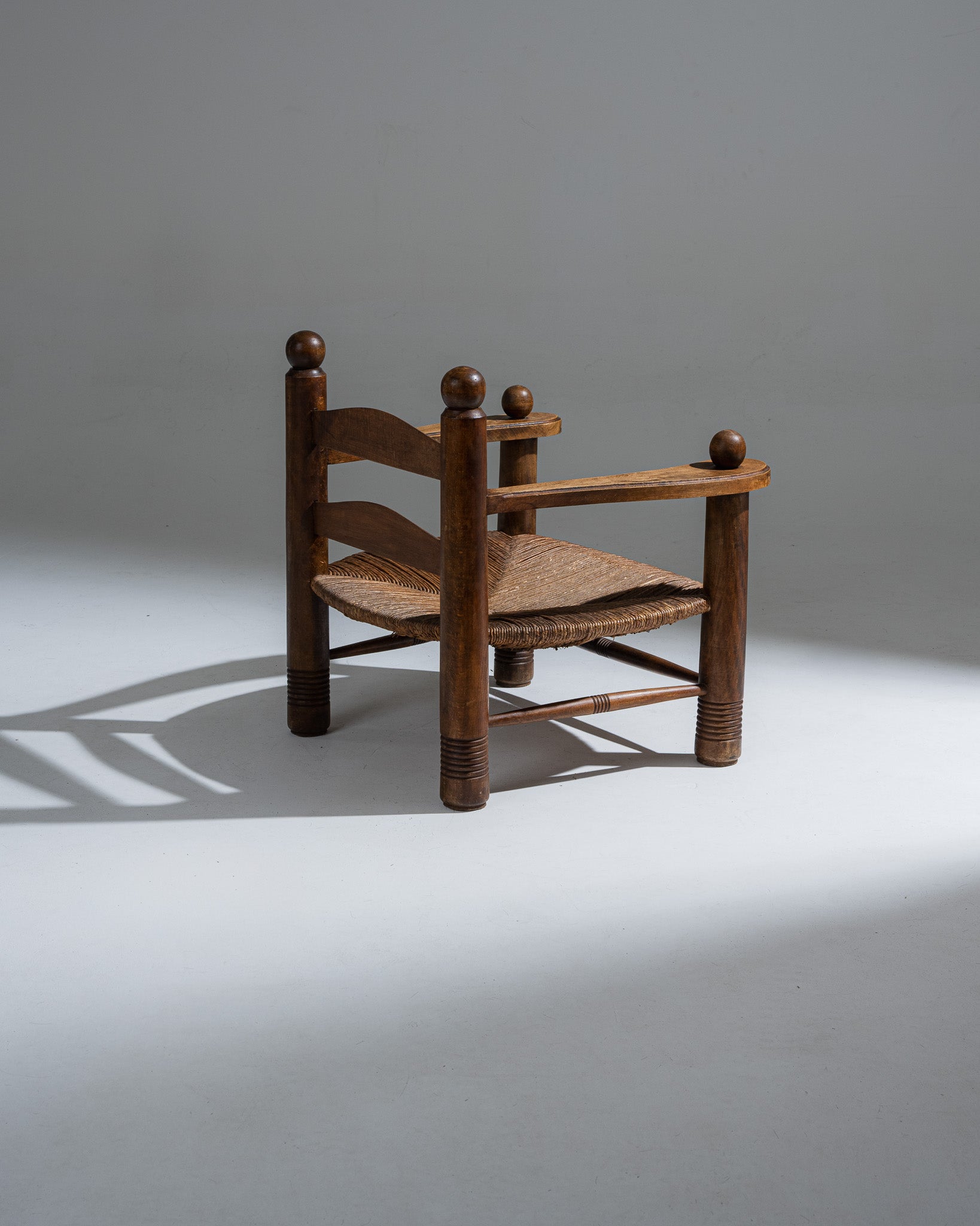 Paire de fauteuils en bois sculpté de Charles Dudouyt, accotoirs arrondis terminés par des boules tournées. Assise large en corde tressée, de forme trapézoïdale, entièrement réalisée à la main. Structure massive à montants cylindriques, travail artisanal des années 1930.