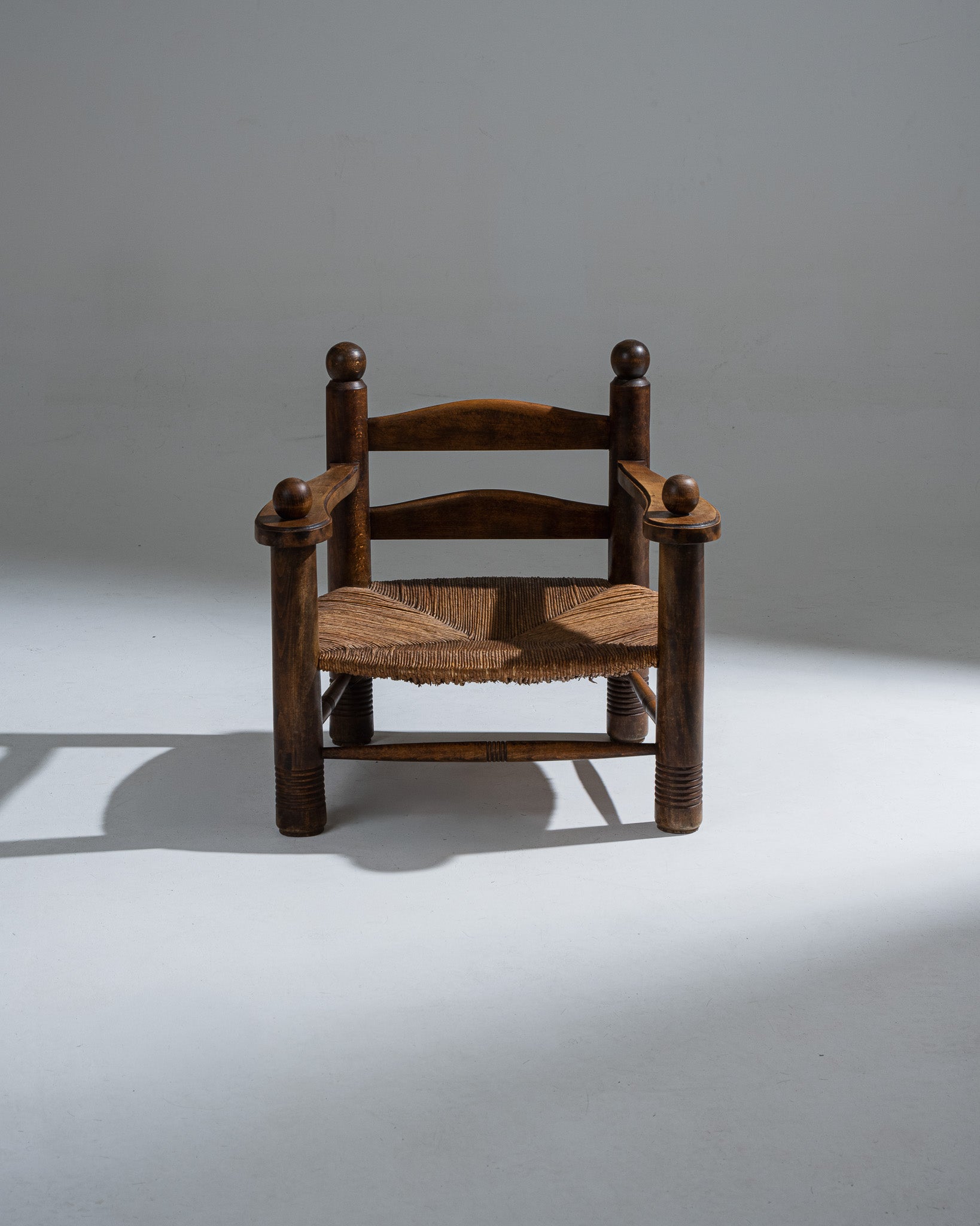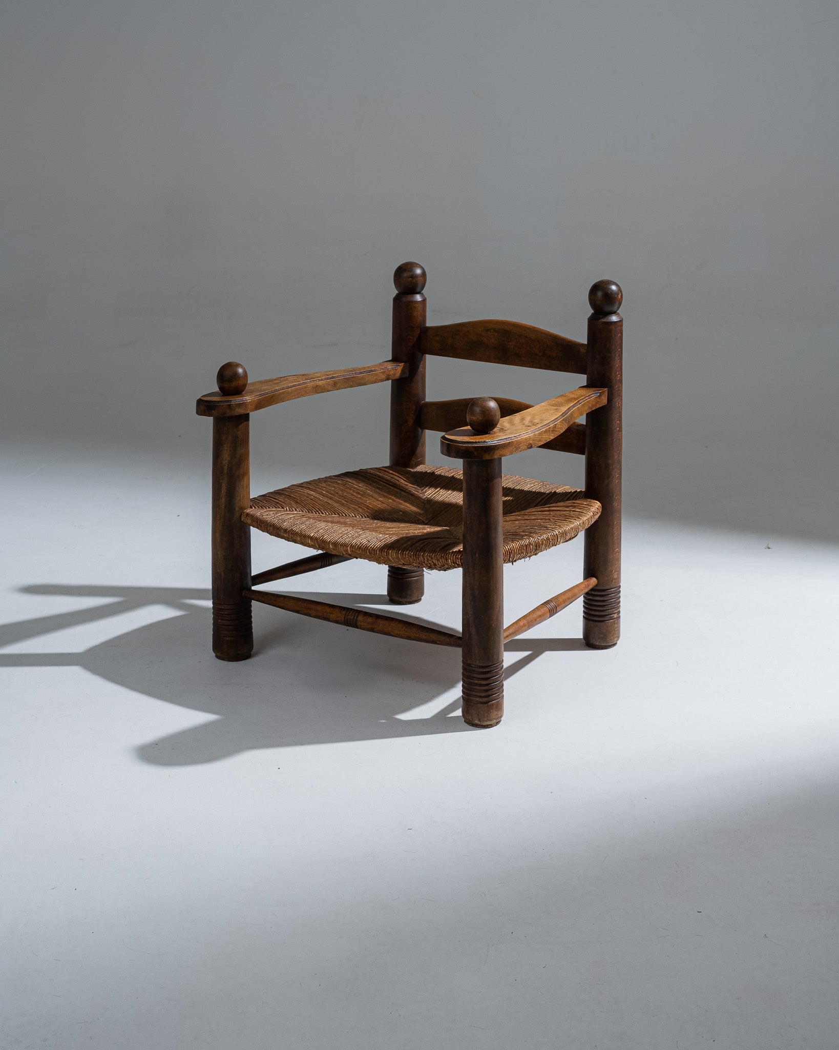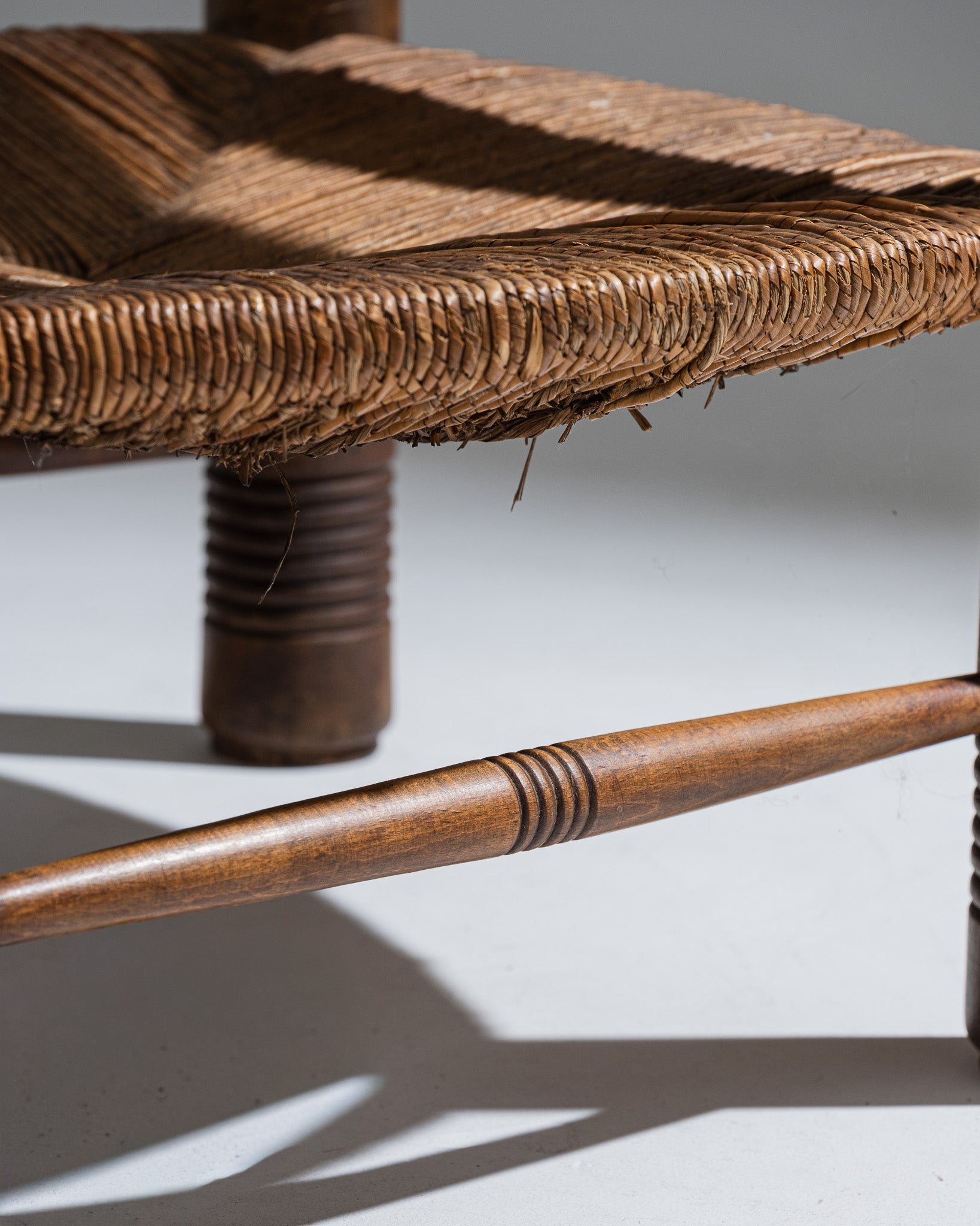 Bel état général avec une patine du bois conforme à l'âge et à l'usage. À noter, la paille présente un léger desserrement, sans nuire à la stabilité de l’assise.