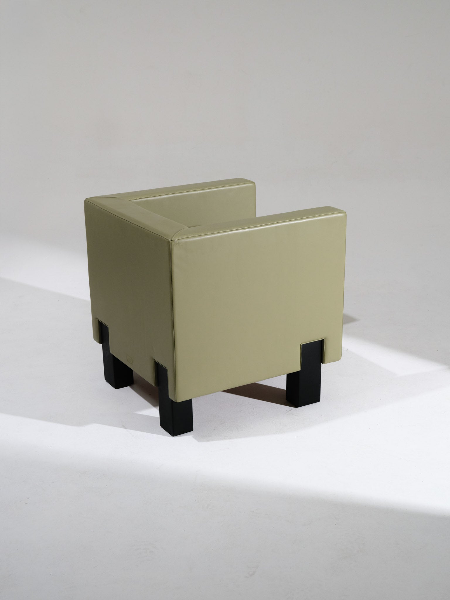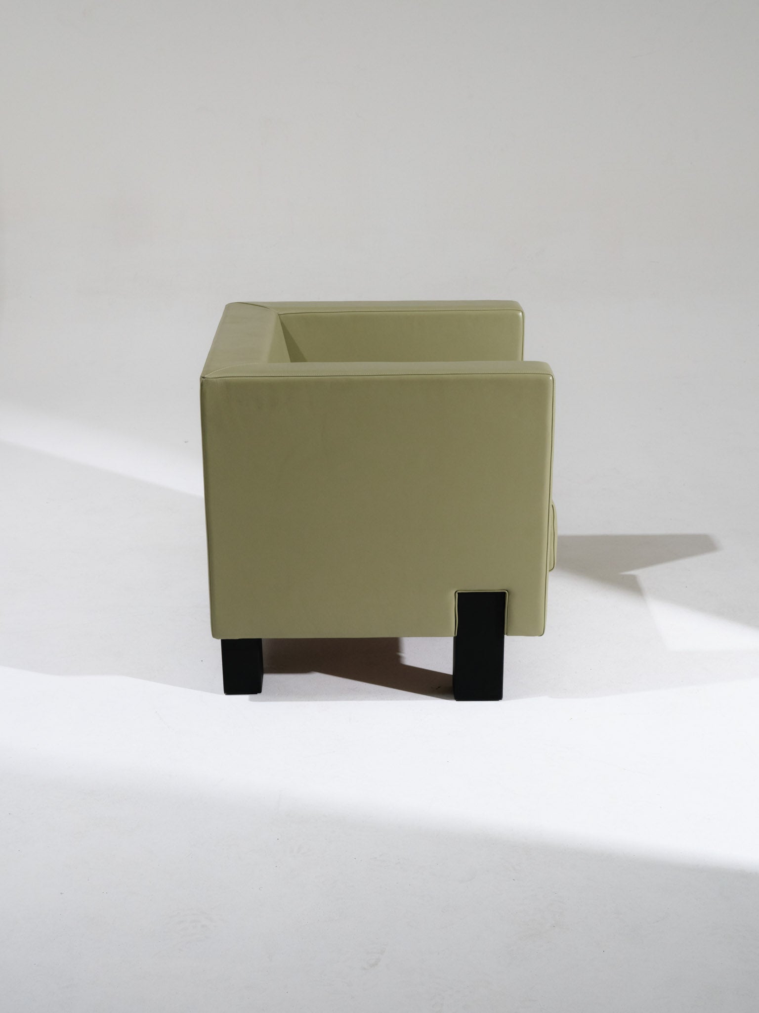 Paire de fauteuils Mojo dessiné par Shigeru Uchida pour Poltrona Frau dans les années 1990. Structure cubique en bois et cuir vert céladon, typique du design minimaliste japonais associé au savoir-faire italien de la maison.