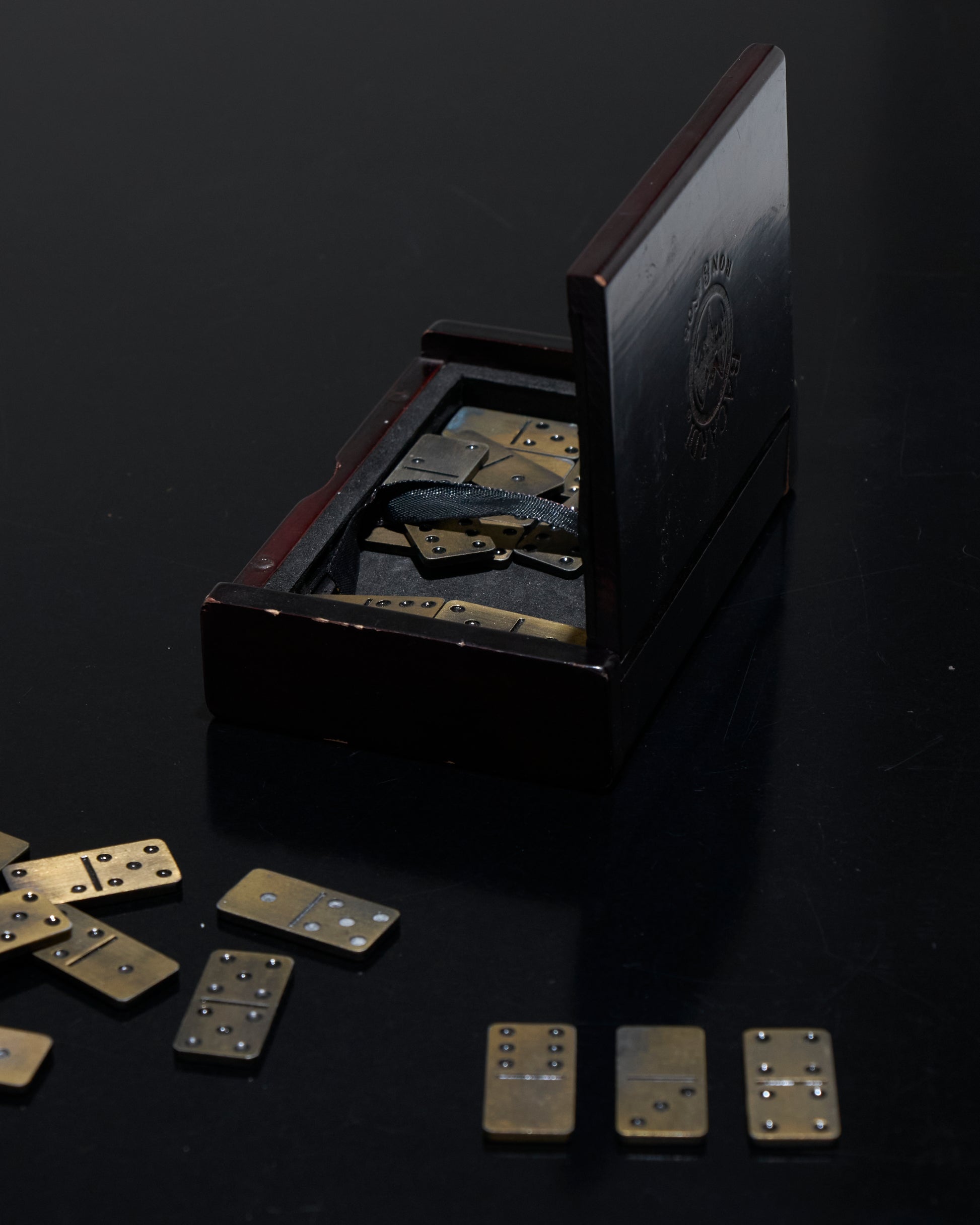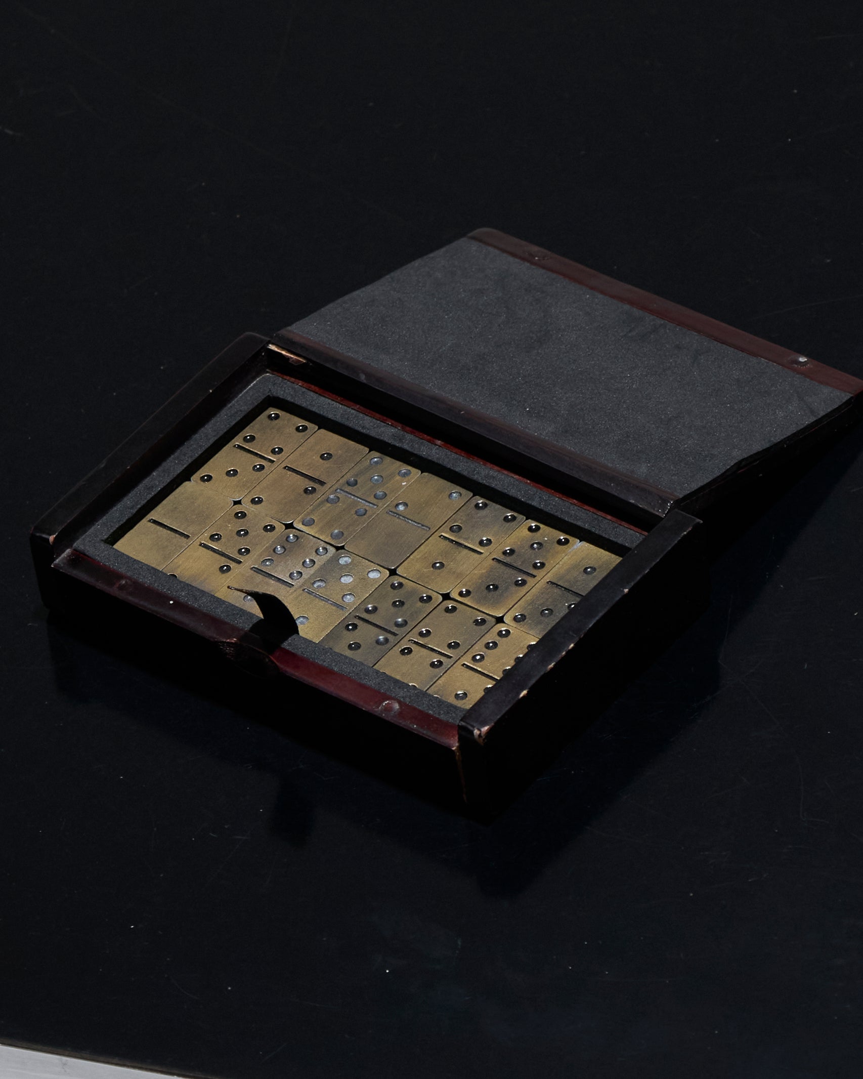 Petit coffret en bois foncé contenant un jeu complet de dominos en métal Bacardi. Les pièces présentent une patine d’époque. Objet publicitaire des années 1980, en bel état vintage.