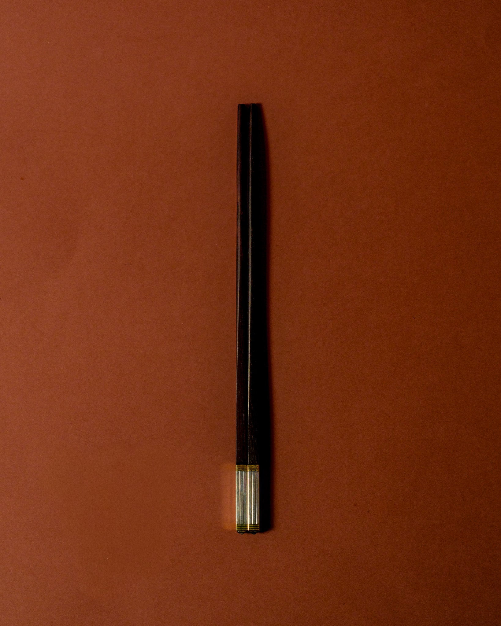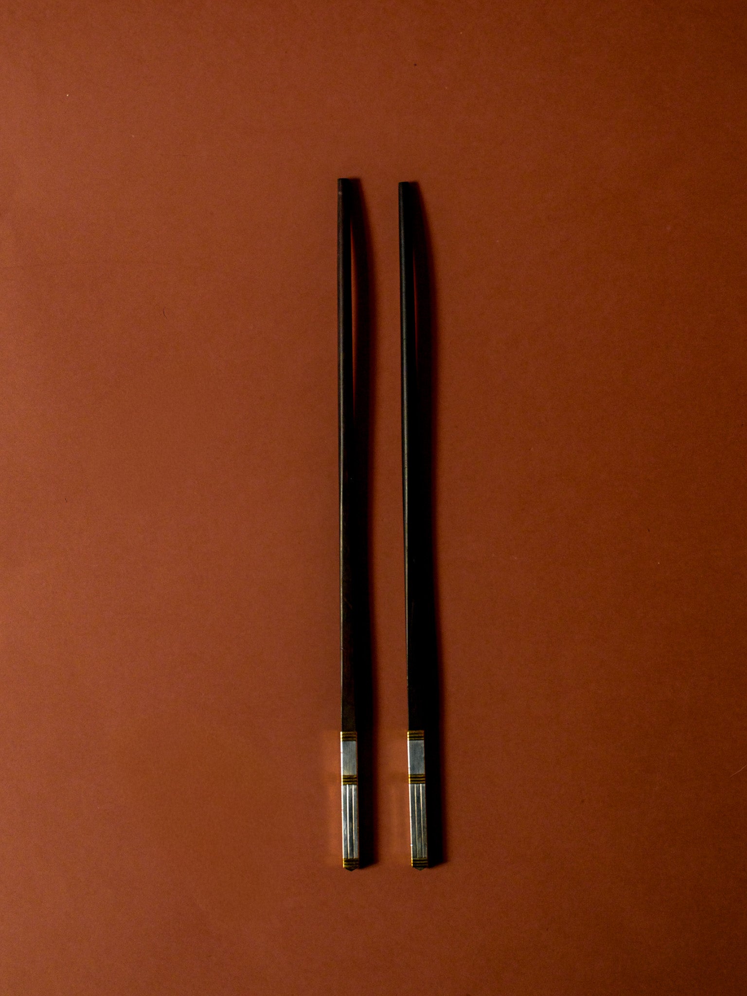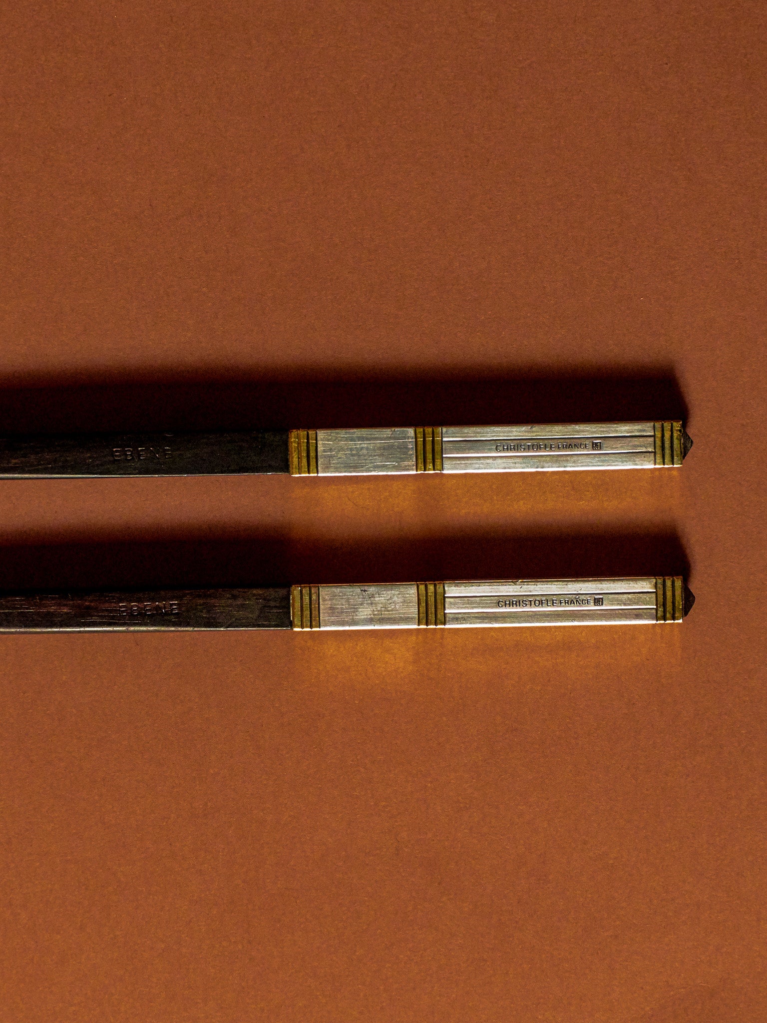 Paire de baguettes japonaises Christofle en bois, ornées d'un embout en métal argenté strié et rehaussé de filets dorés. Modèle signé "Christofle France" sur chaque baguette. Travail des années 1980.