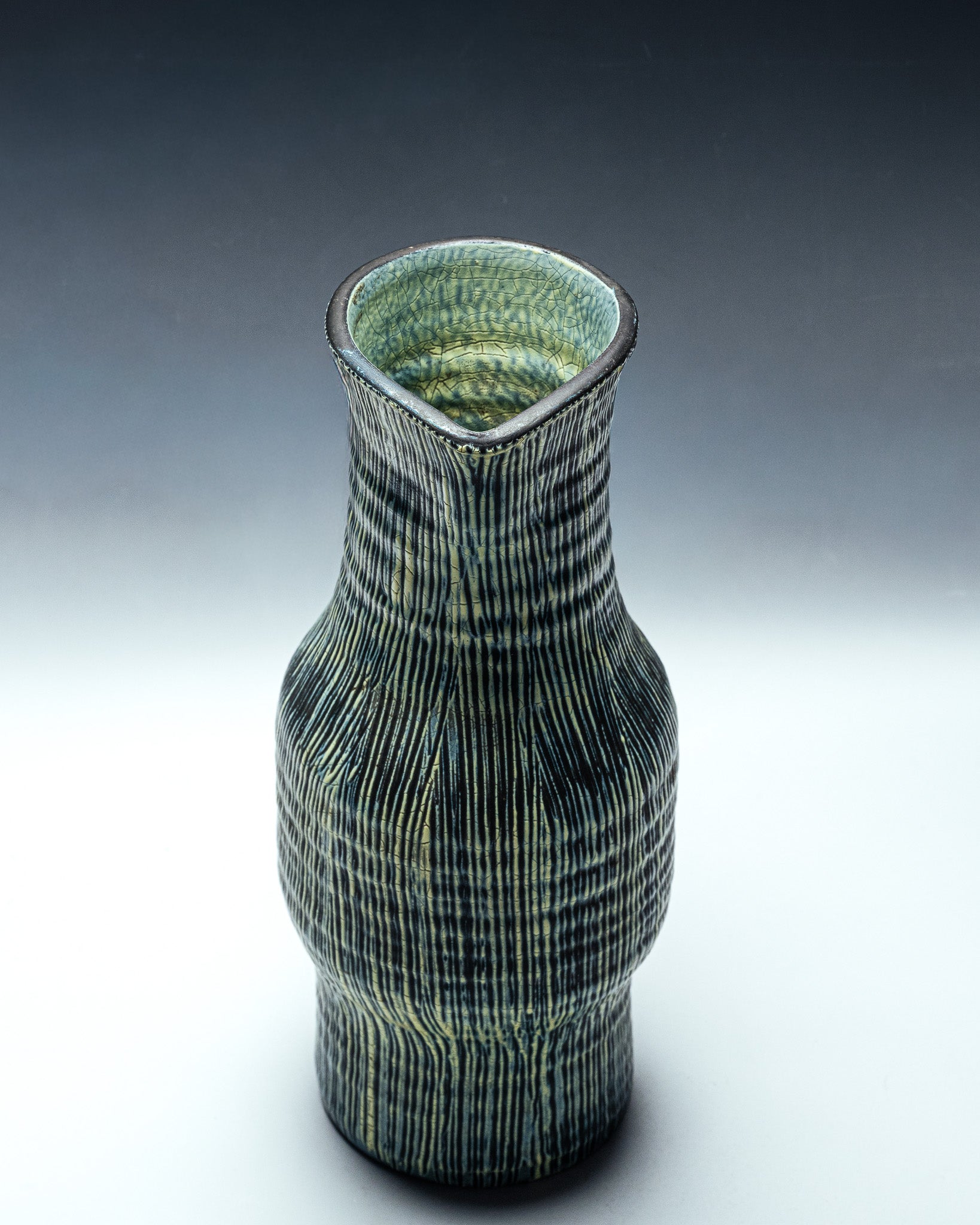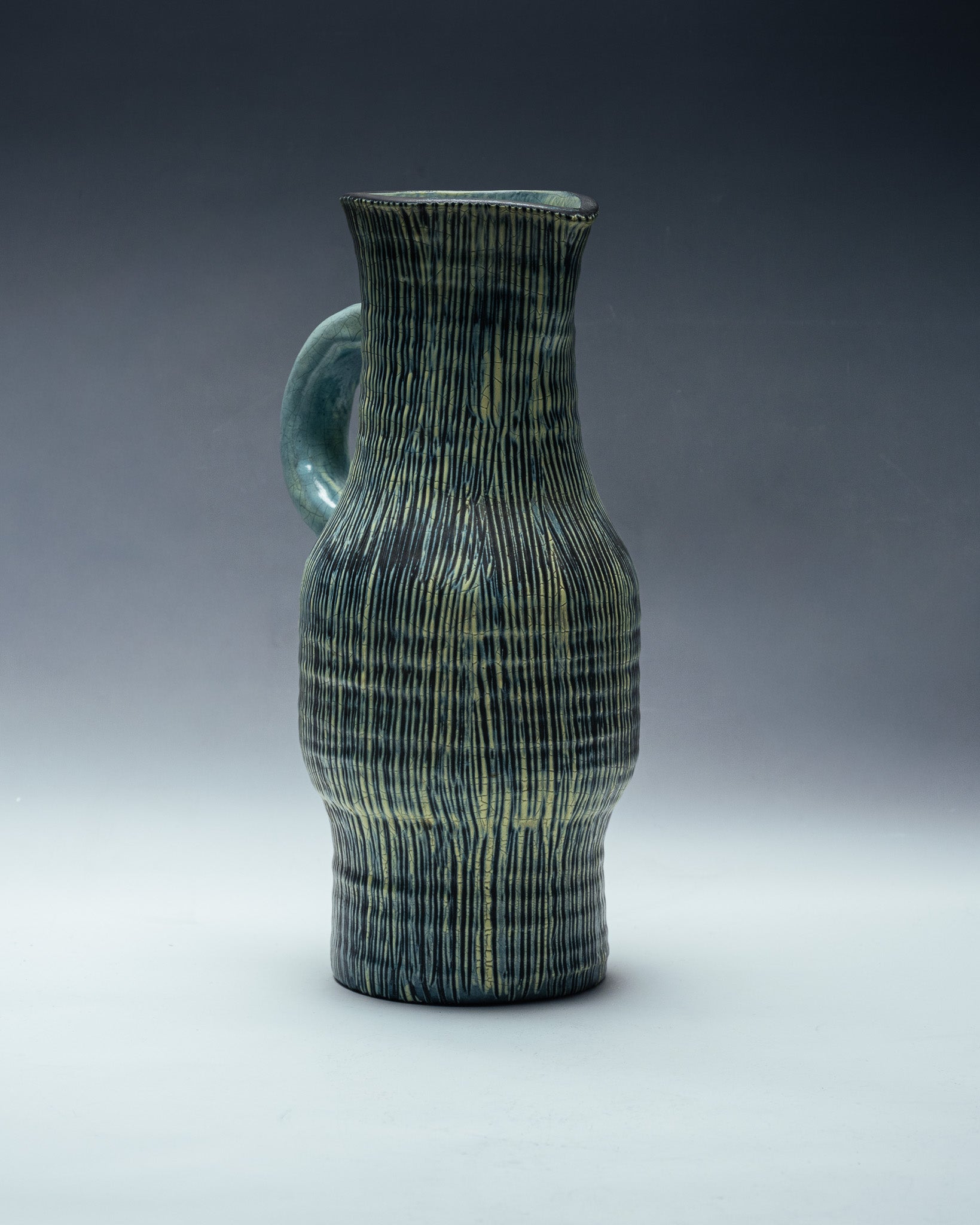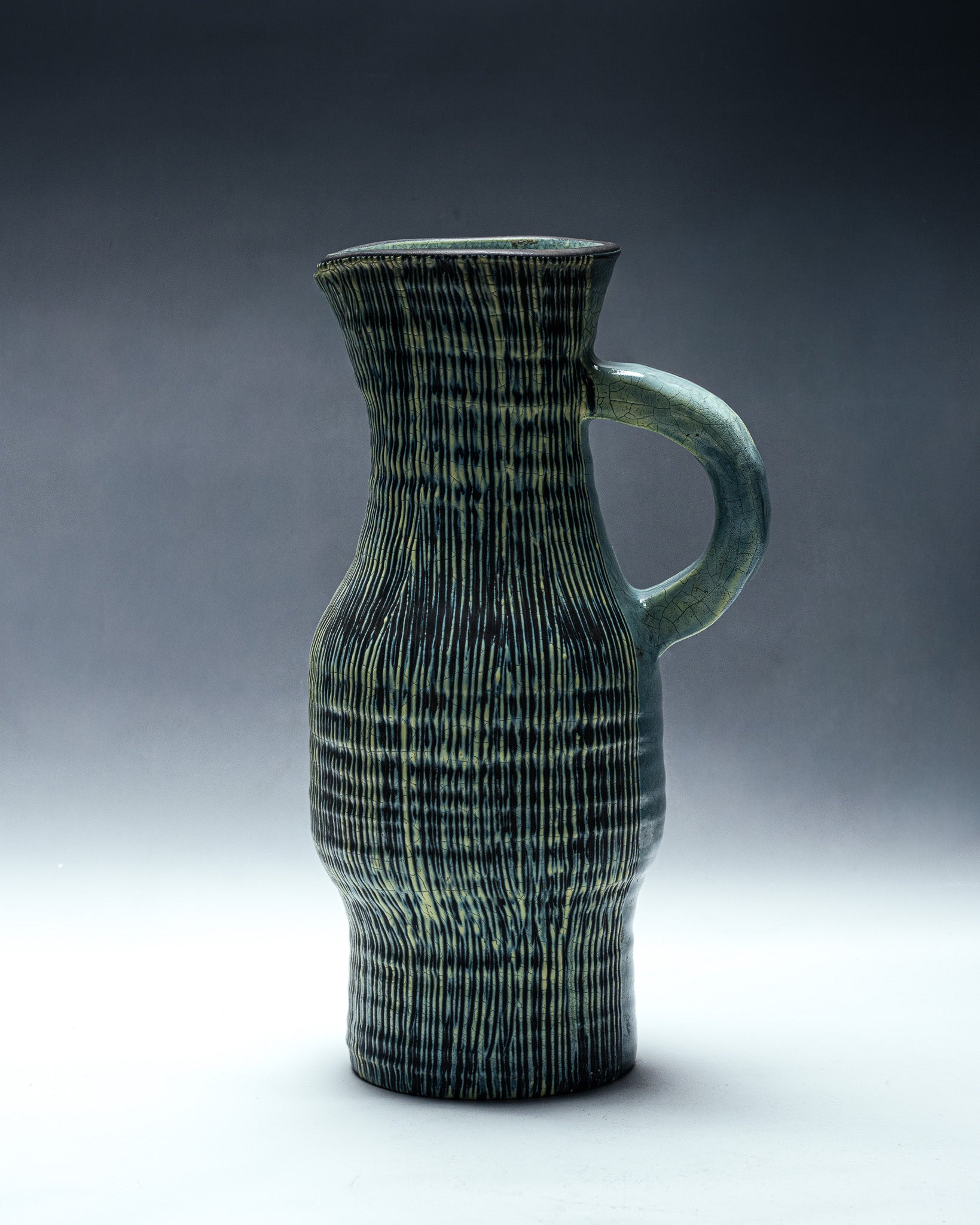 Grand pichet en céramique émaillée à décor vertical strié, typique du travail des ateliers d'Accolay dans les années 1950. La surface est animée de fines lignes irrégulières en relief, soulignées par un émail nuancé mêlant verts profonds, touches sombres et rehauts jaune-olive. L'intérieur présente un bel émail craquelé vert céladon.