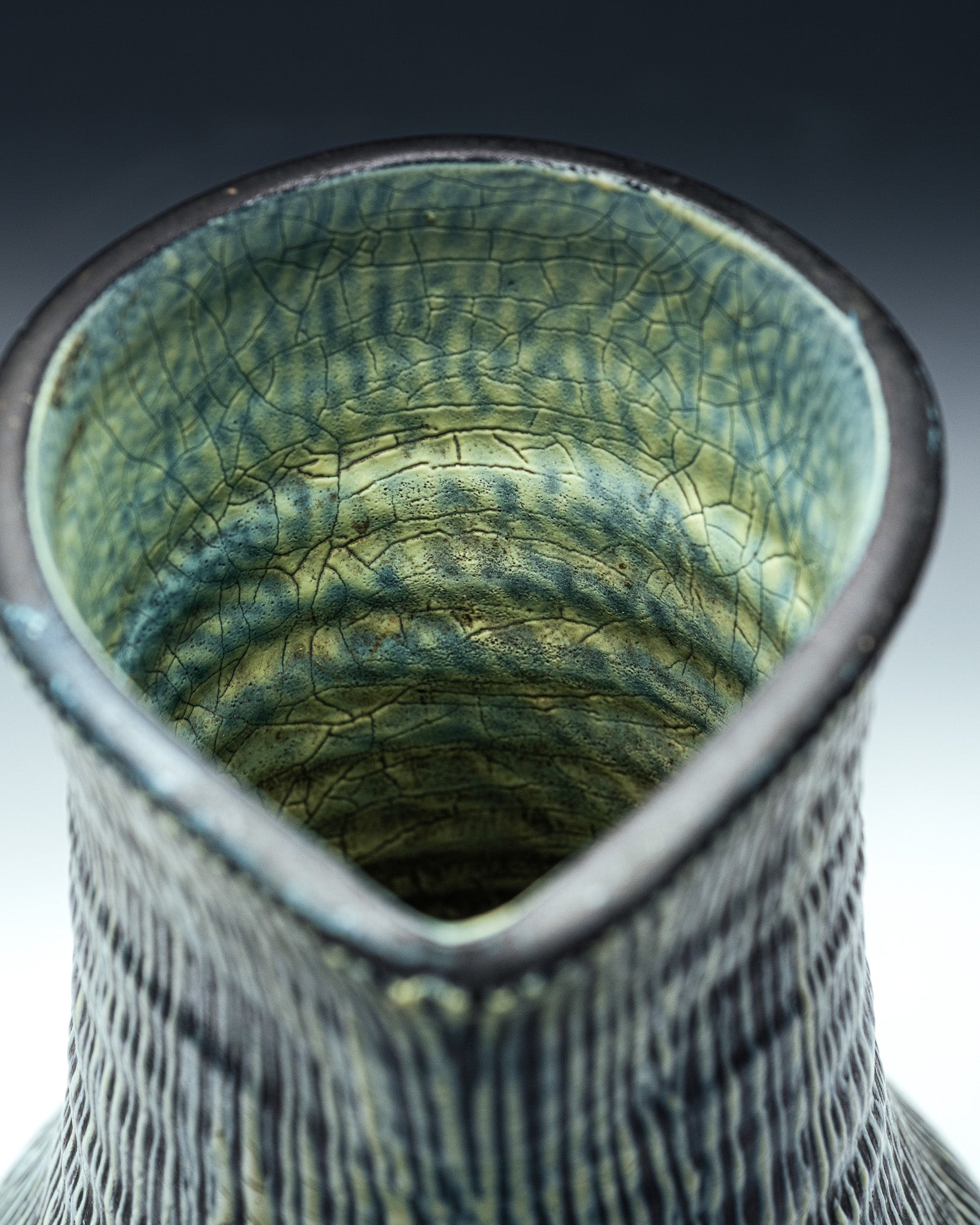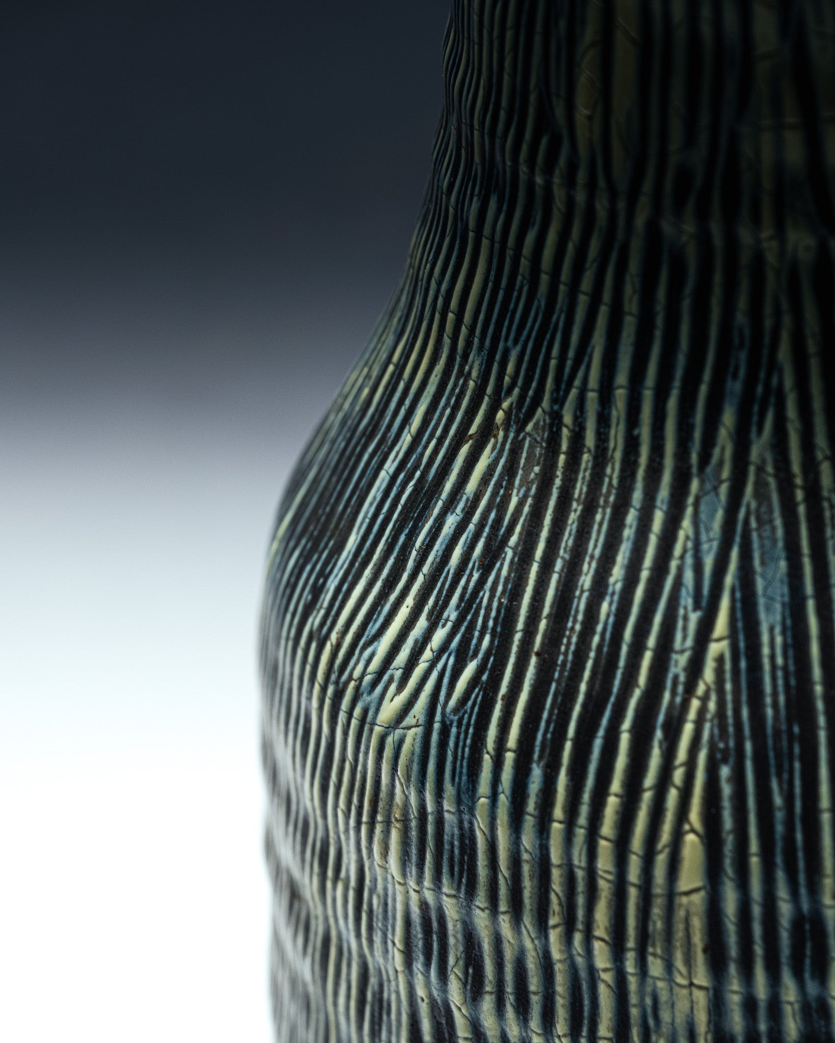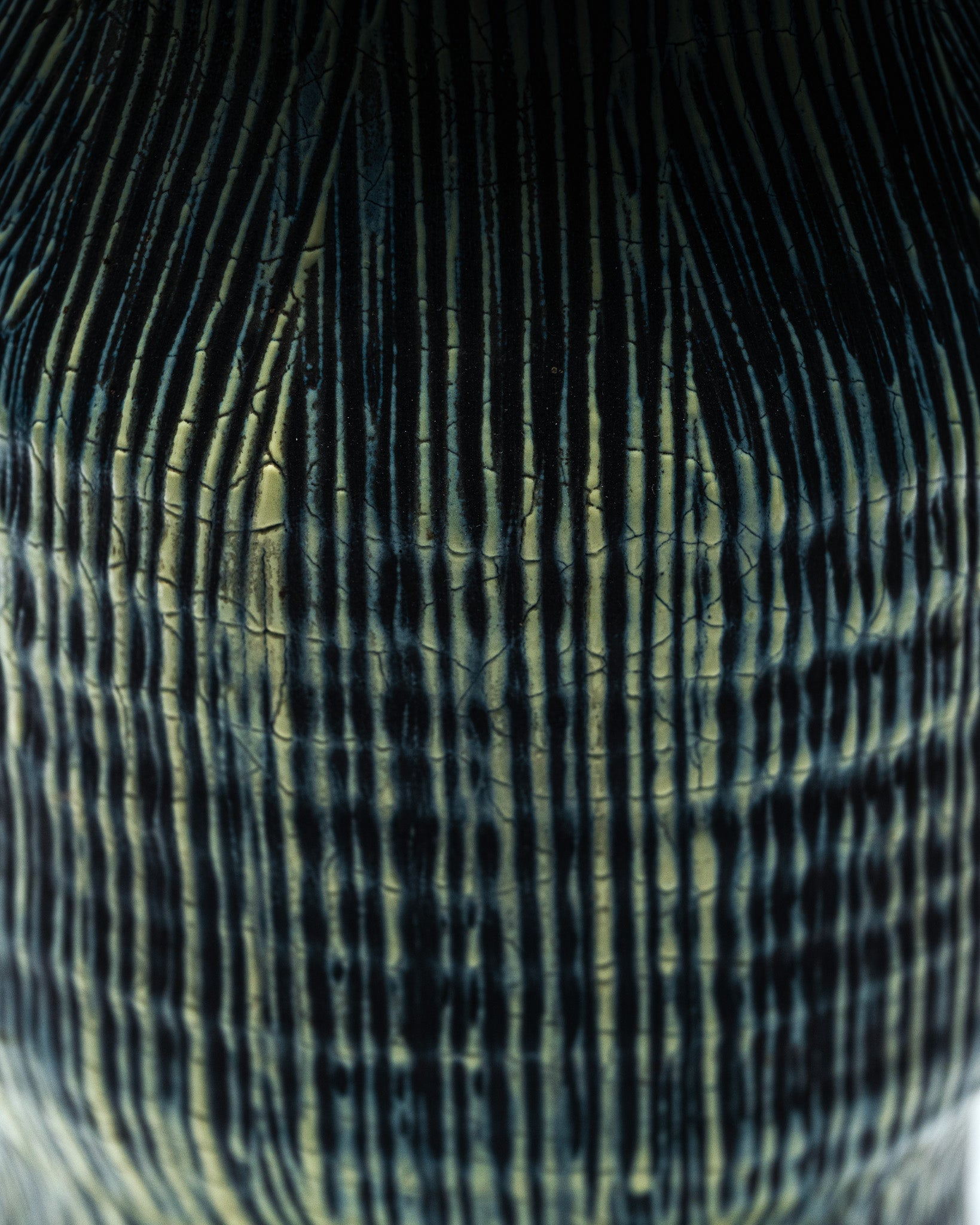 Grand pichet en céramique émaillée à décor vertical strié, typique du travail des ateliers d'Accolay dans les années 1950. La surface est animée de fines lignes irrégulières en relief, soulignées par un émail nuancé mêlant verts profonds, touches sombres et rehauts jaune-olive. L'intérieur présente un bel émail craquelé vert céladon.