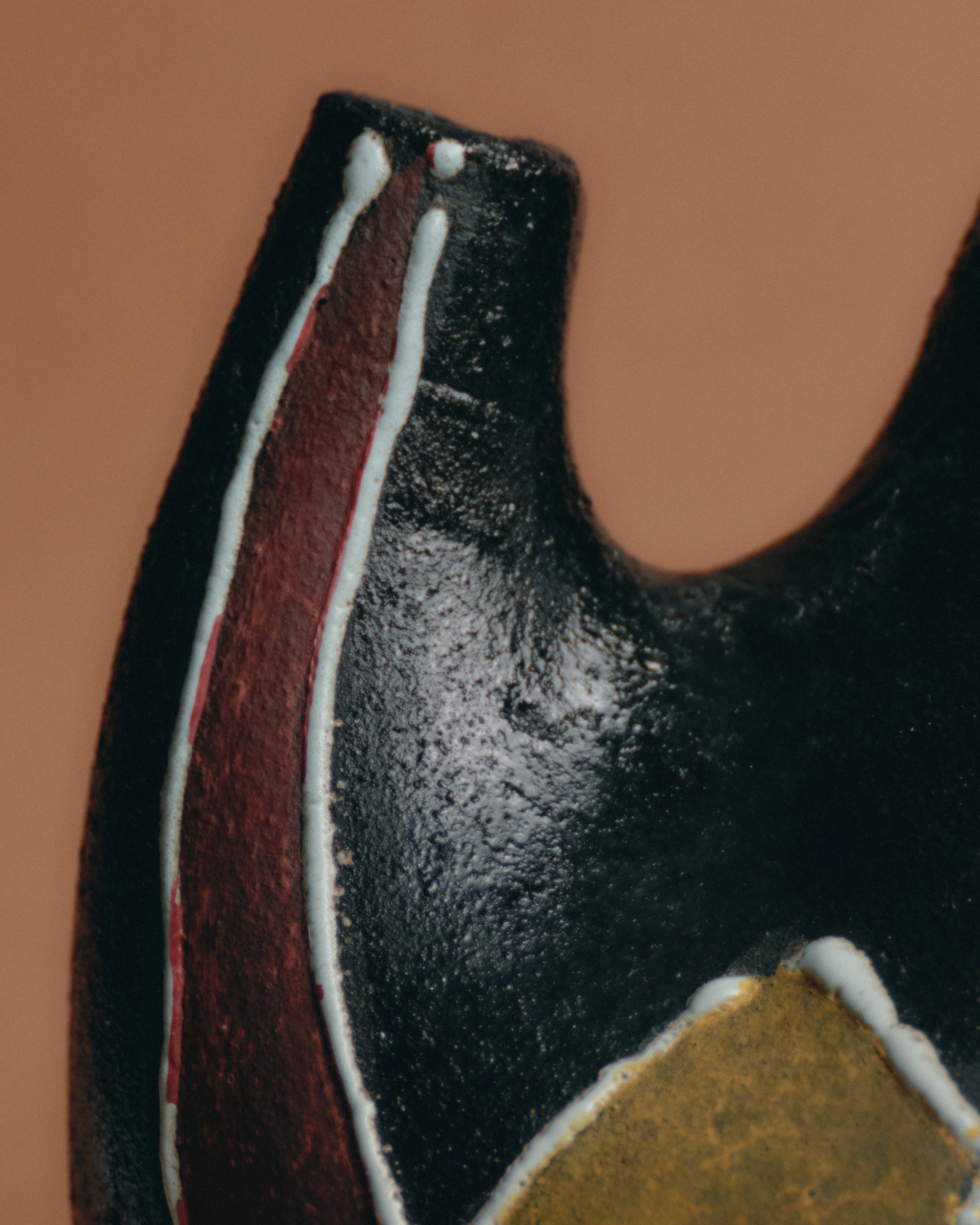 Pichet en grès texturé signé Atelier Accolay, circa 1950-60. Corps galbé à double ouverture, décor en relief aux motifs géométriques dans des tons ocre, vert olive et brun rouge sur fond noir mat. En superbe état.