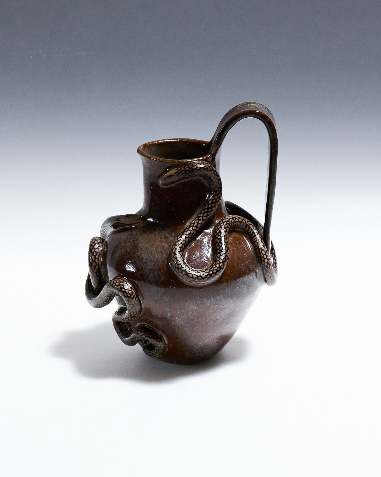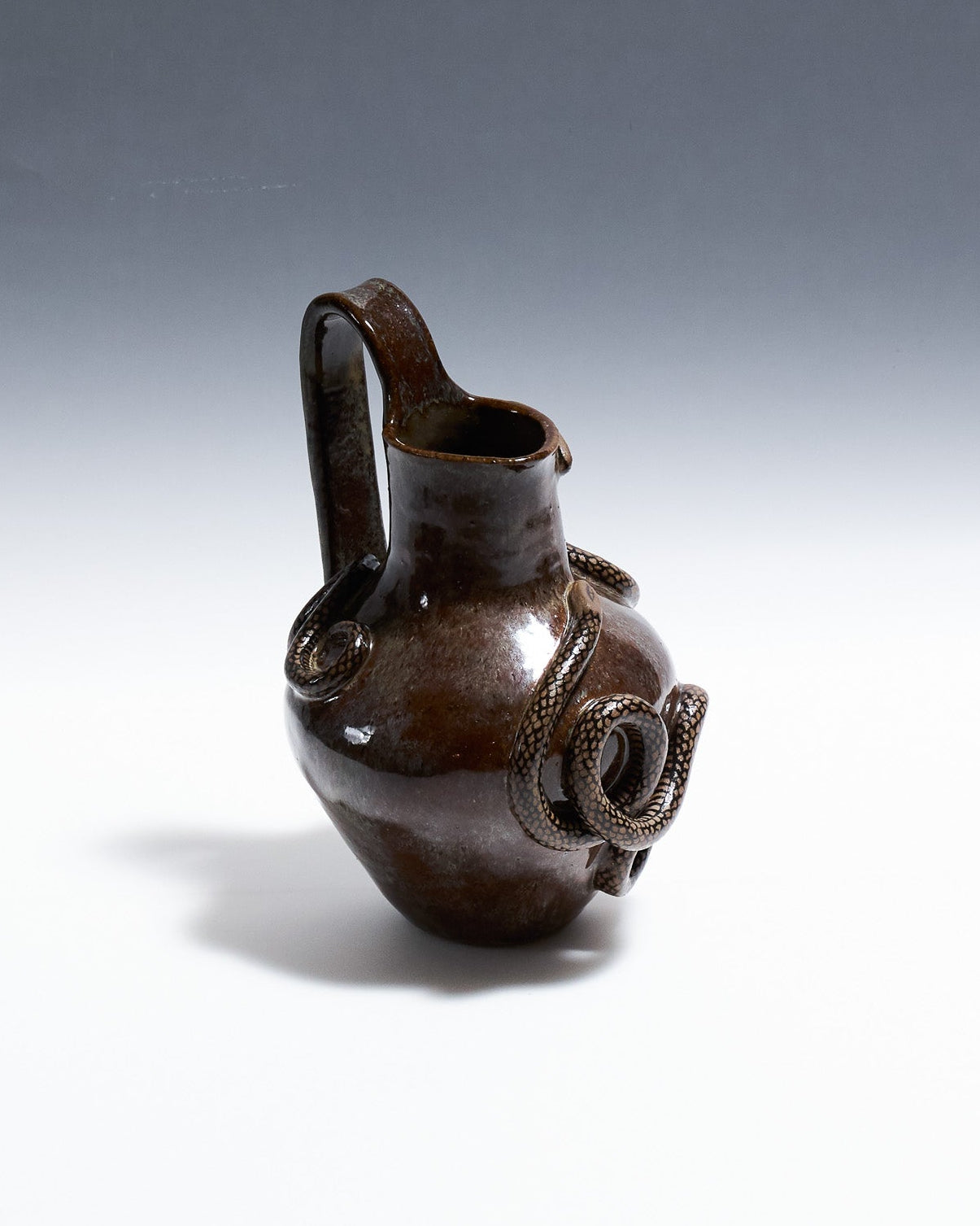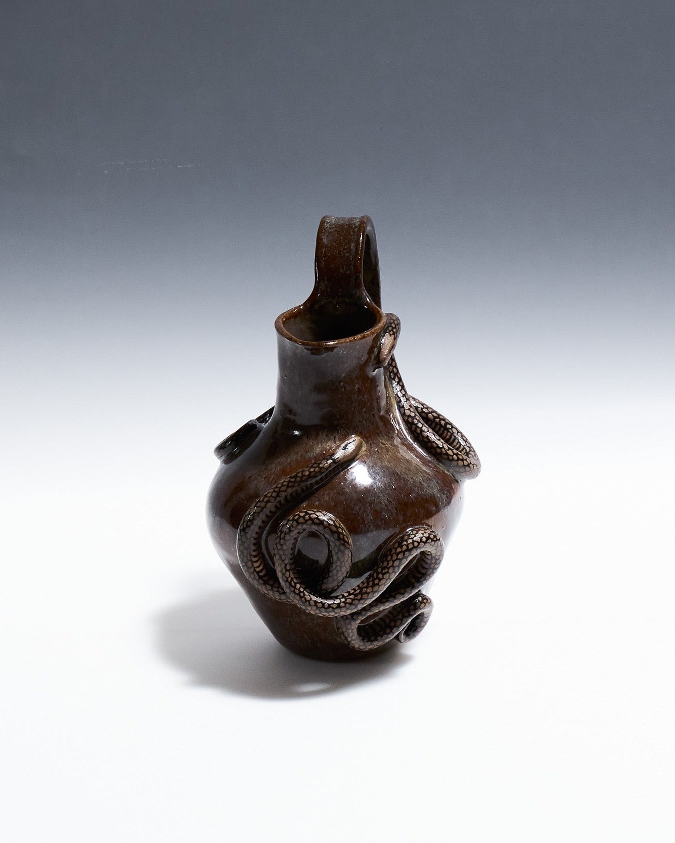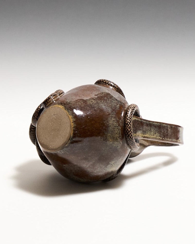 Pichet Serpent Bruns à anses en céramique émaillée marron glacé. Décor en relief représentant un serpent aux écailles noires, s'enroulant autour des anses et de la panse.