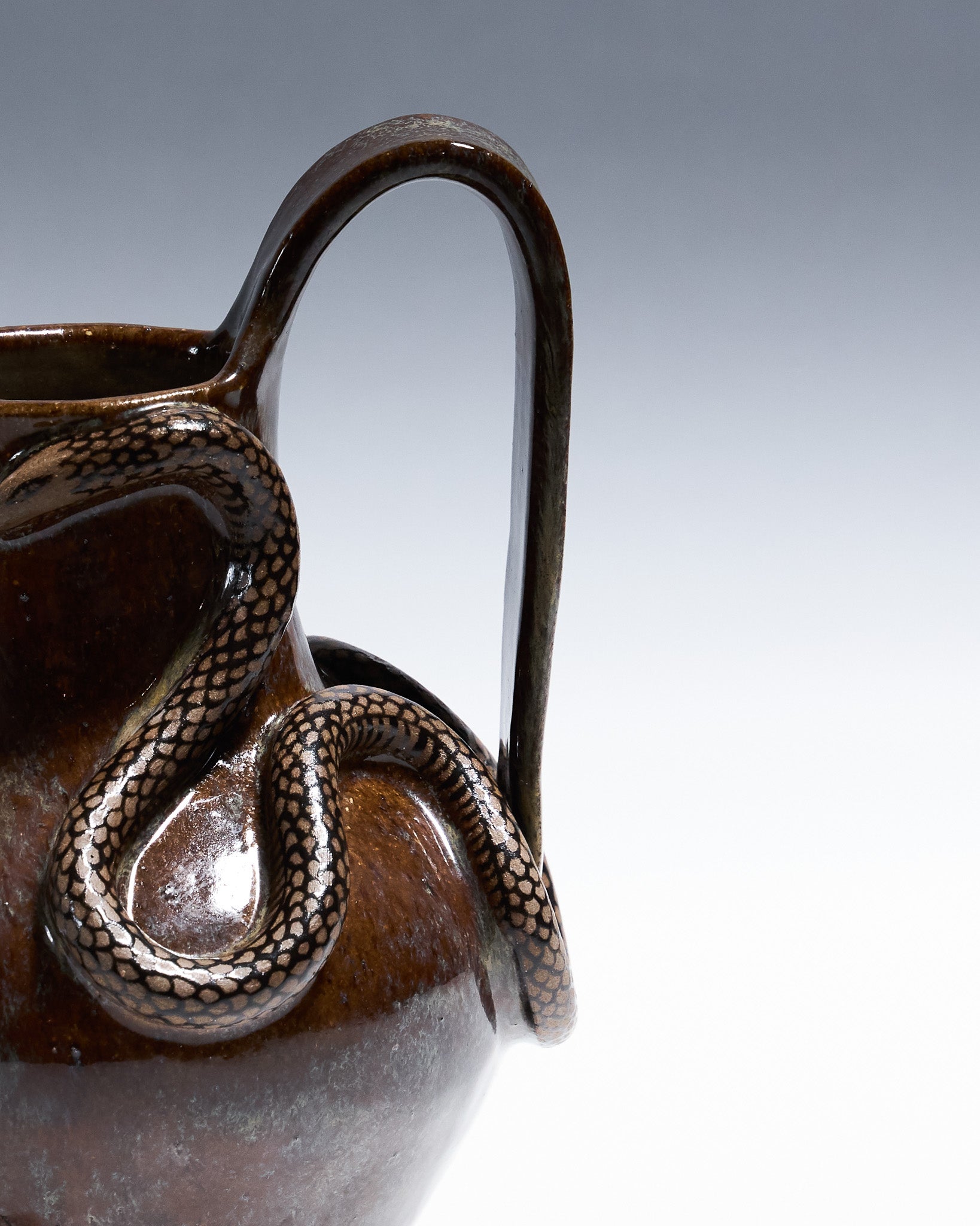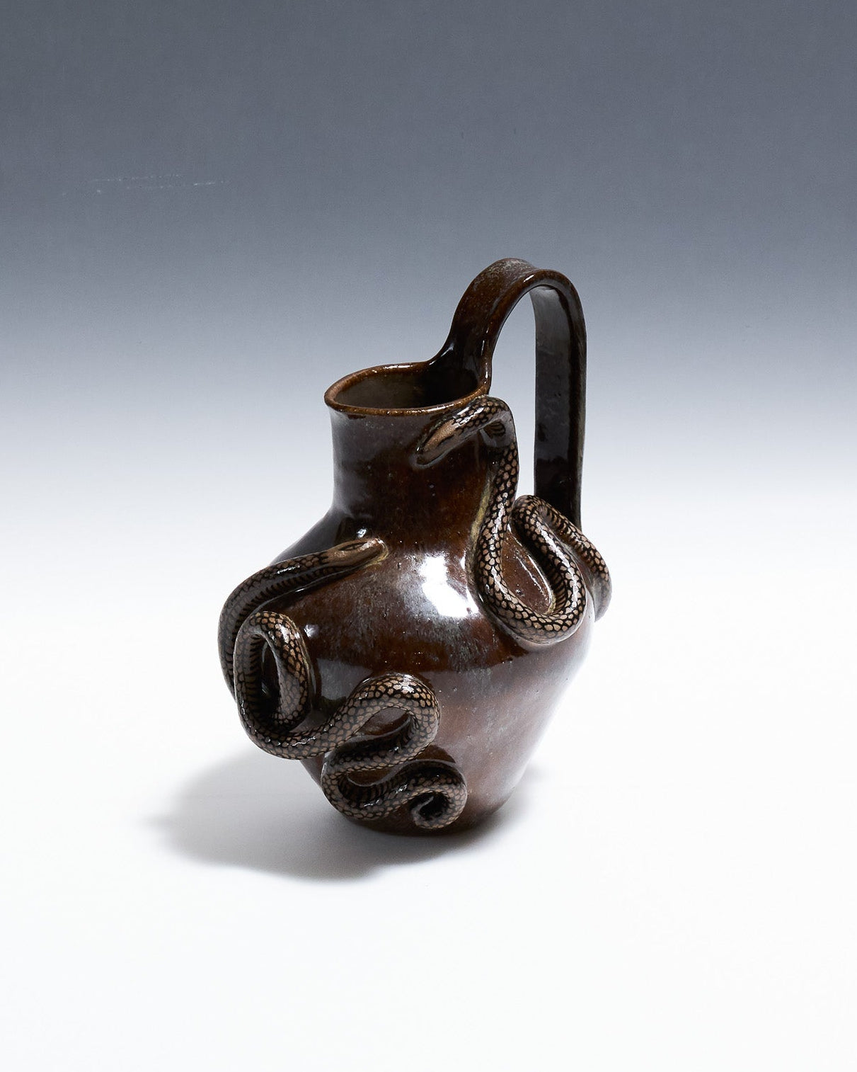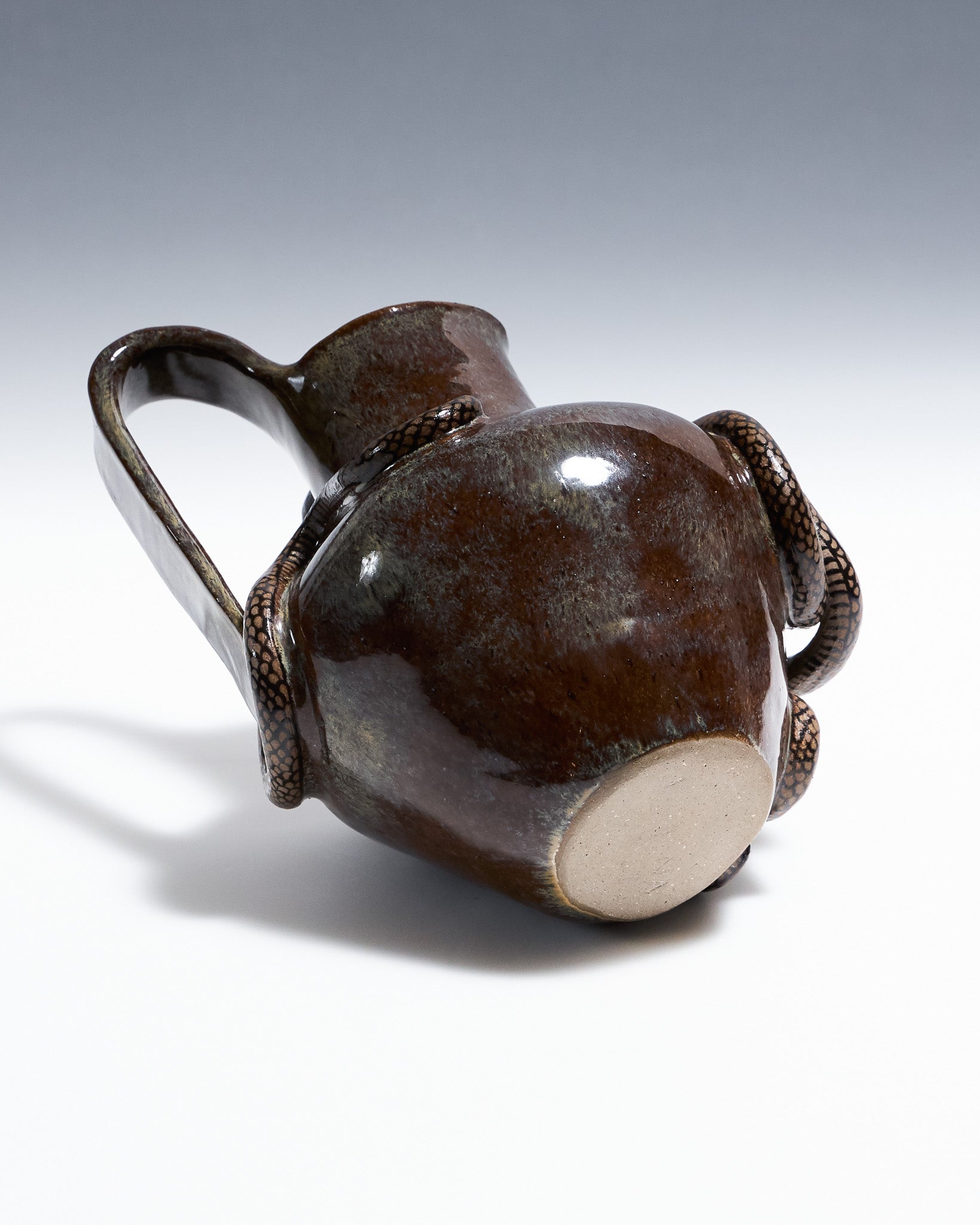 Pichet Serpent Bruns à anses en céramique émaillée marron glacé. Décor en relief représentant un serpent aux écailles noires, s'enroulant autour des anses et de la panse.