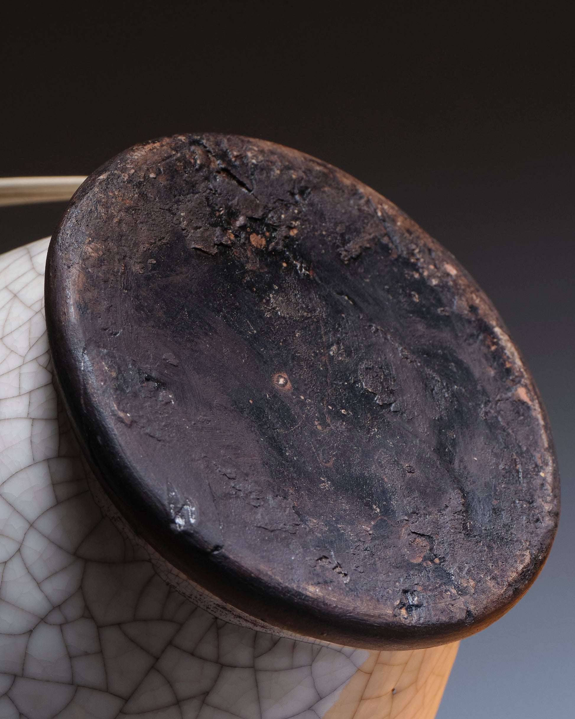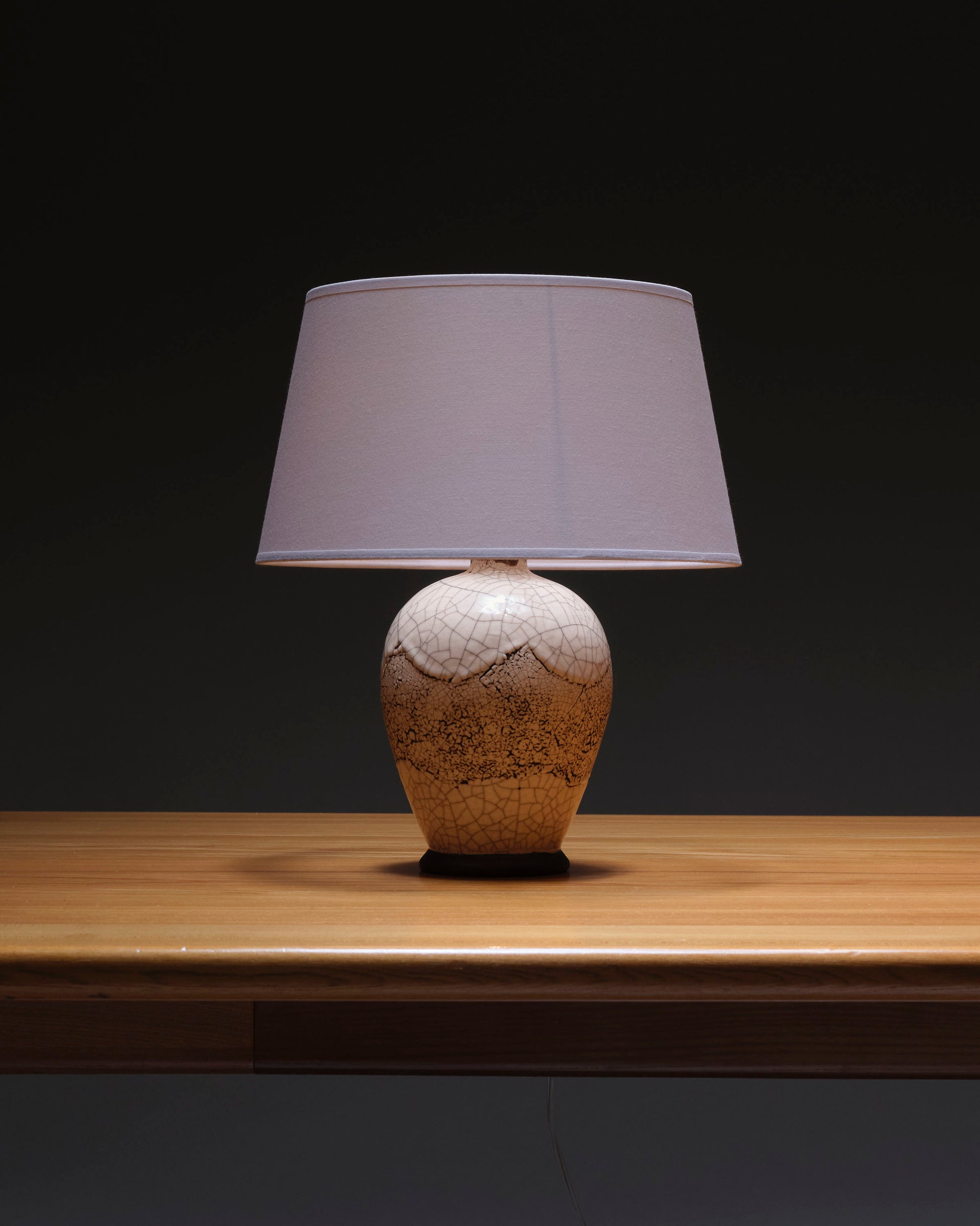 Pied de lampe en céramique blanche à effet craquelé, années 1960. Électrification fonctionnelle. Bon état général. Vendue sans abat-jour.