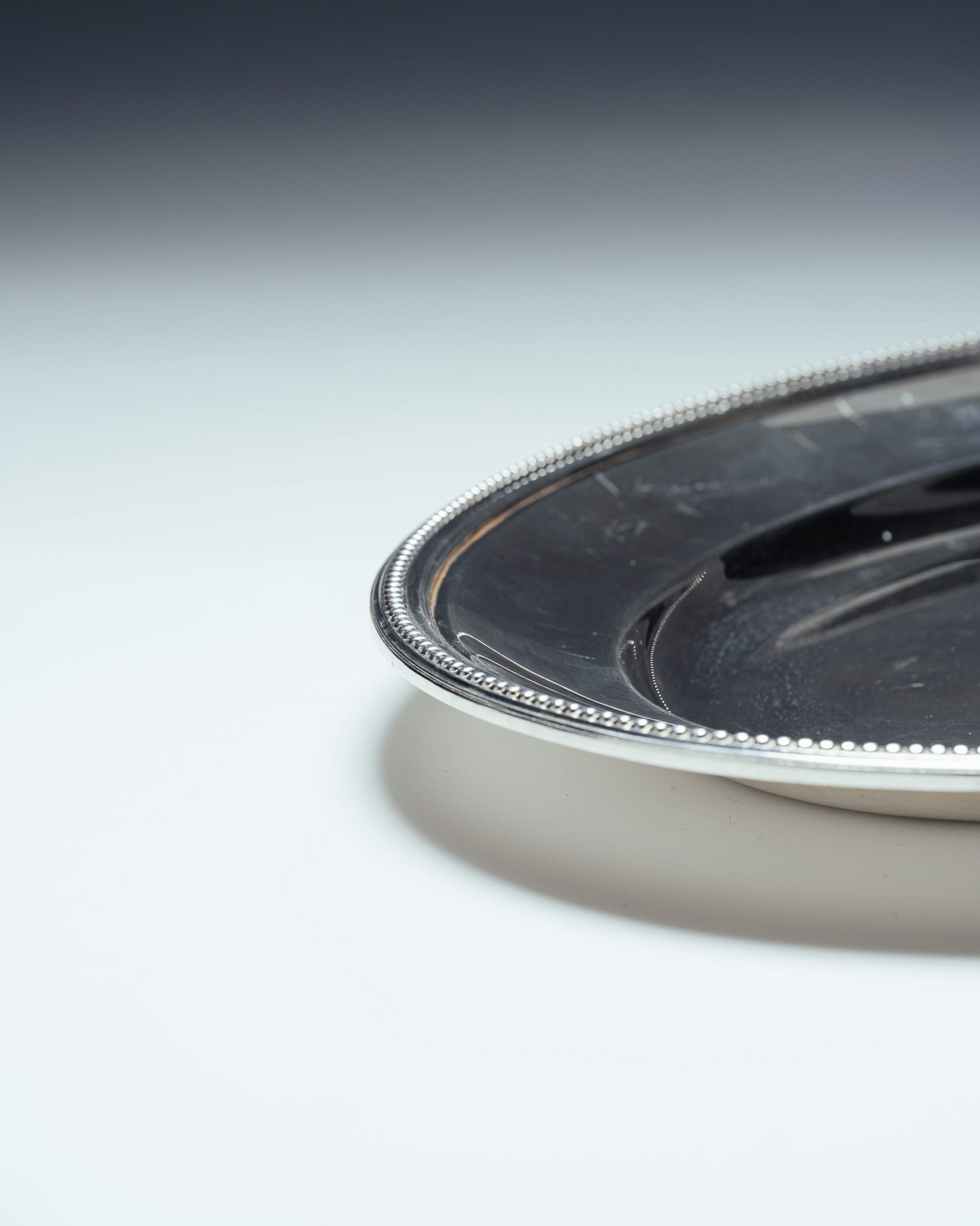 Plat de service ovale en métal argenté. Modèle à larges ailes soulignées d’un décor perlé en bordure. Fond légèrement creux, travail des années 1960. Poinçonné Christofle, France au revers du pourtour.