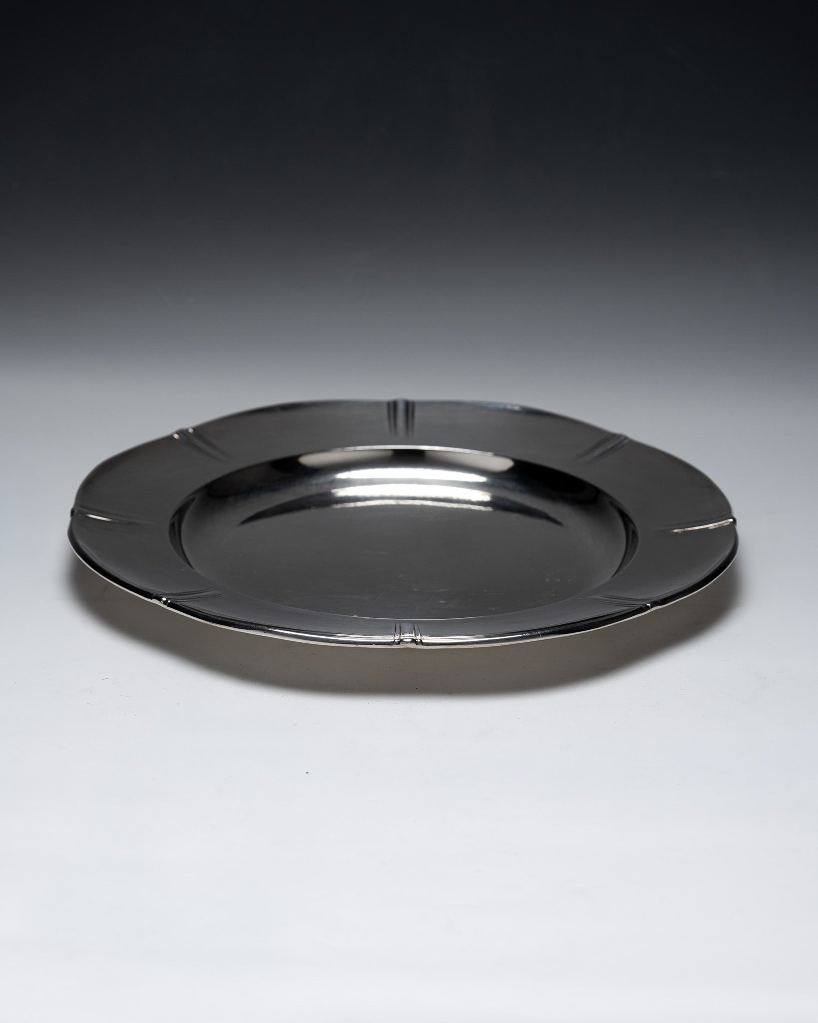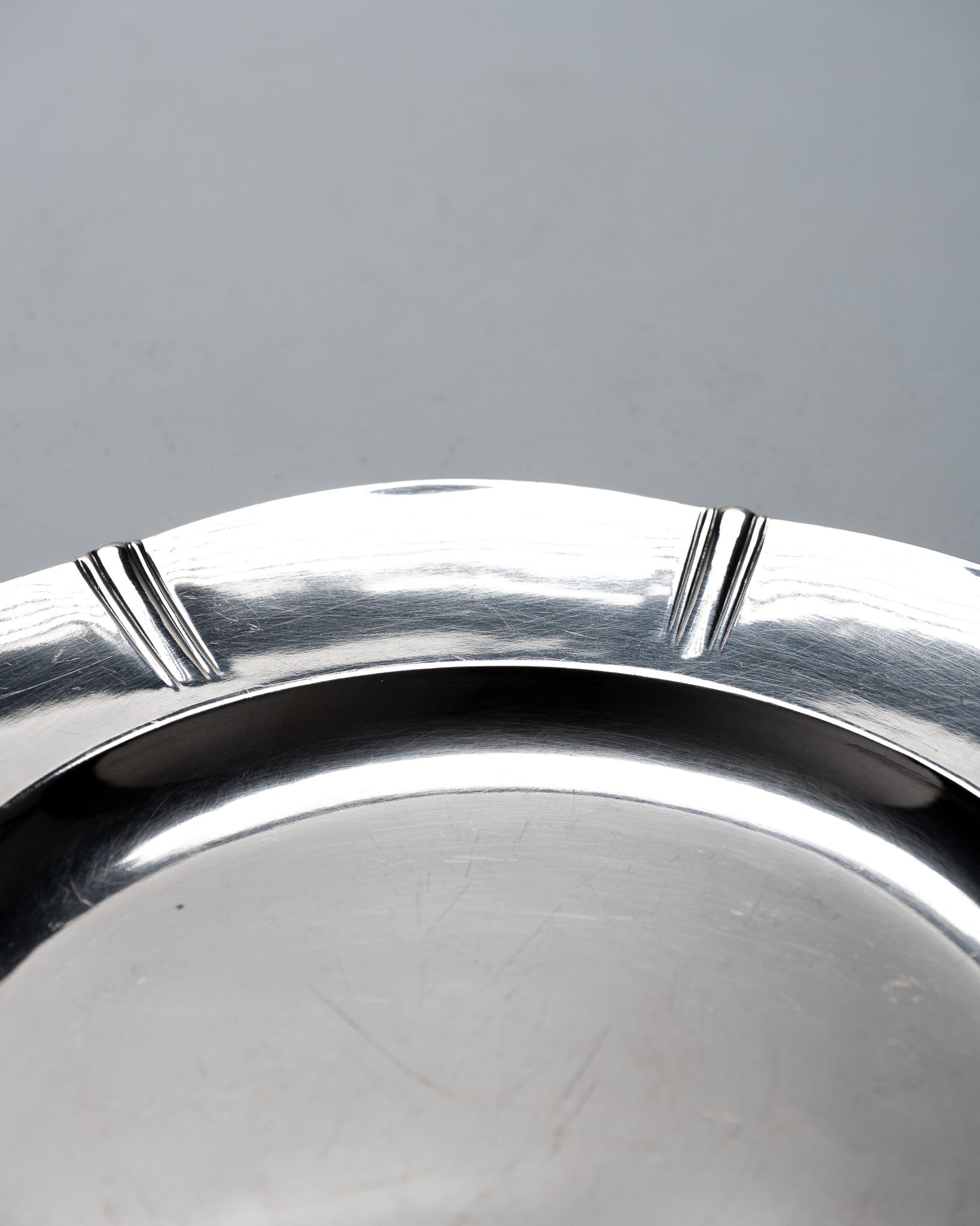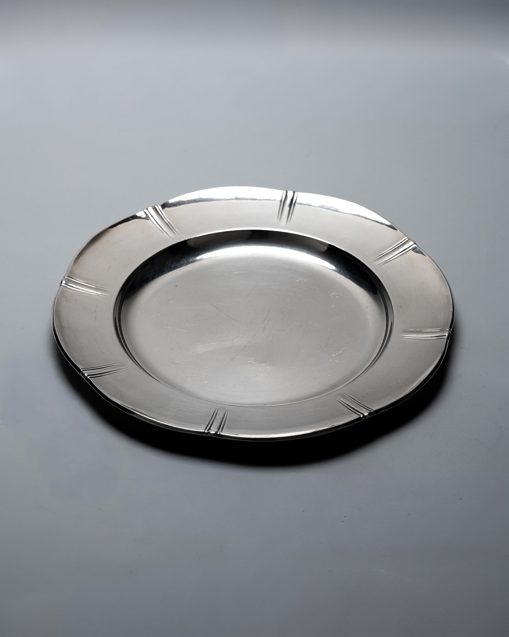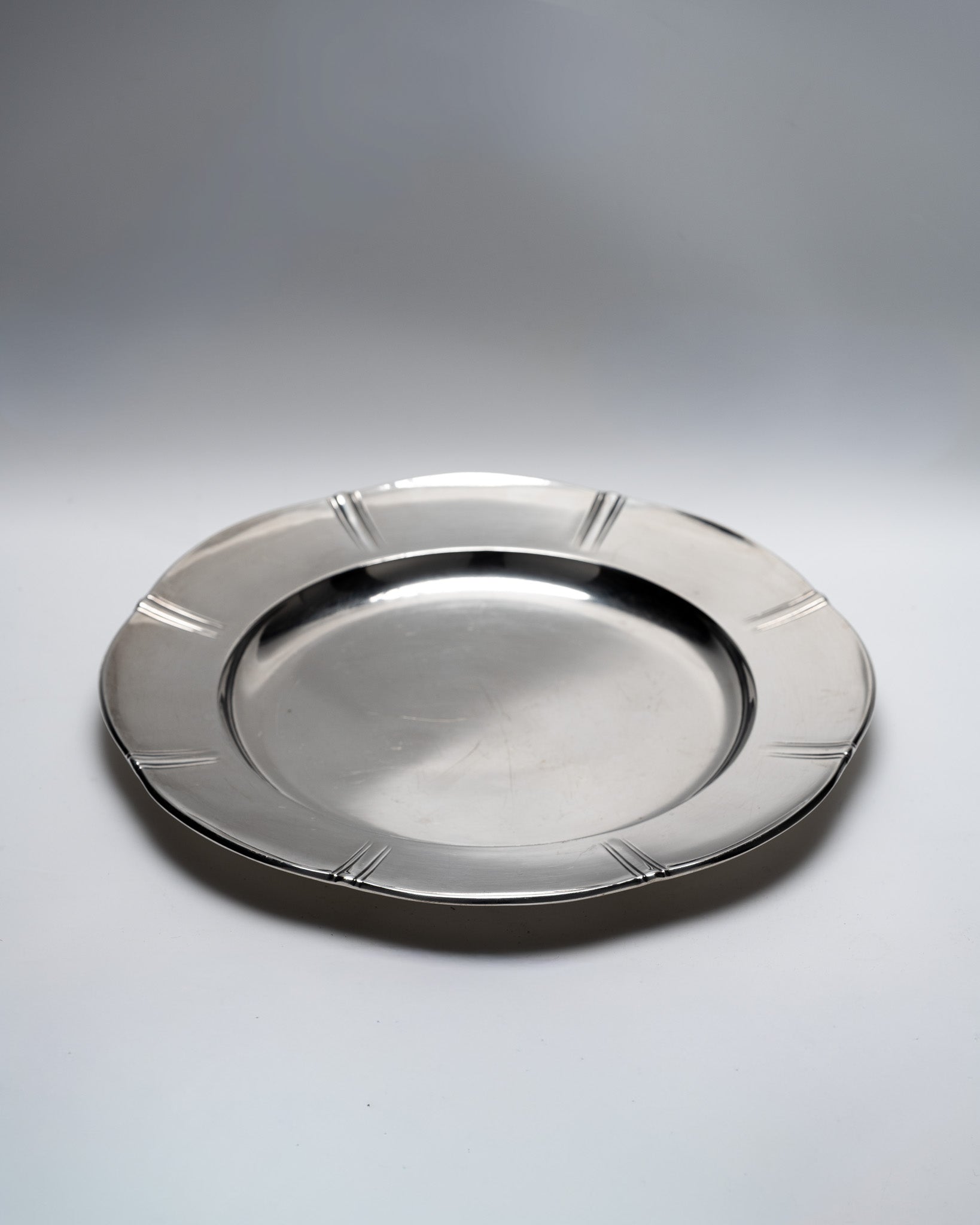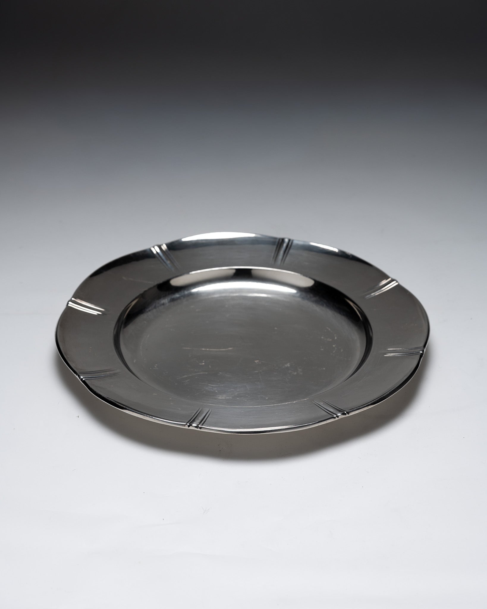 Plat rond en métal argenté de la collection Gallia, par la maison Christofle. Modèle de forme circulaire présentant une aile large décorée de 8 motifs composés de 3 lignes gravées, repartis régulièrement sur le pourtour. Bassin central lisse, légèrement creux, poinçonné Gallia au revers. Un travail des années 1930 dans l'esthétique Art déco. Bel état général.