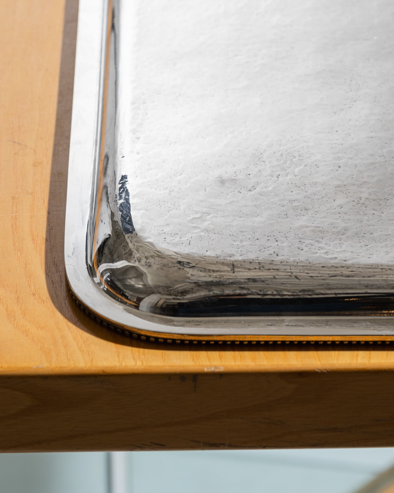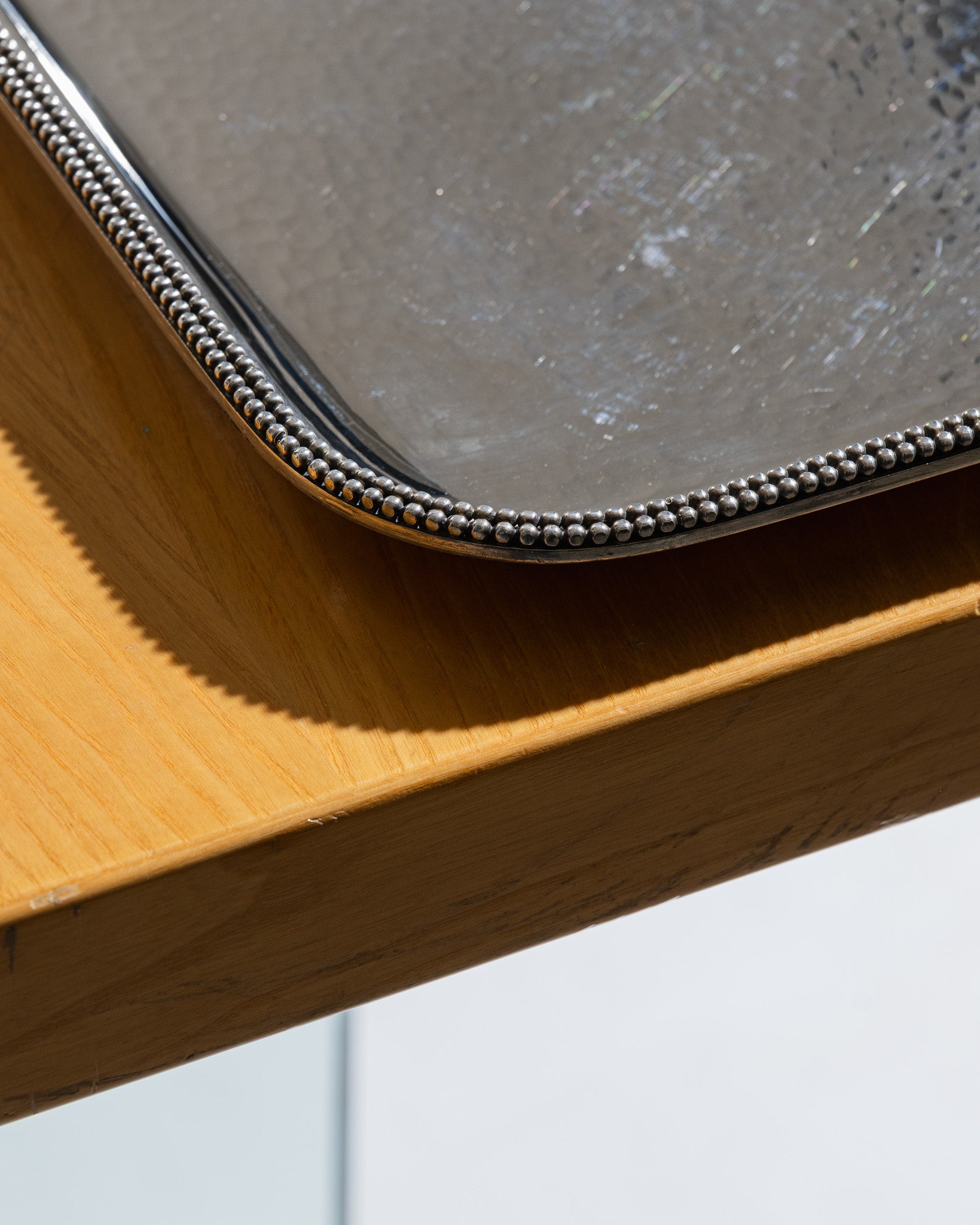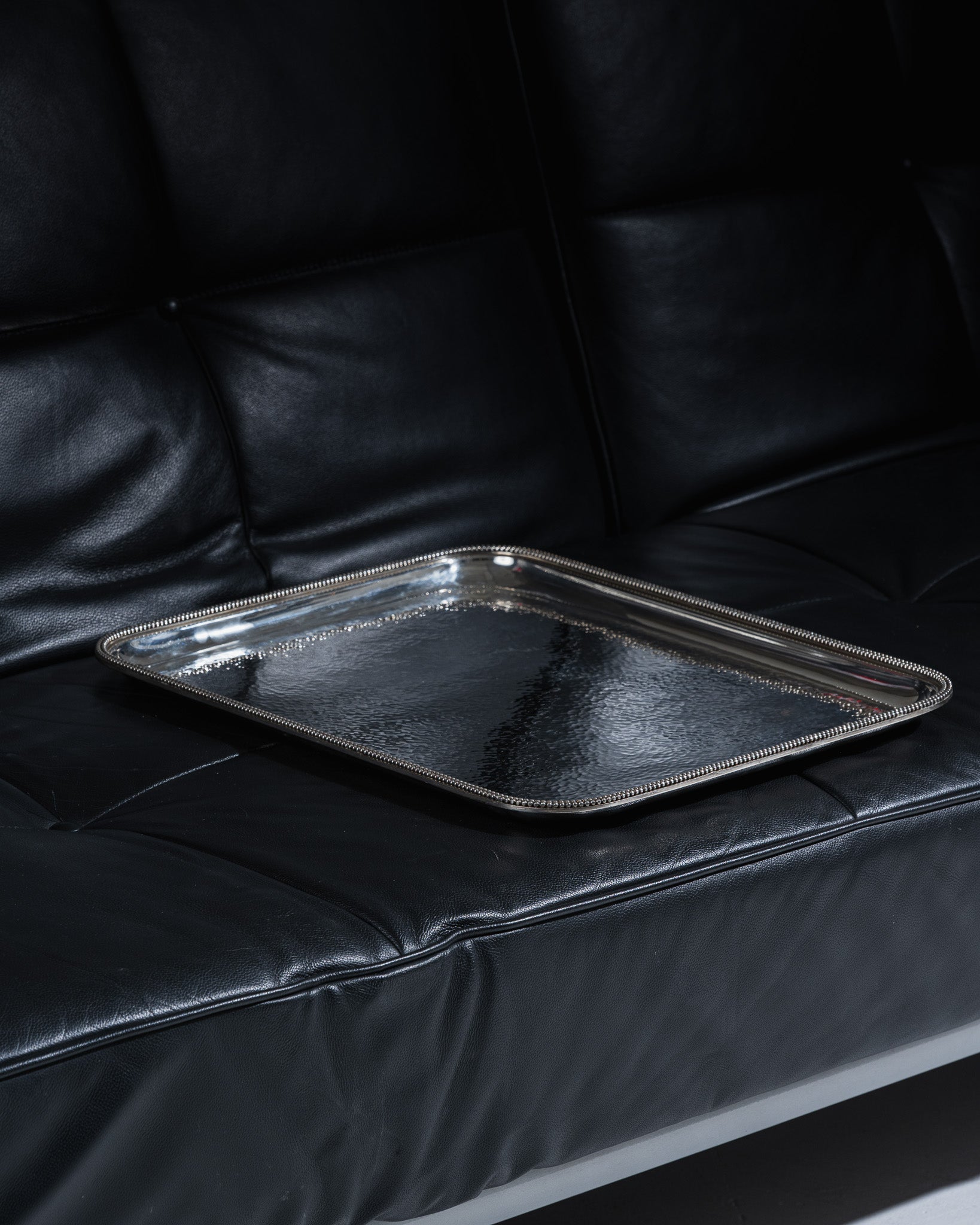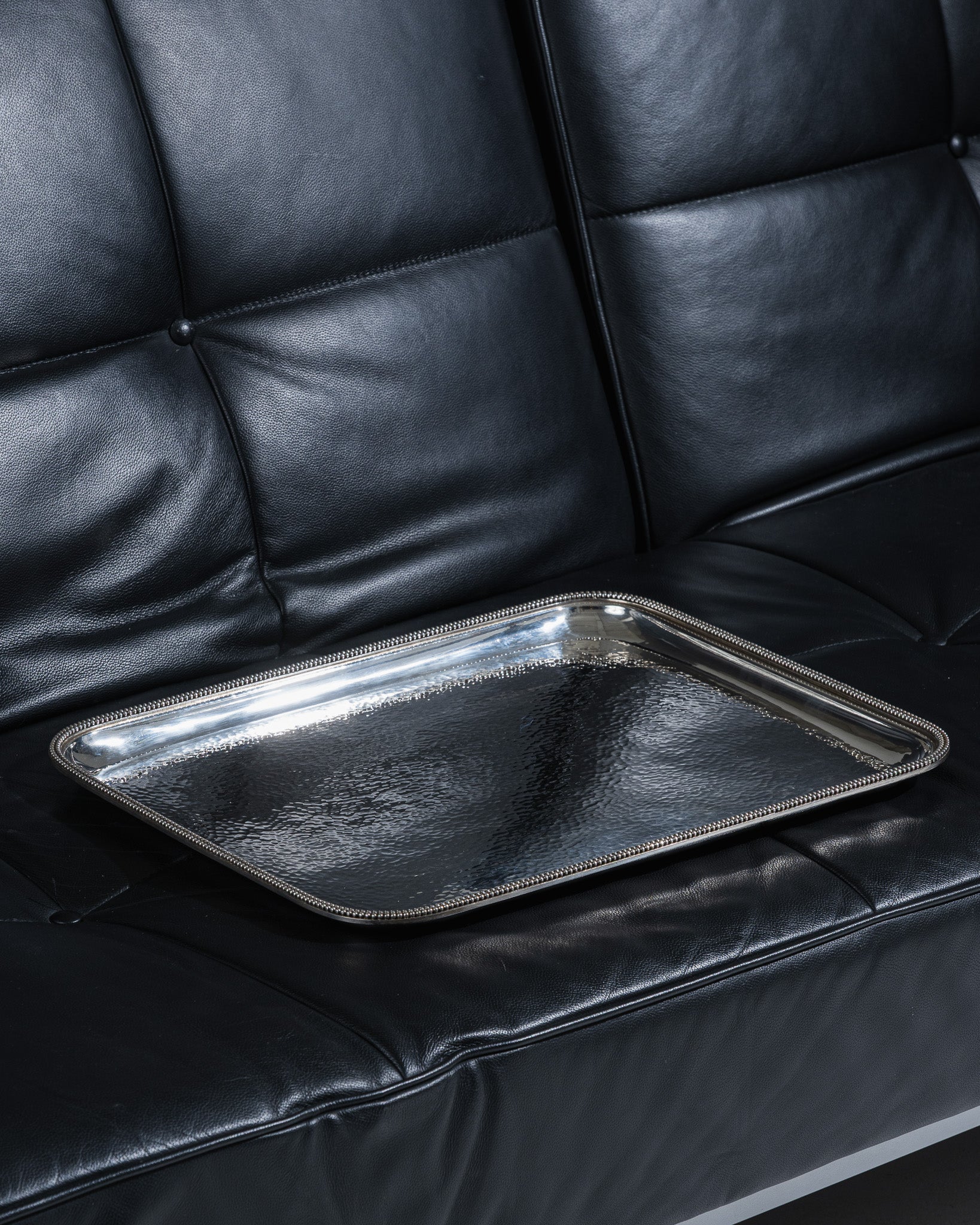 Plateau rectangulaire Jean Després, orfèvre et designer français emblématique de l'Art Déco. En métal argenté martelé, il présente un décor sobre et géométrique, typique de la rigueur moderniste de Després, souligné d'un bord perlé.