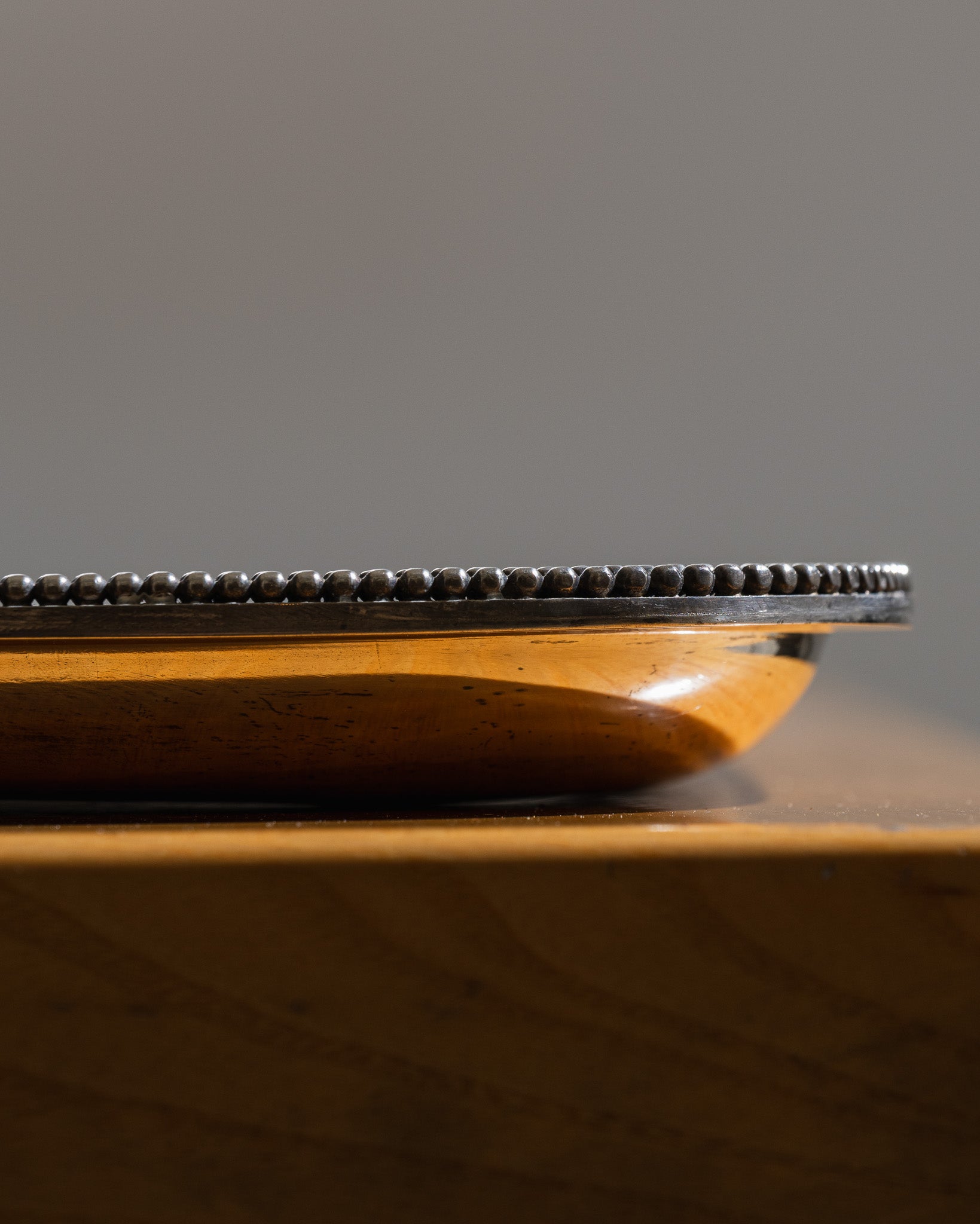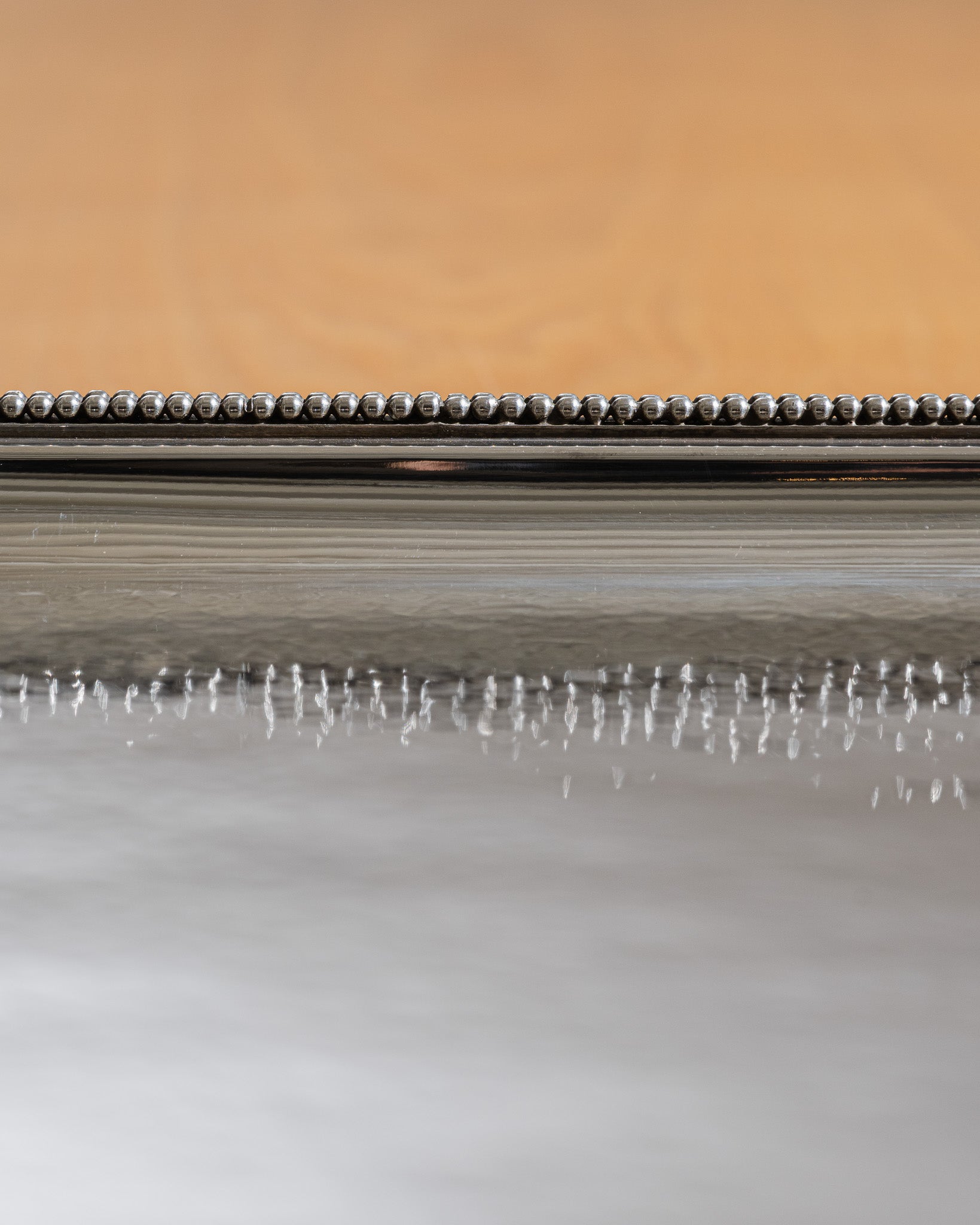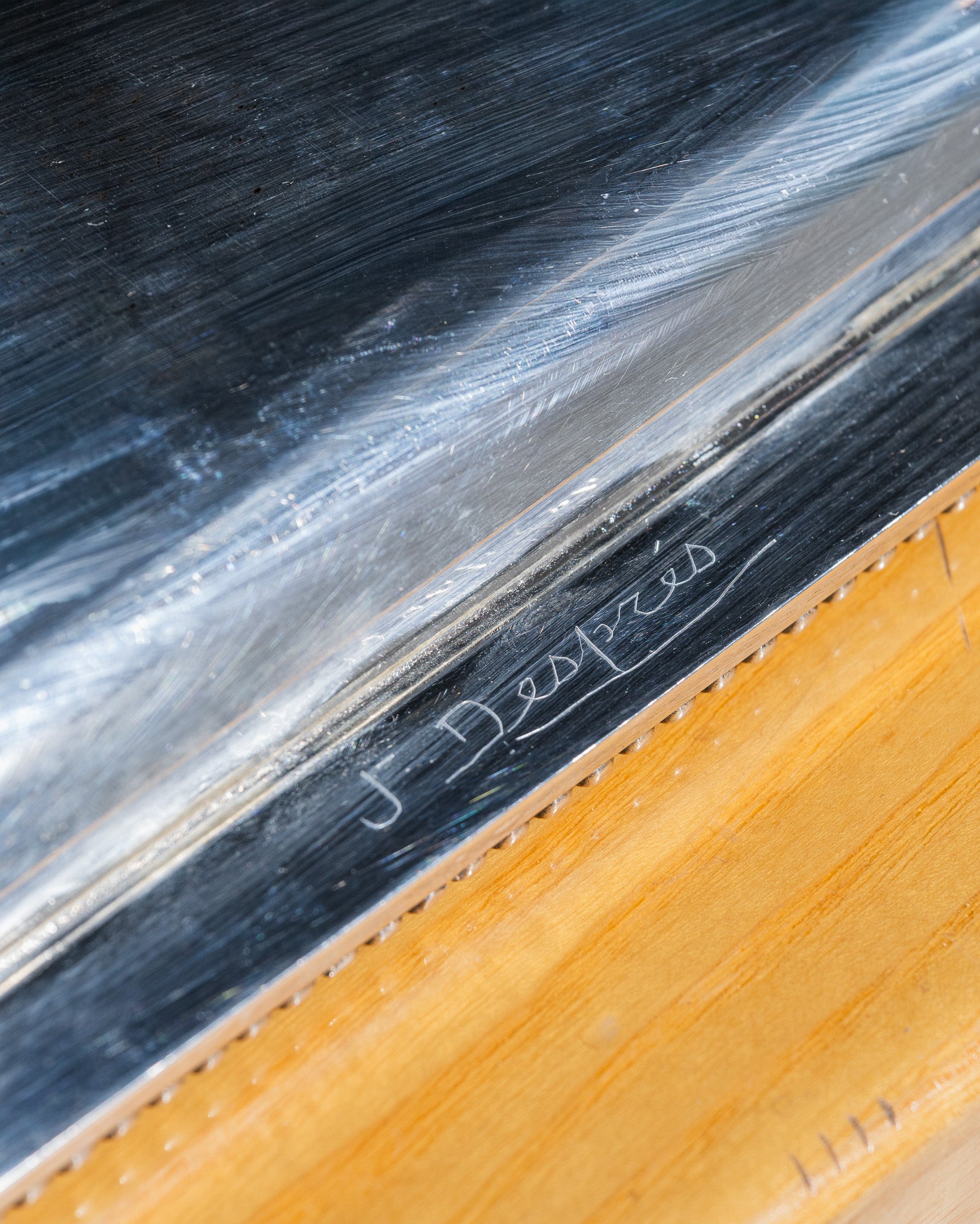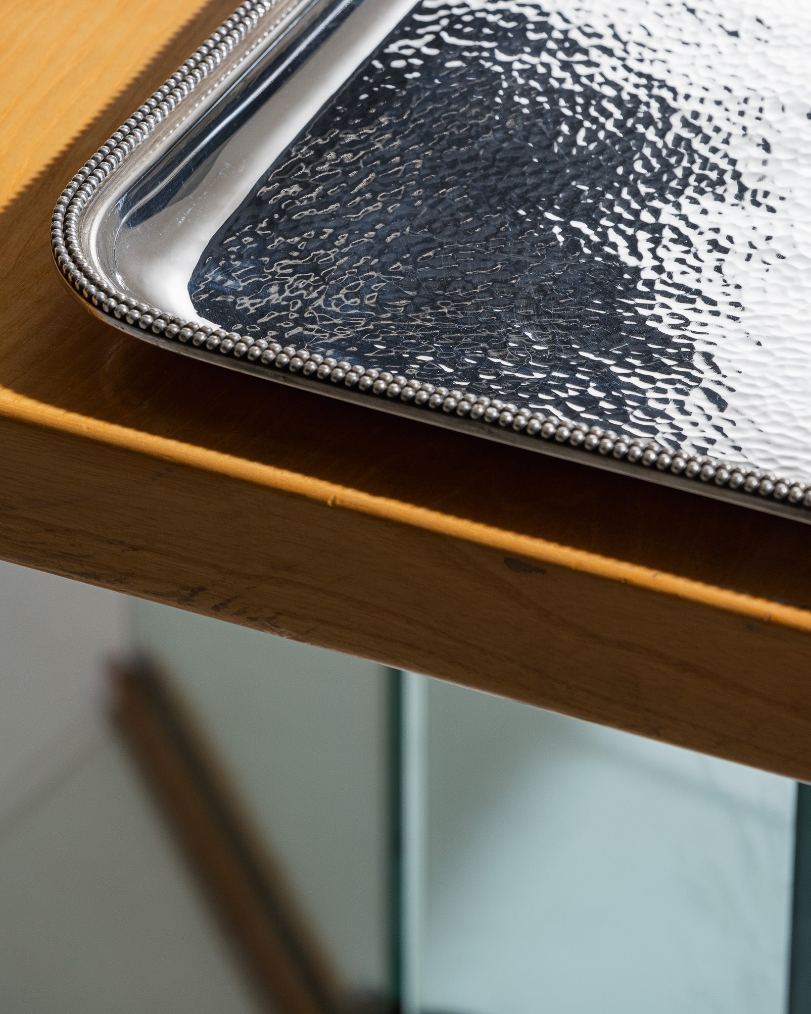 Plateau rectangulaire Jean Després, orfèvre et designer français emblématique de l'Art Déco. En métal argenté martelé, il présente un décor sobre et géométrique, typique de la rigueur moderniste de Després, souligné d'un bord perlé.