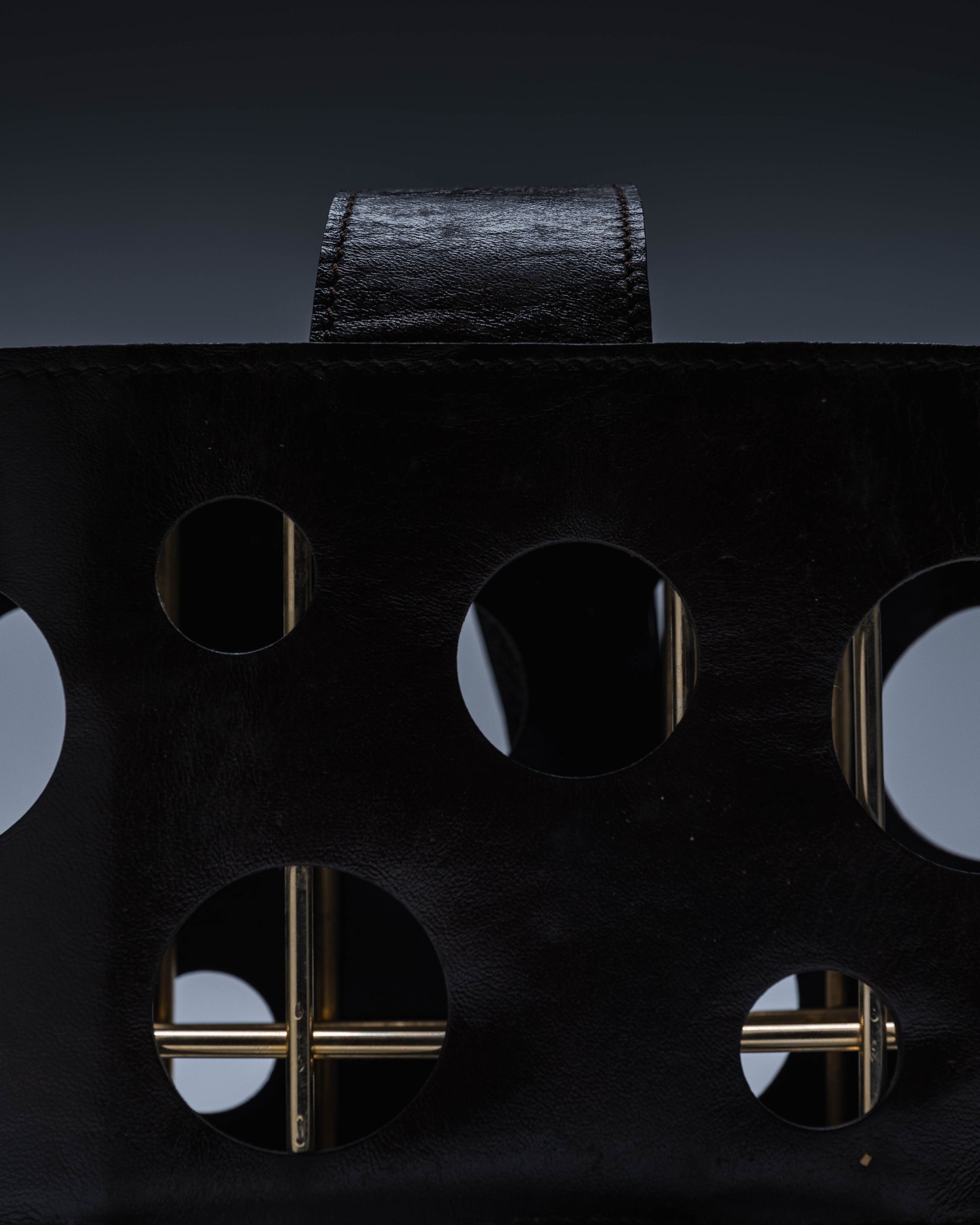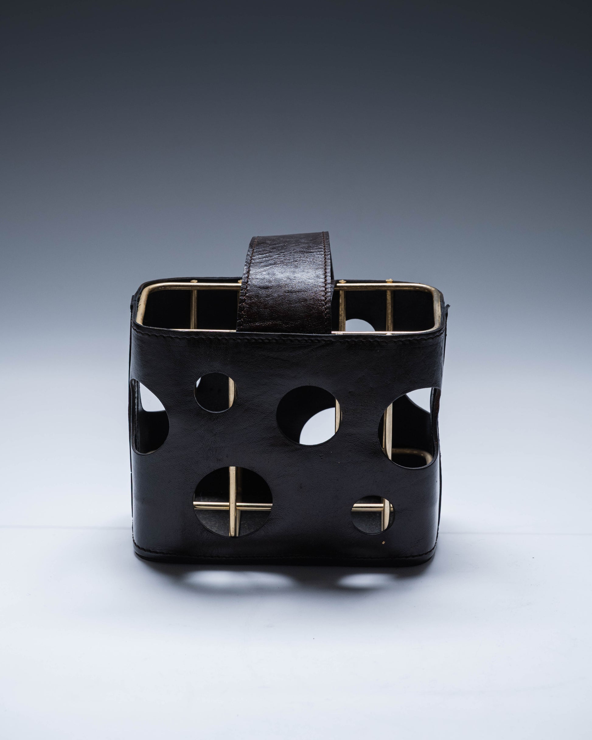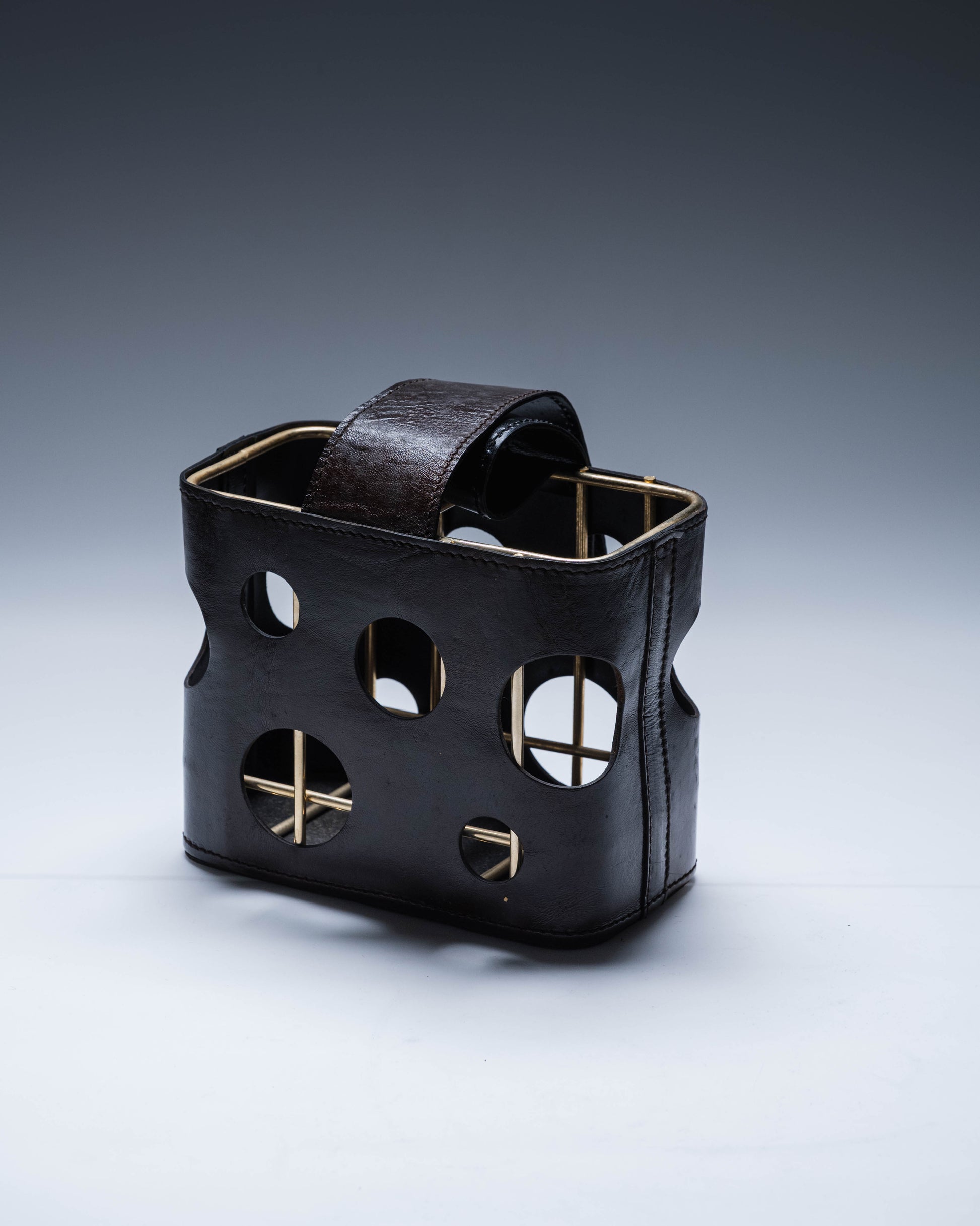Porte-bouteille en cuir gainé sur structure en métal, ajouré de motifs circulaires laissant apparaître l'ossature interne. Anse centrale en cuir. Dans le goût de Jacques Adnet. Pièce signée au revers. Bel état général.