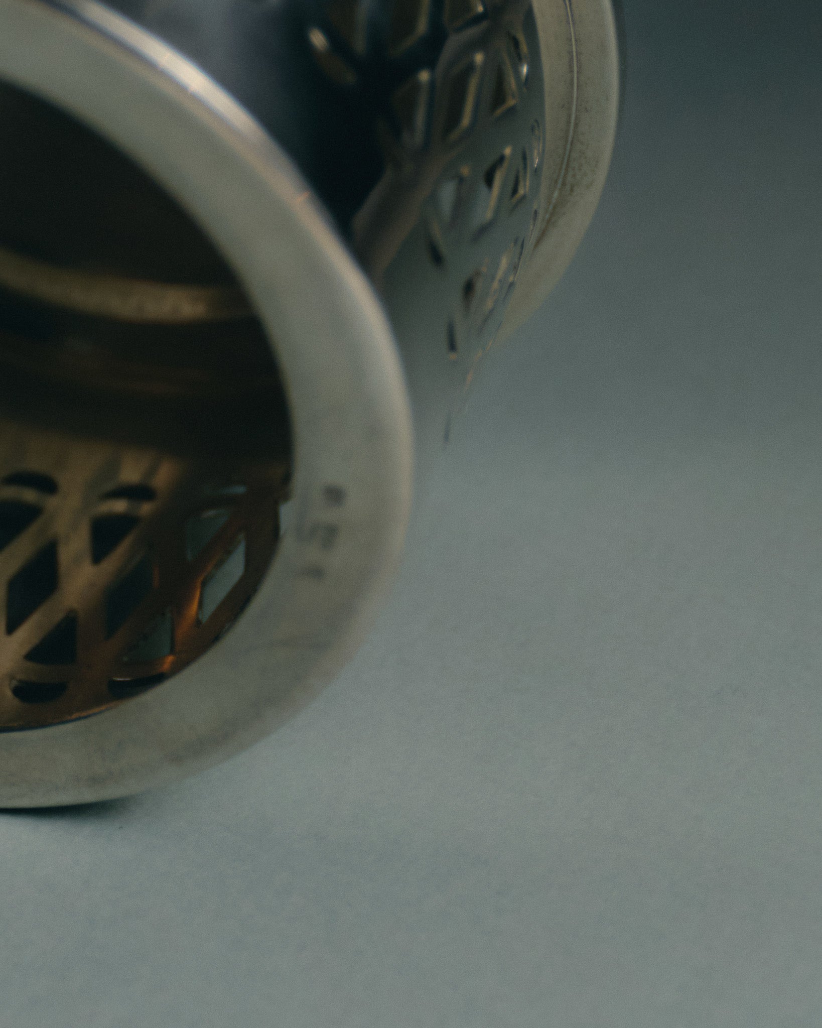 Pot de service à parmesan ou confiture en métal argenté et verre, travail français des années 1950. Monture ajourée à motif de croisillons, couvercle assorti et anse latérale fine. Le récipient intérieur est en verre épais transparent — également appelé verre-confiturier. Anse latérale fine et couvercle assorti.