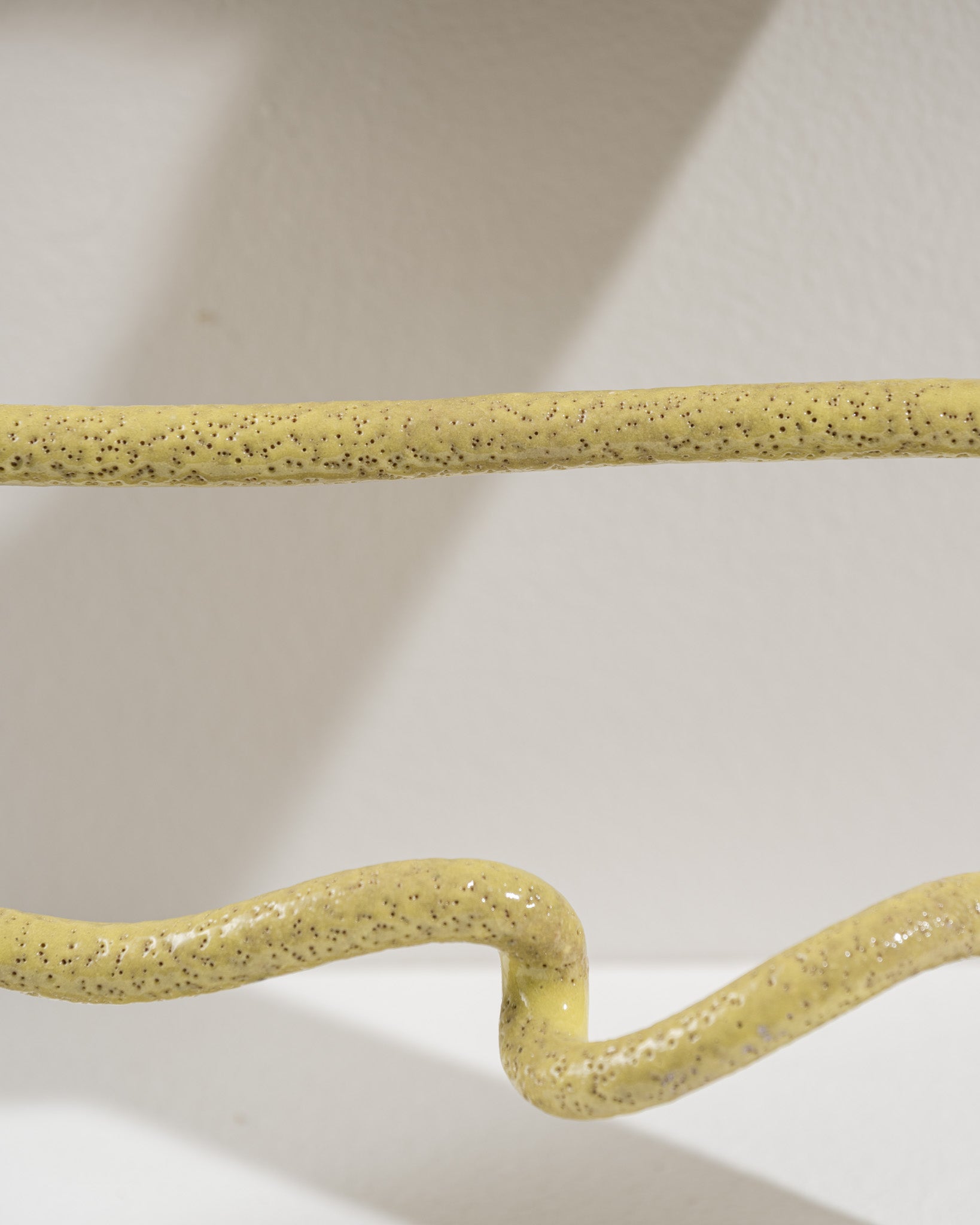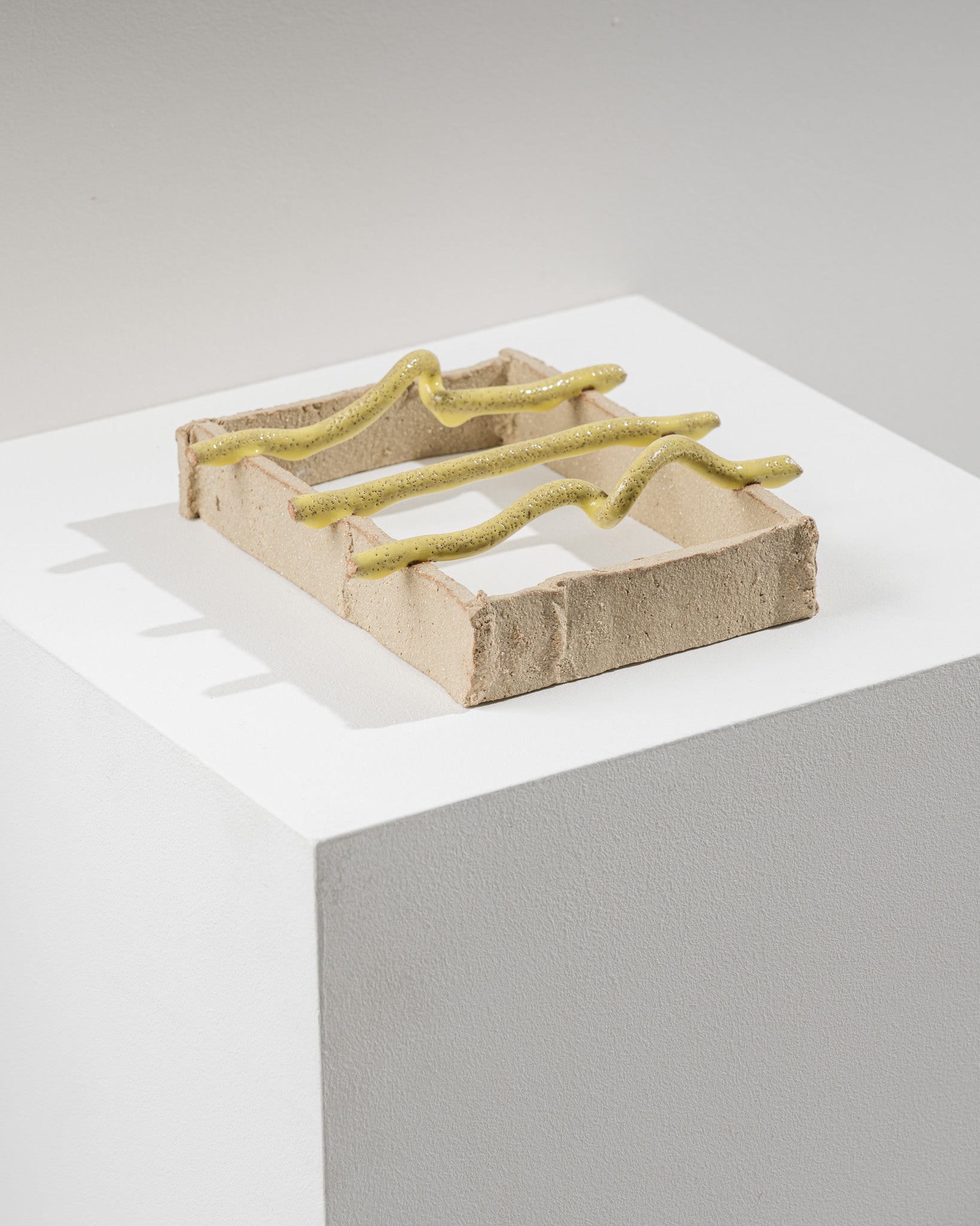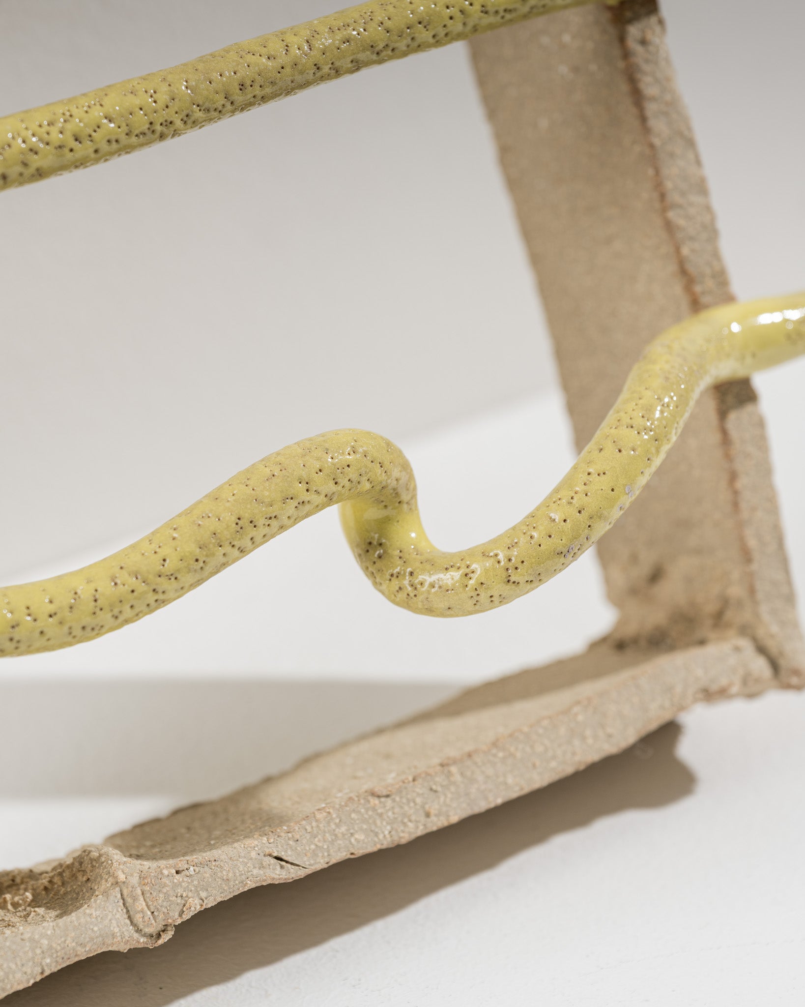 Sculpture en céramique signée Matthew Smith associant une base architecturale en terre brute à des éléments ondulés recouverts d’un émail jaune. L’ensemble illustre la recherche plastique de l’artiste autour du contraste entre structure et organicité. Parfait état.