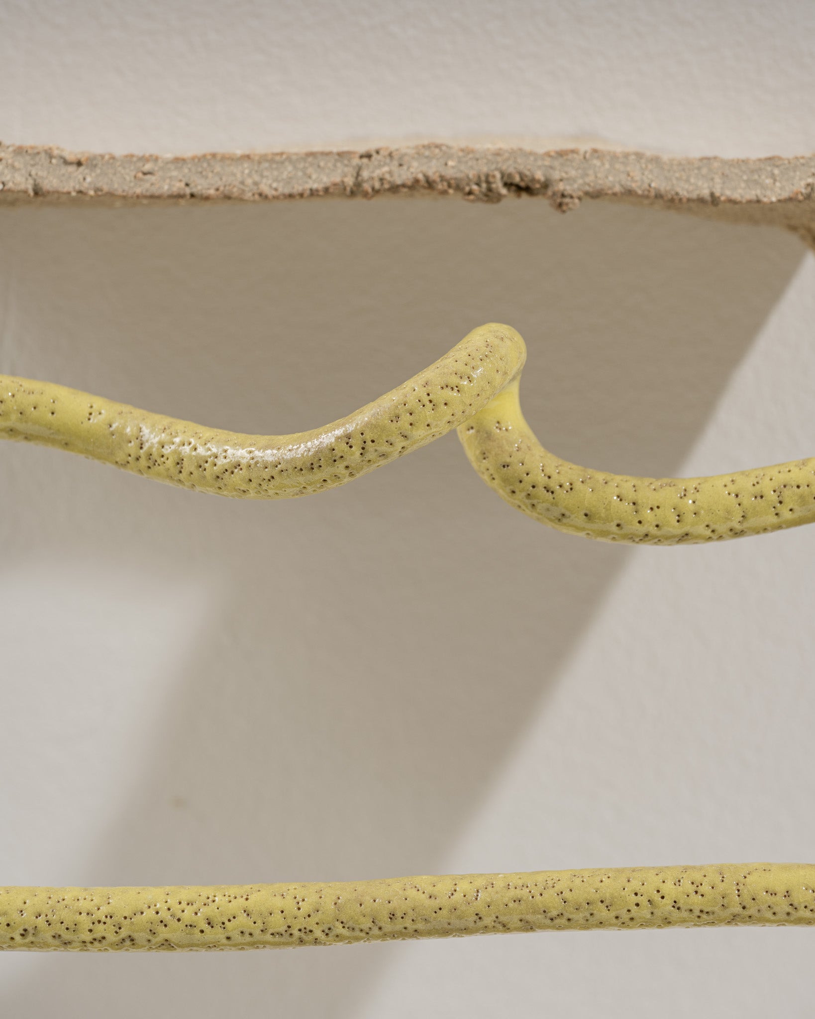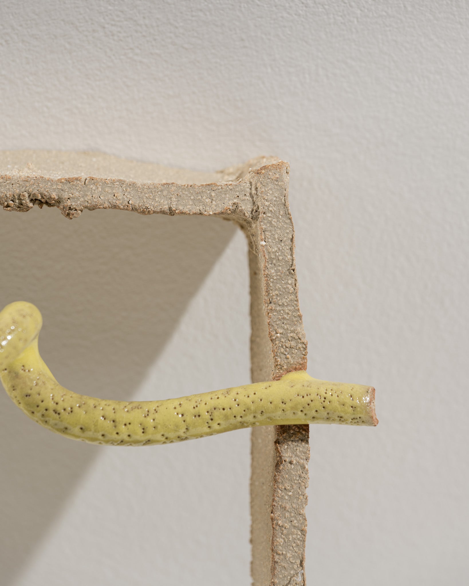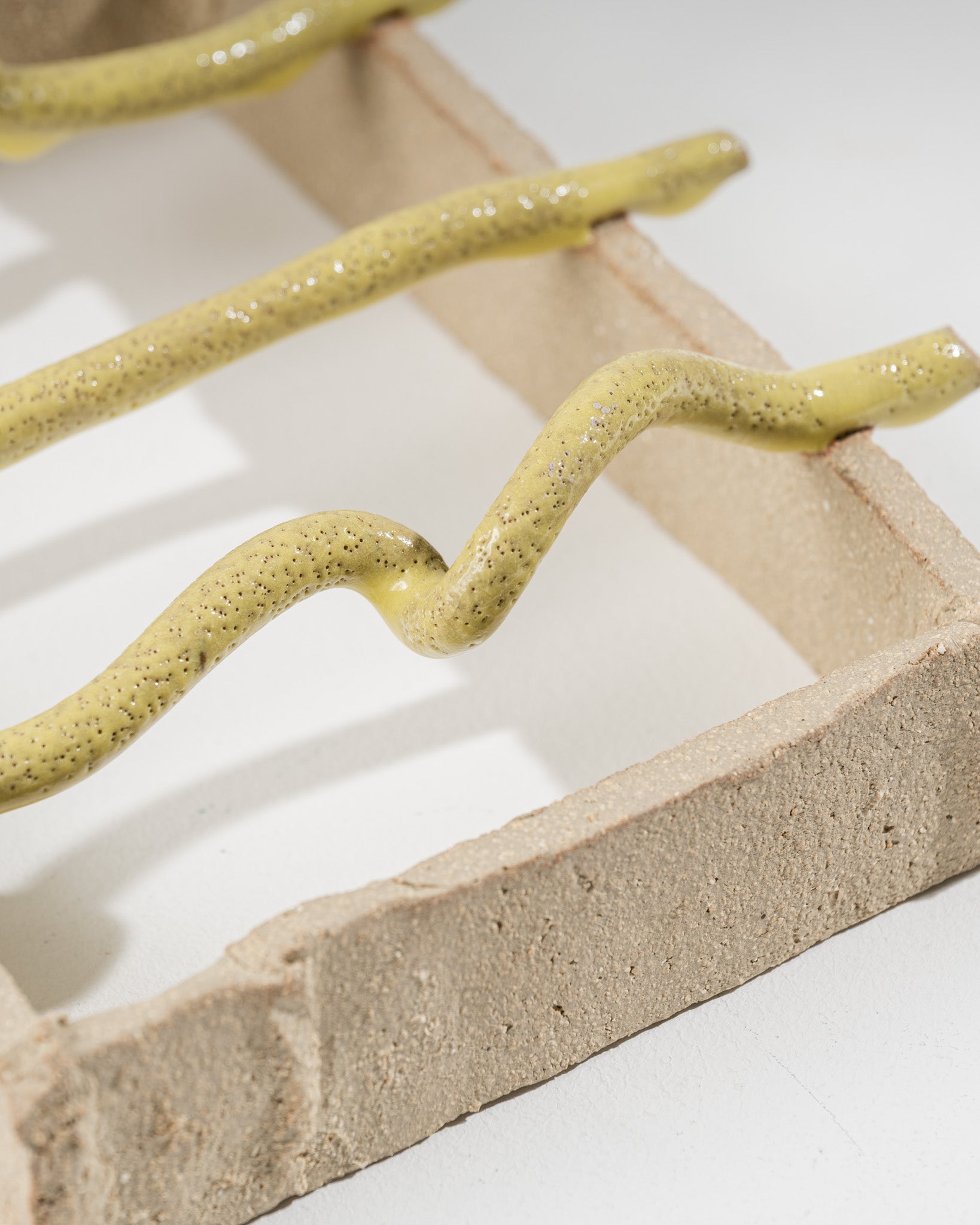 Sculpture en céramique signée Matthew Smith associant une base architecturale en terre brute à des éléments ondulés recouverts d’un émail jaune. L’ensemble illustre la recherche plastique de l’artiste autour du contraste entre structure et organicité. Parfait état.