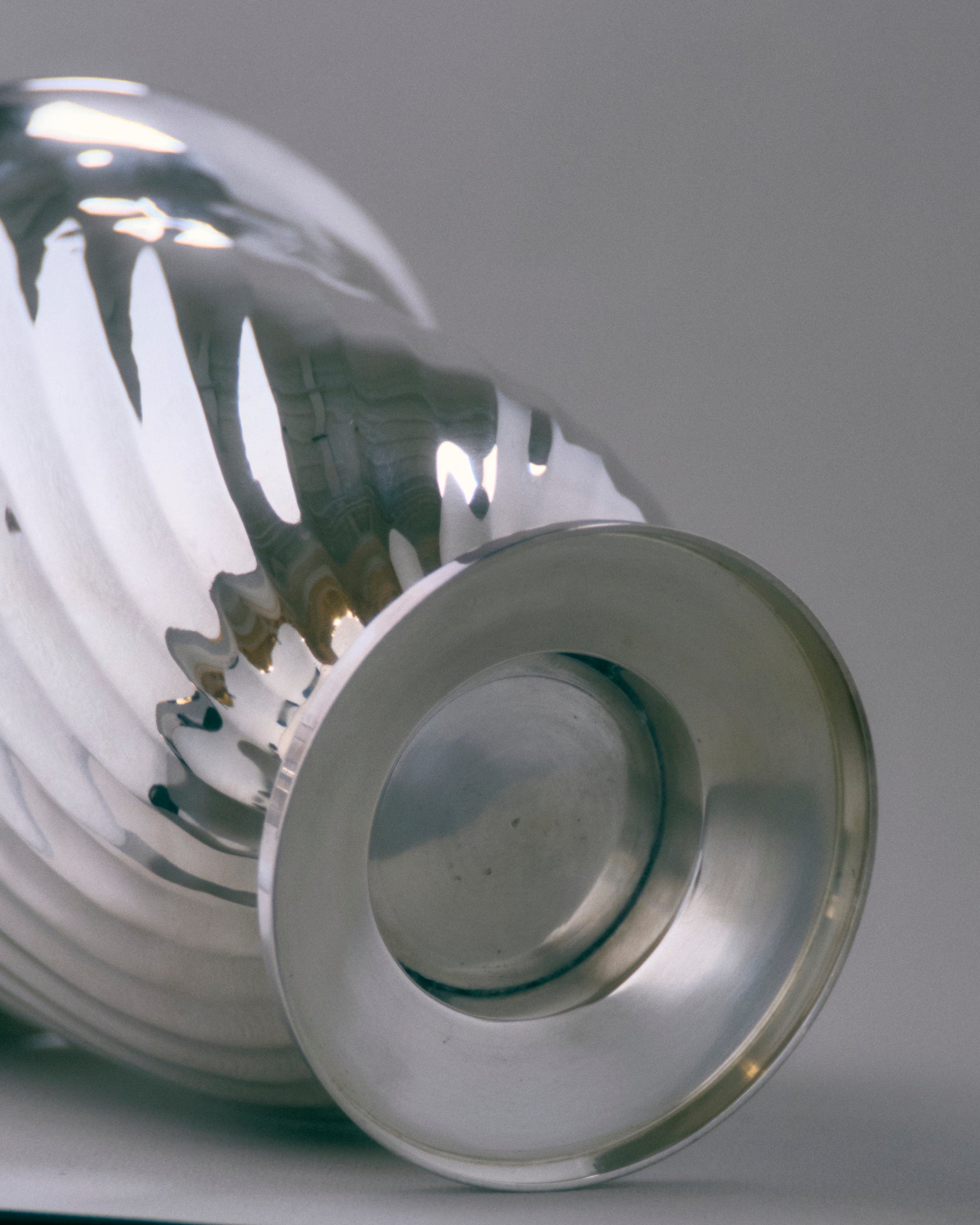 Seau à champagne en métal argenté, à panse galbée ornée de cannelures torsadées et reposant sur un piédouche circulaire. Poignées latérales à barres tournées et extrémités sphériques. Travail européen des années 1950.