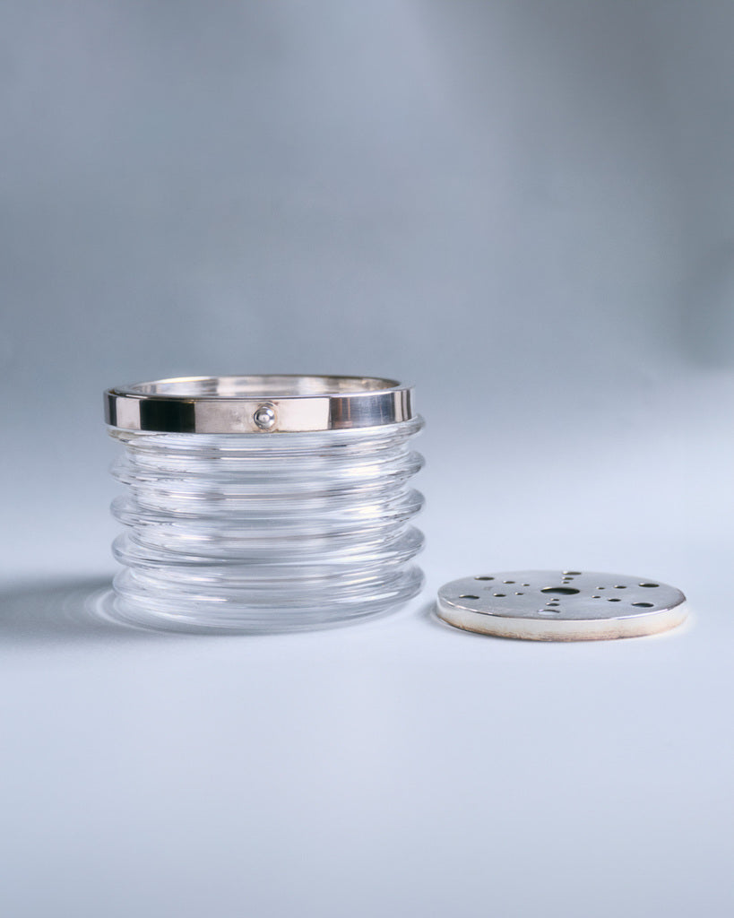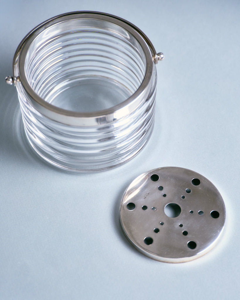 Petit sceau à glaçons en verre de Murano. Designé par Sergio Asti pour Arnolfo di Cambio. Sceau en verre transparent à décor d'anneaux concentrique. Poinçon ADC silverplace. Travail des années 1960.