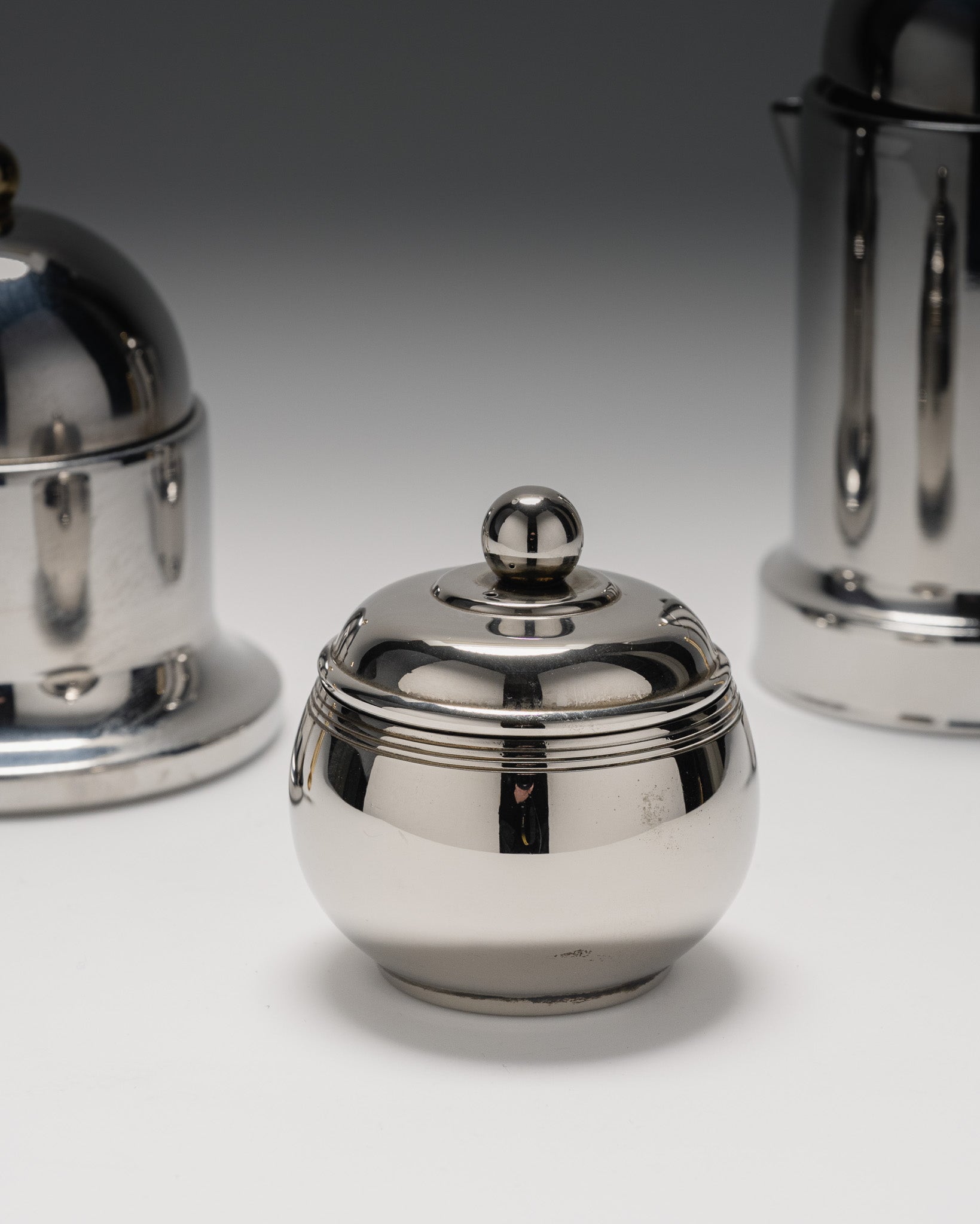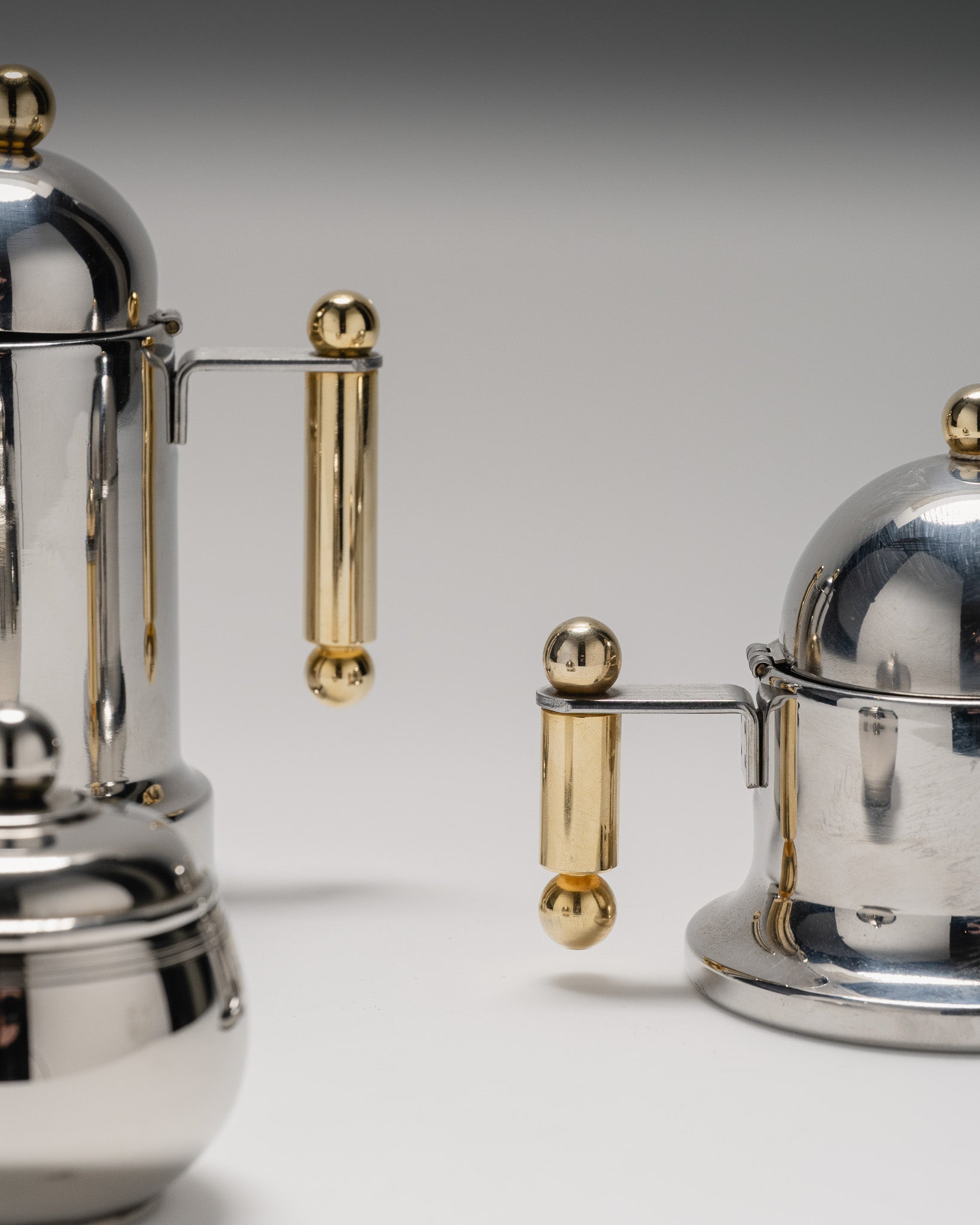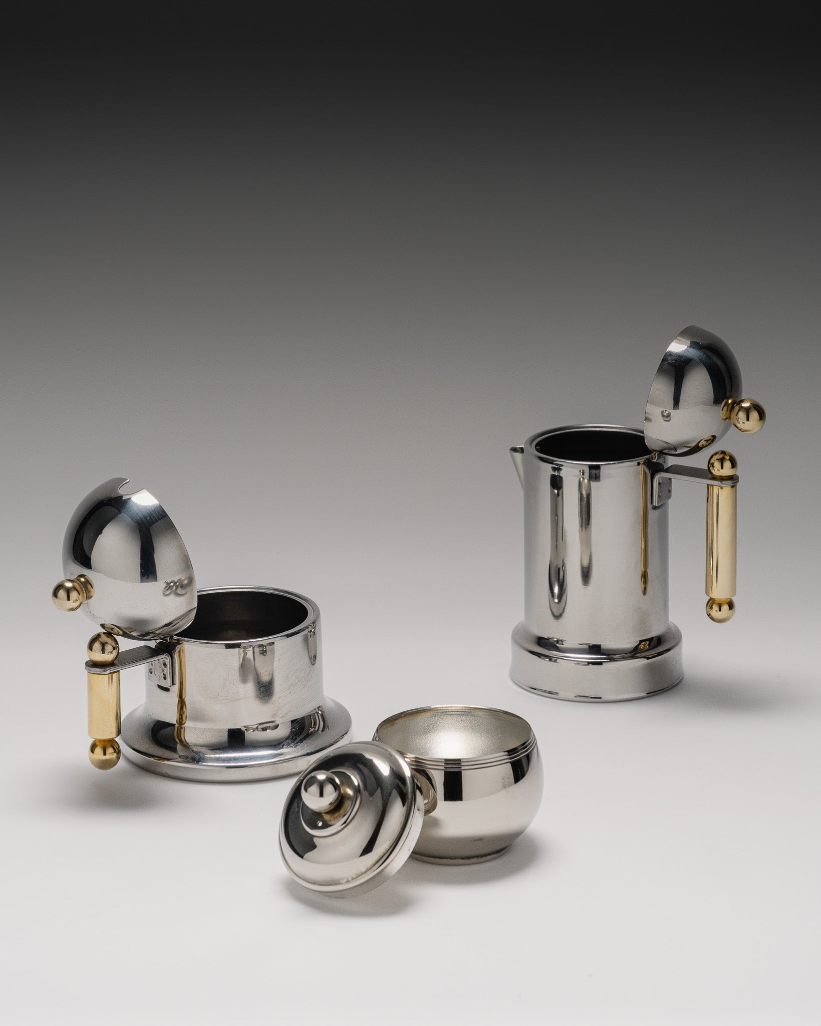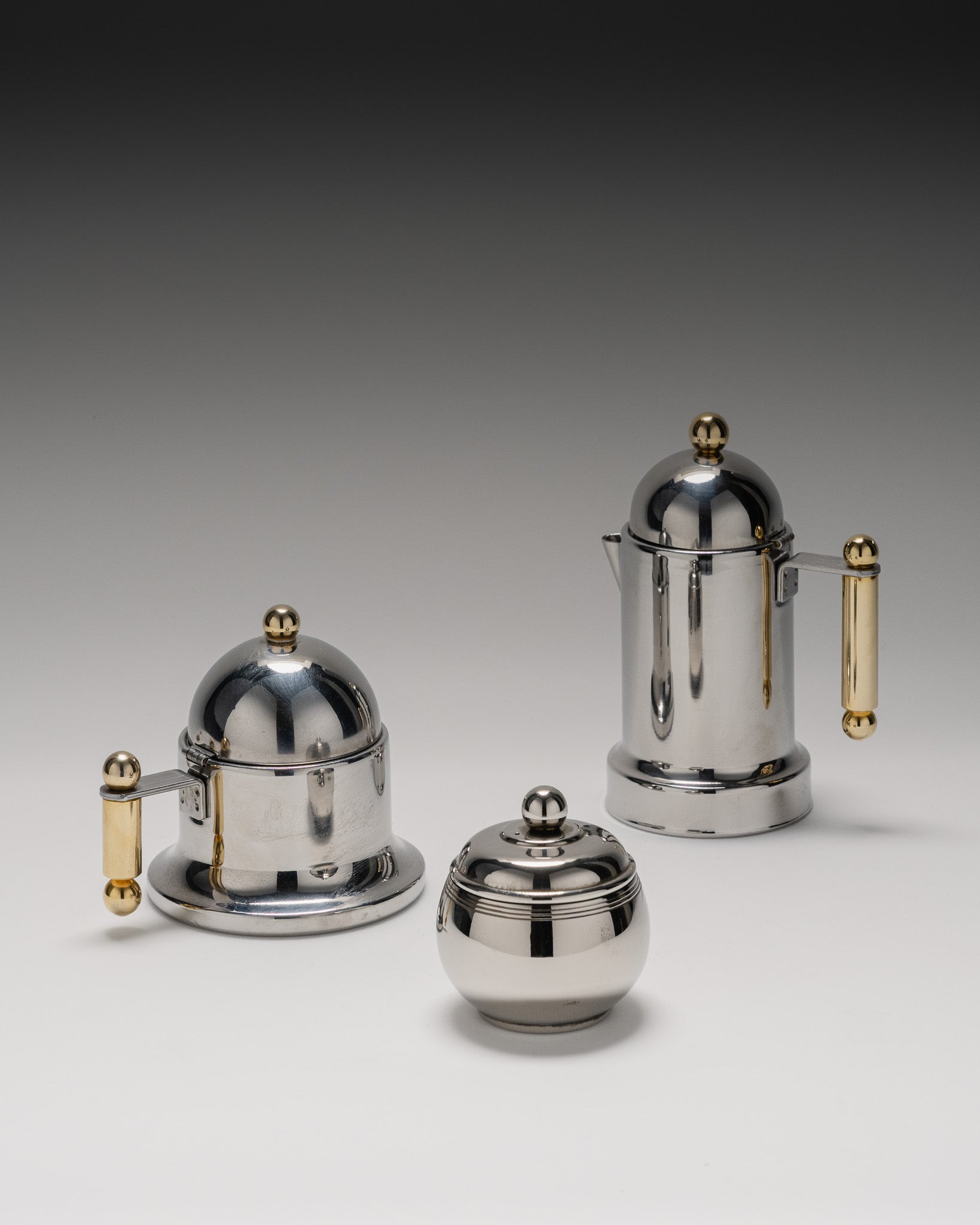 Service à café réalisé en inox 18/10, se composant d'une cafetière, d'un pot à lait et d'un sucrier. Silhouette cylindrique coiffée d'un couvercle hémisphérique et anse latérale soulignée d'un bouton sphérique doré. Travail italien des années 1980 et poinçonné sur le dessous.
