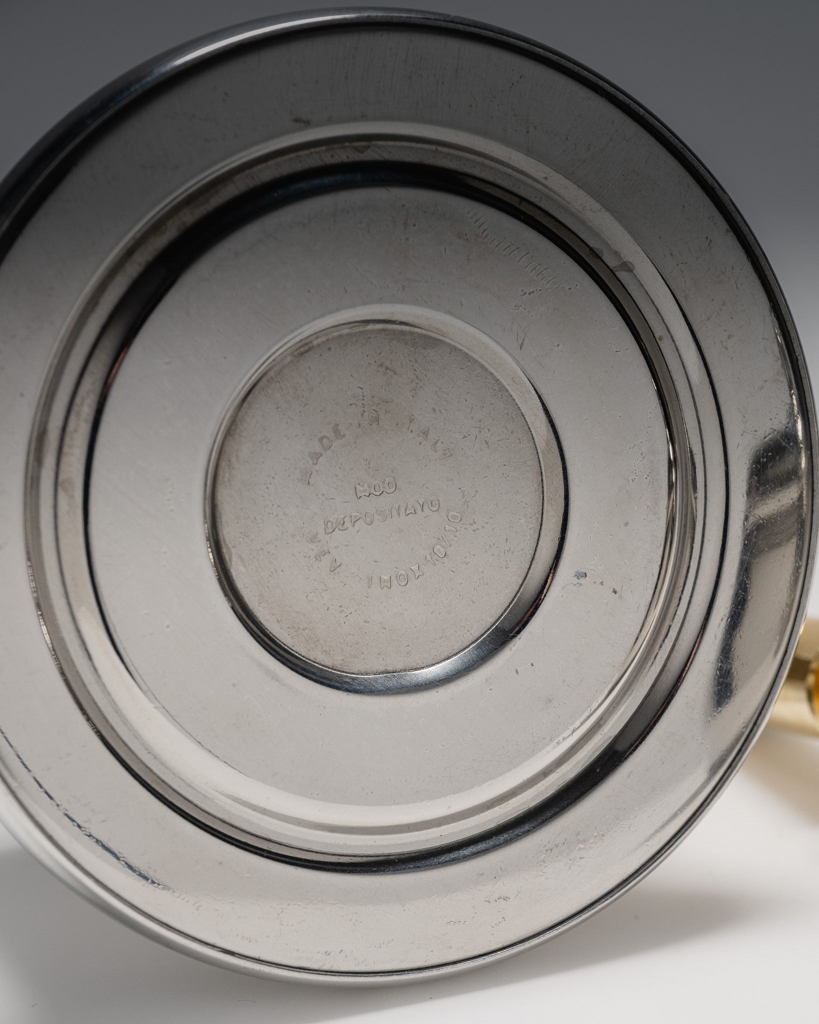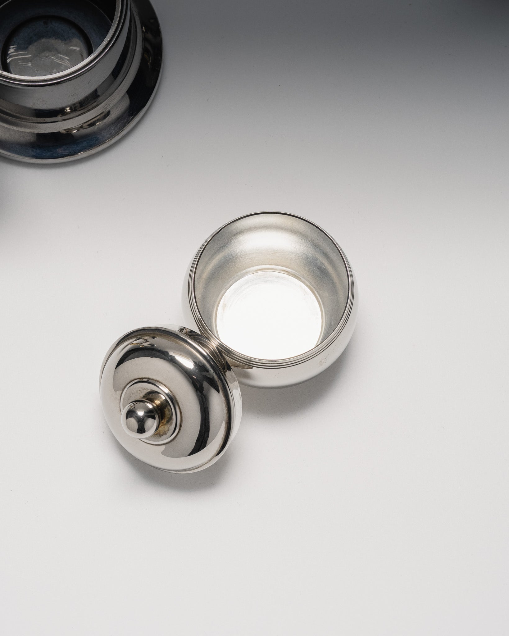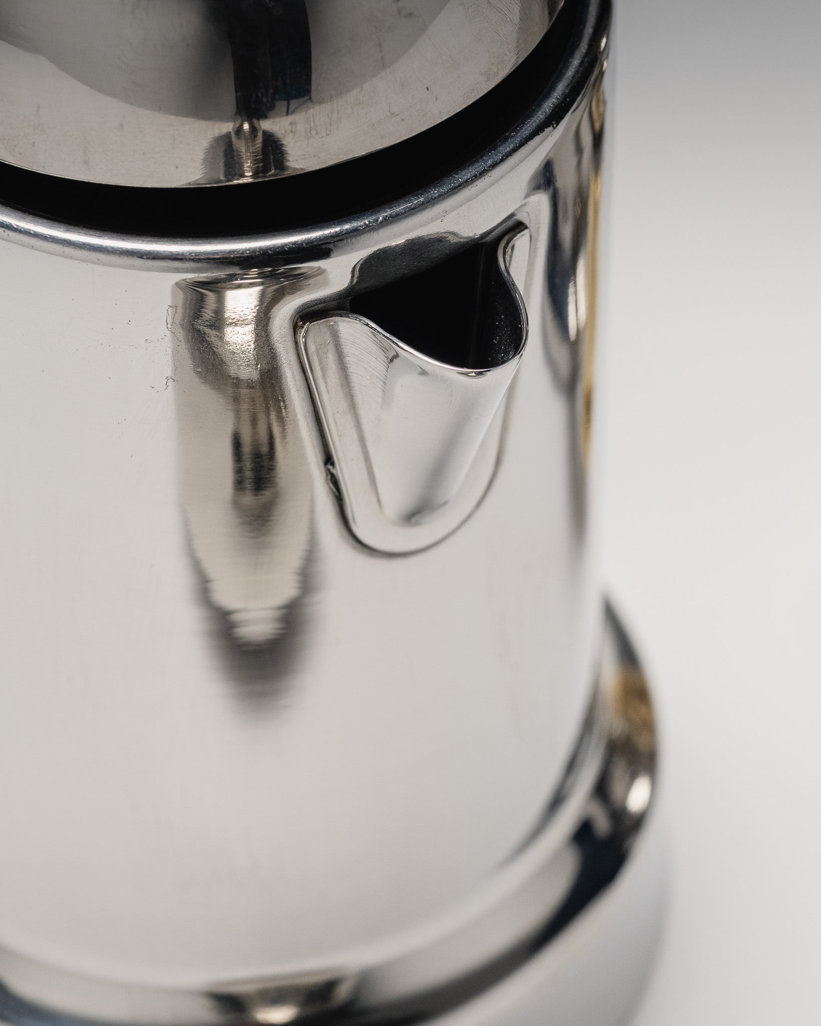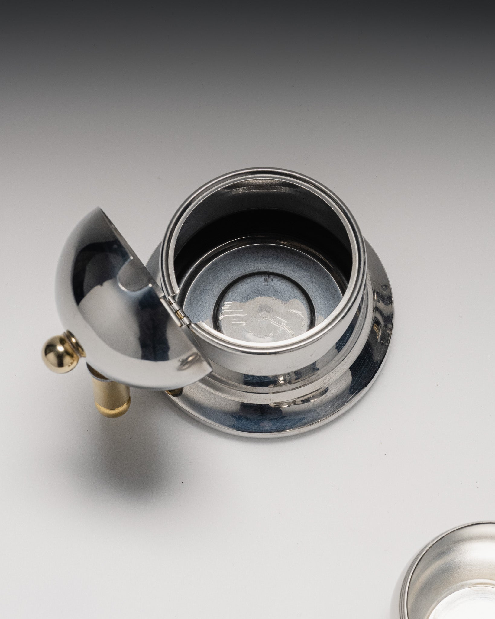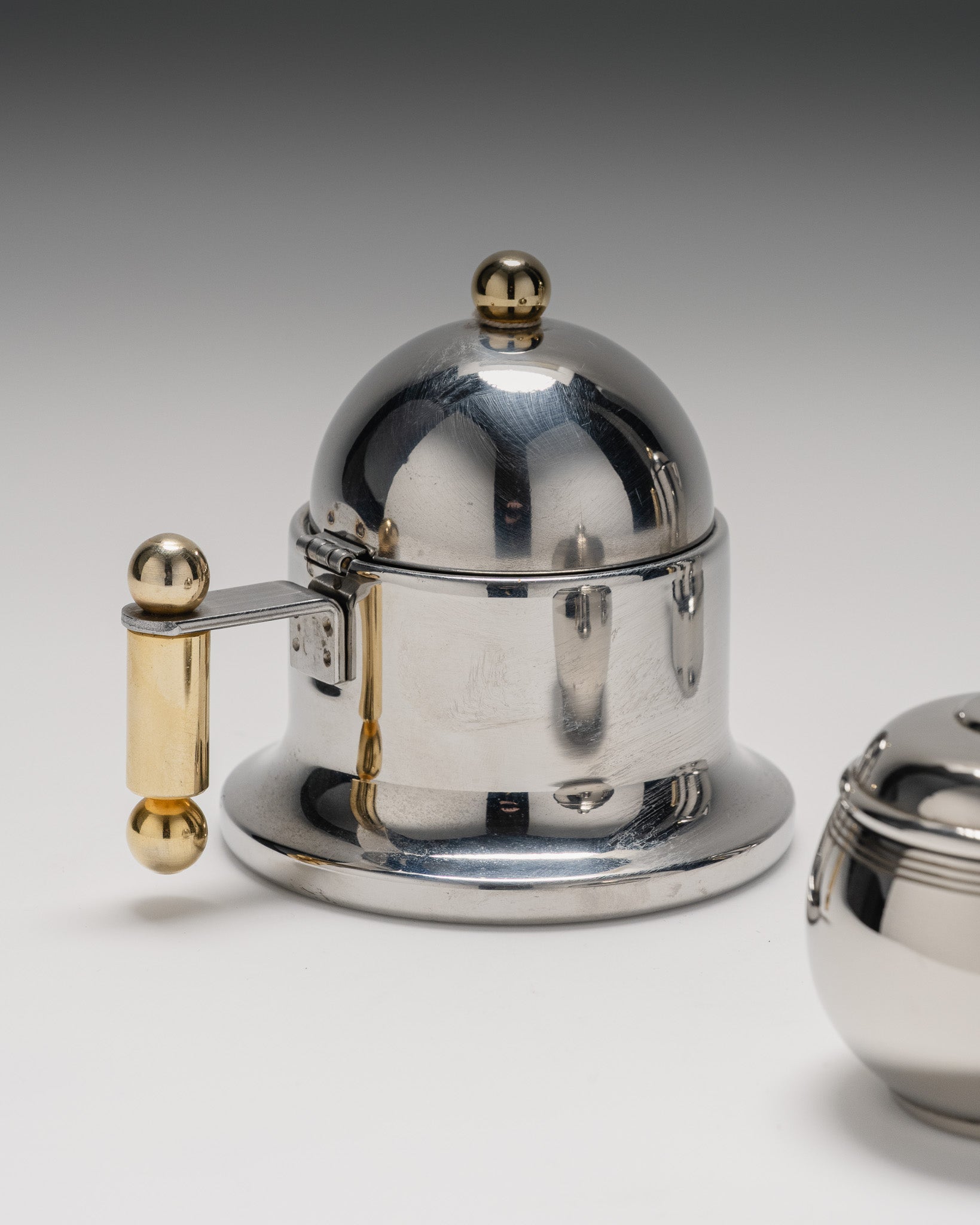 Service à café réalisé en inox 18/10, se composant d'une cafetière, d'un pot à lait et d'un sucrier. Silhouette cylindrique coiffée d'un couvercle hémisphérique et anse latérale soulignée d'un bouton sphérique doré. Travail italien des années 1980 et poinçonné sur le dessous.