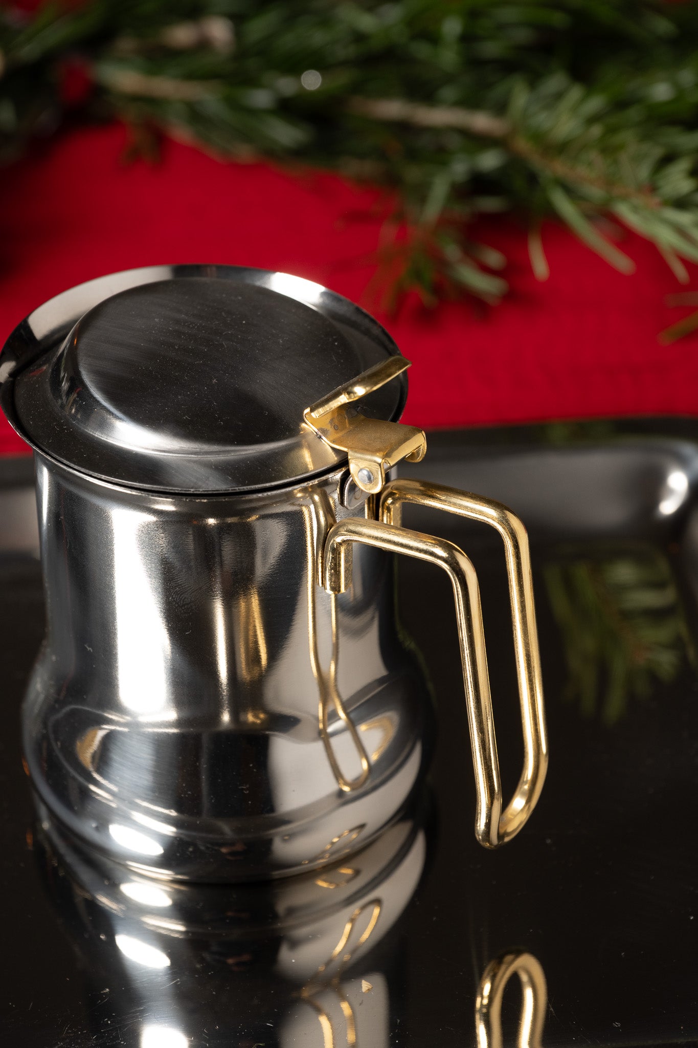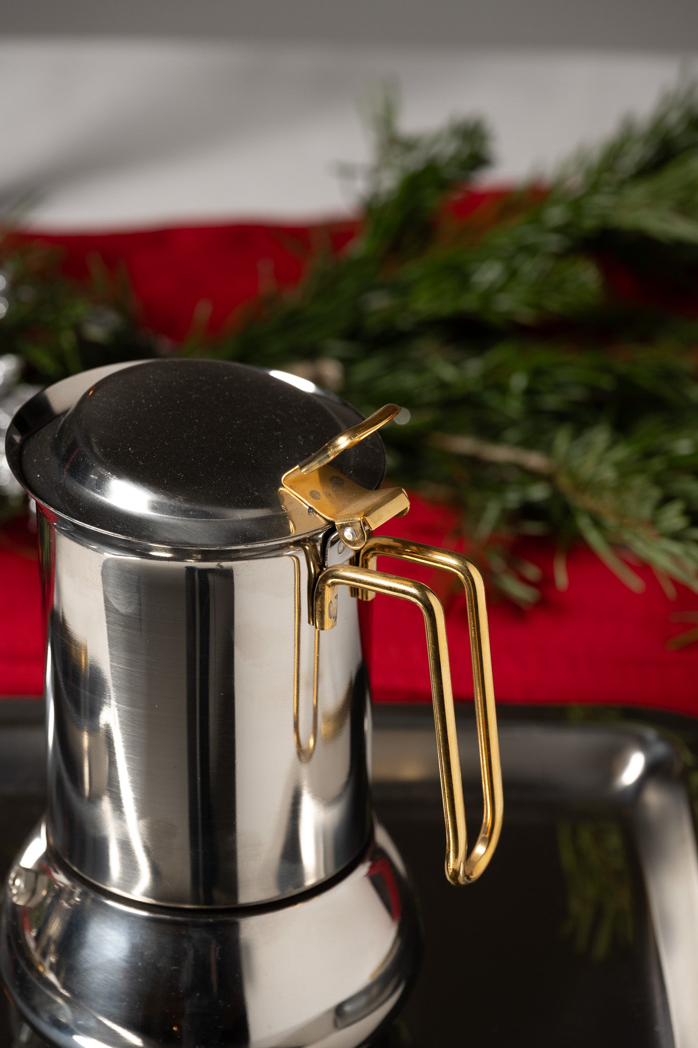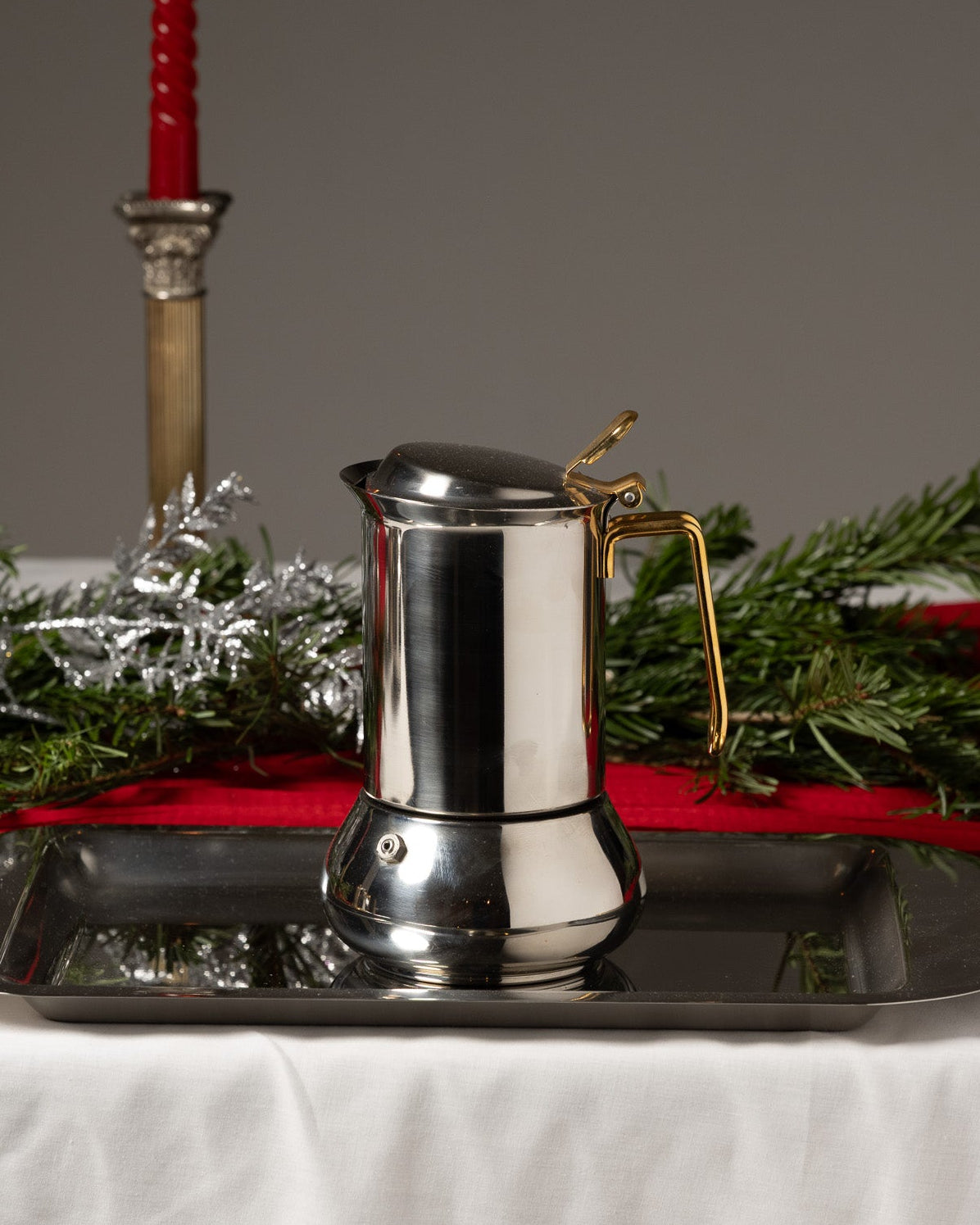 Service à café en inox composé d’une cafetière avec couvercle à charnière et filtre intérieur, d’une verseuse, d’un pot à lait et d’un sucrier avec couvercle. L’ensemble est présenté sur un plateau rectangulaire assorti. Les pièces présentent un corps galbé et des anses angulaires en métal doré. Un travail italien des années 1980. Bel état général.