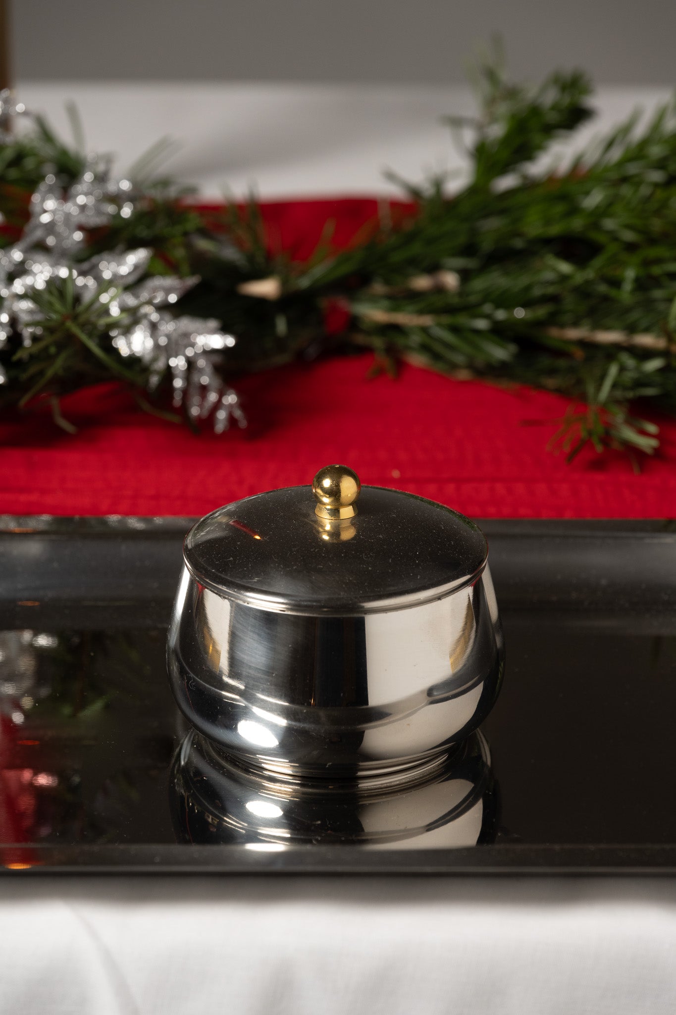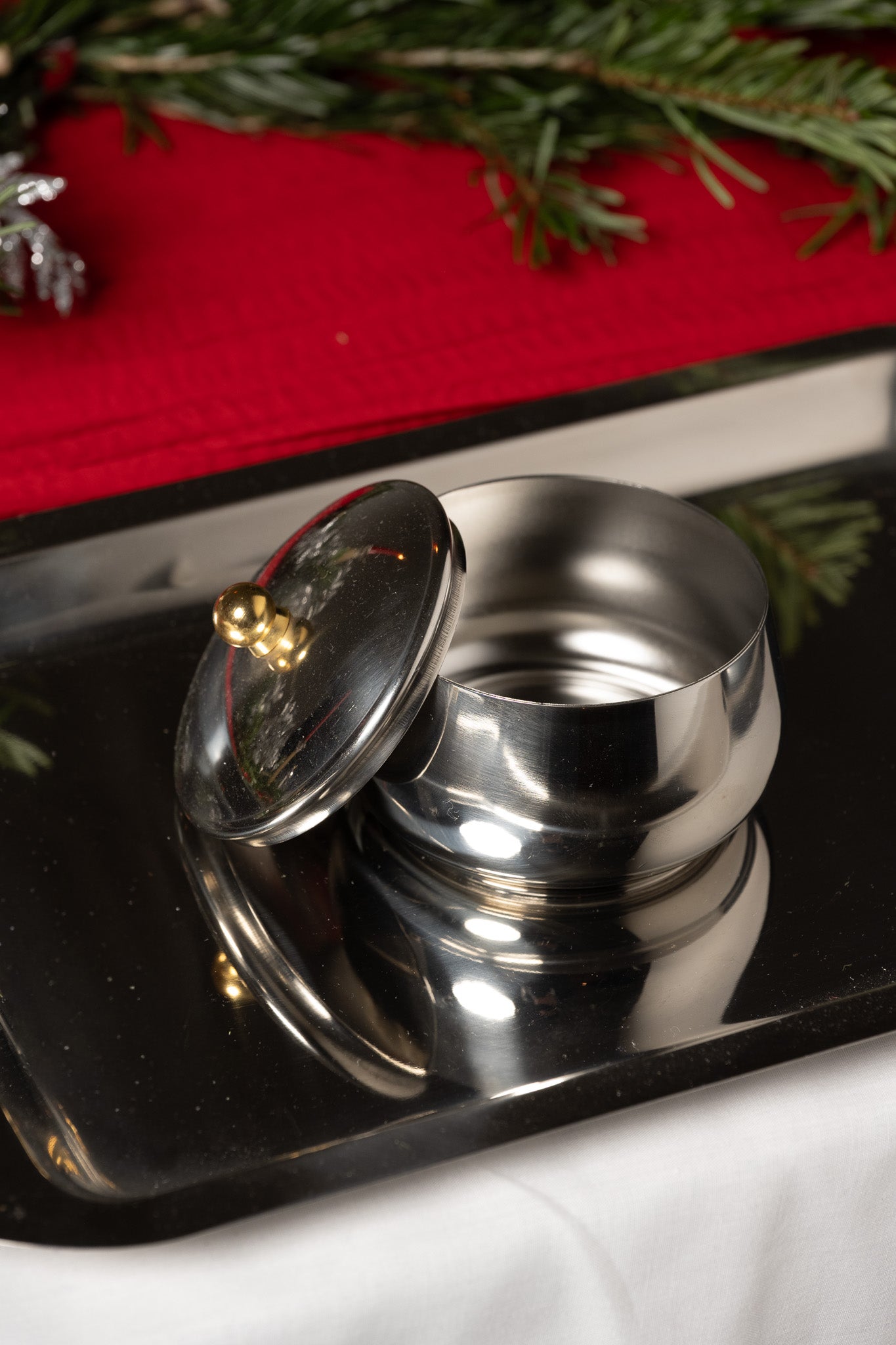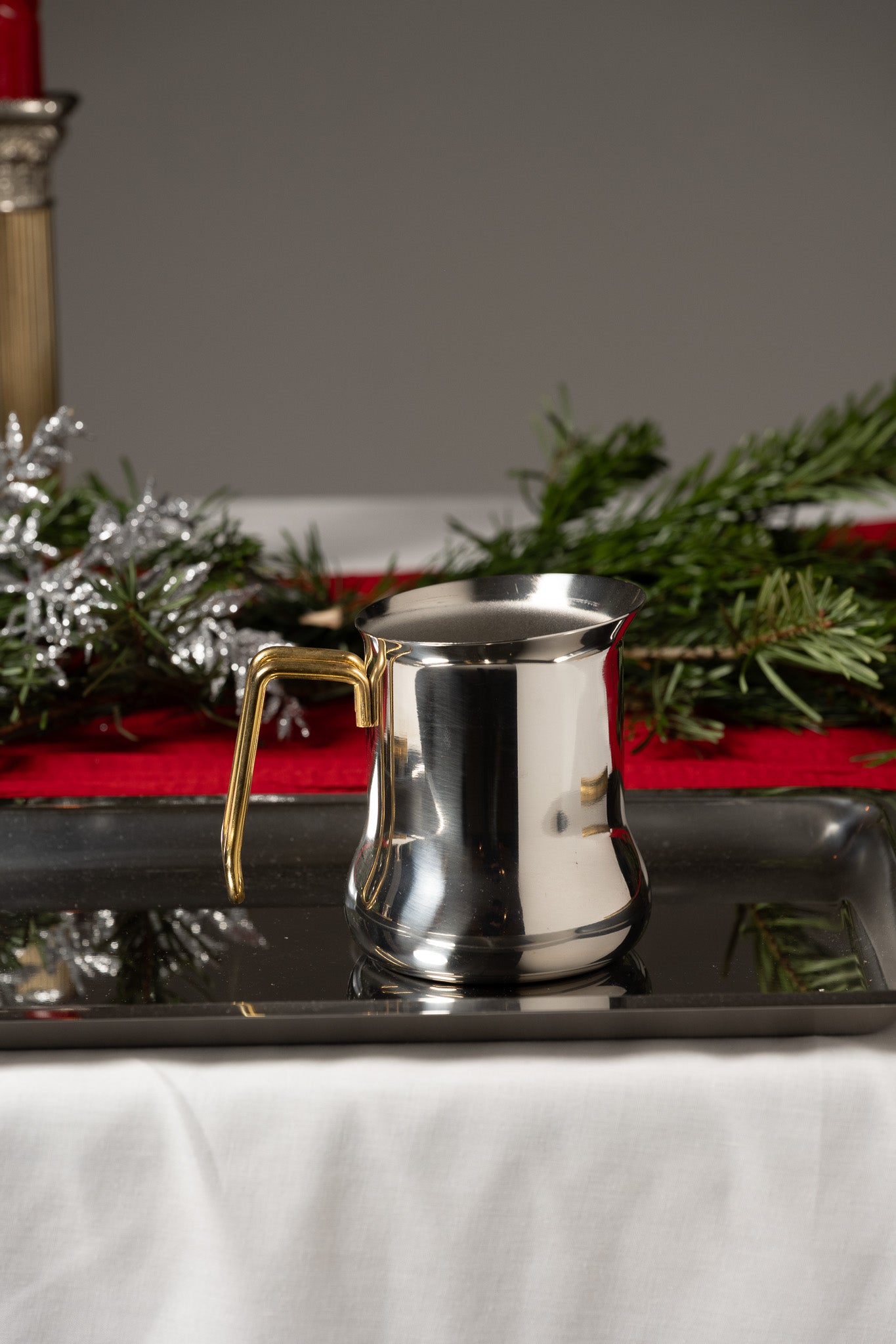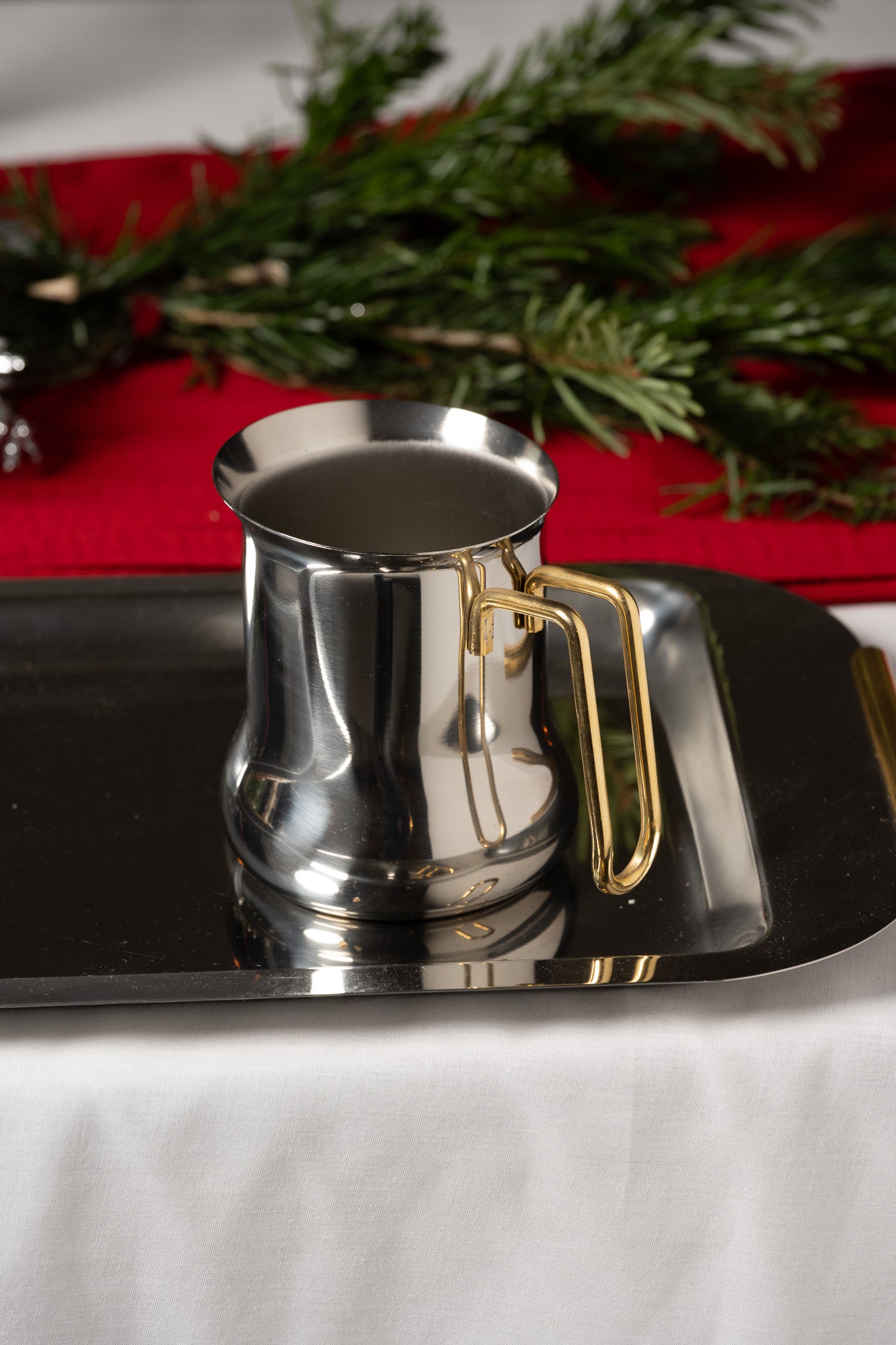 Service à café en inox composé d’une cafetière avec couvercle à charnière et filtre intérieur, d’une verseuse, d’un pot à lait et d’un sucrier avec couvercle. L’ensemble est présenté sur un plateau rectangulaire assorti. Les pièces présentent un corps galbé et des anses angulaires en métal doré. Un travail italien des années 1980. Bel état général.