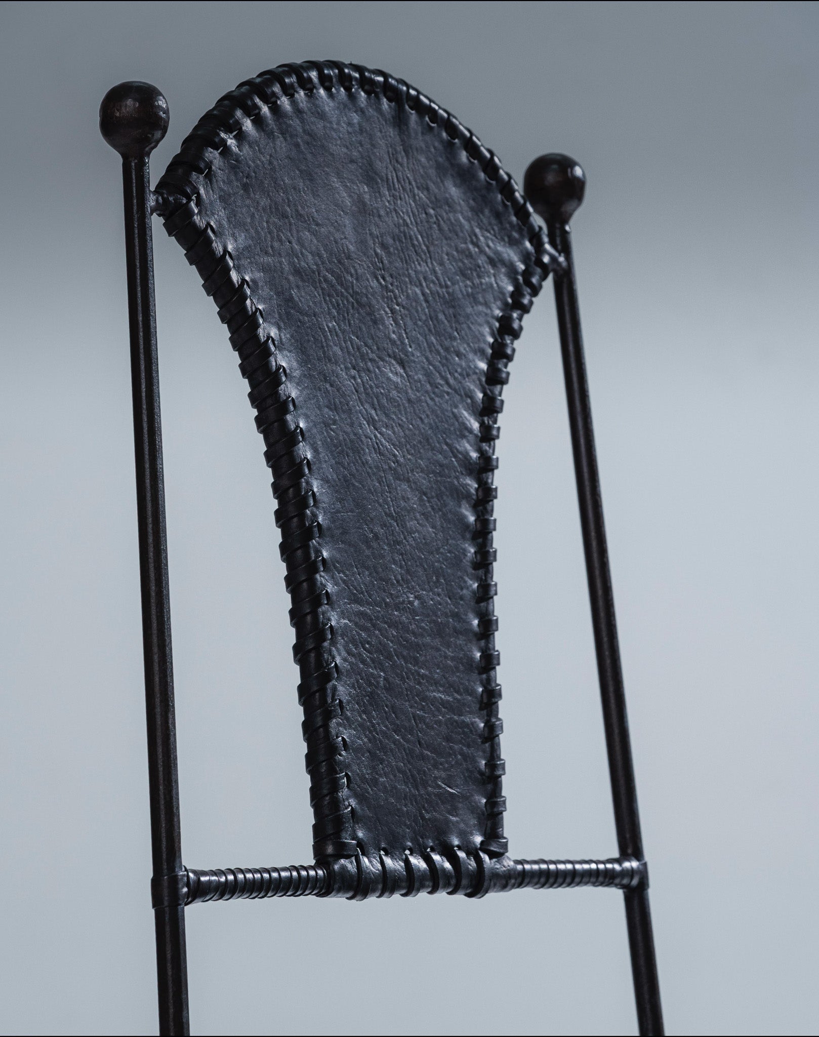 Set de 4 chaises en cuir et métal, dans le goût des années 1970. Structure en métal noirci, cintré et assemblé, reposant sur quatre pieds fuselés reliés par entretoises basses. Dossier haut à montants verticaux, terminé par des embouts sphériques. Assise et dossier en cuir noir épais, tendu et maintenu par un laçage périphérique en lanière de cuir.