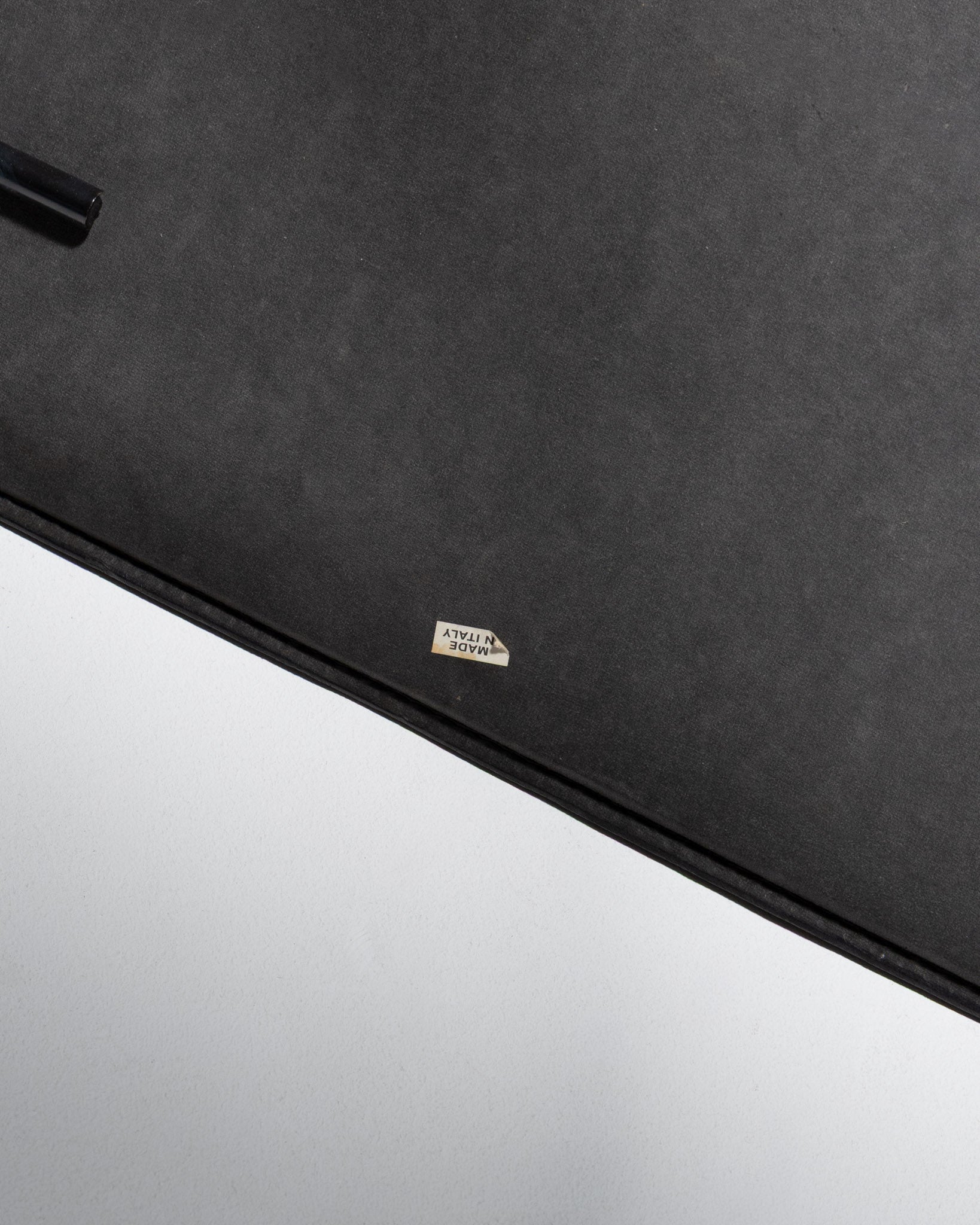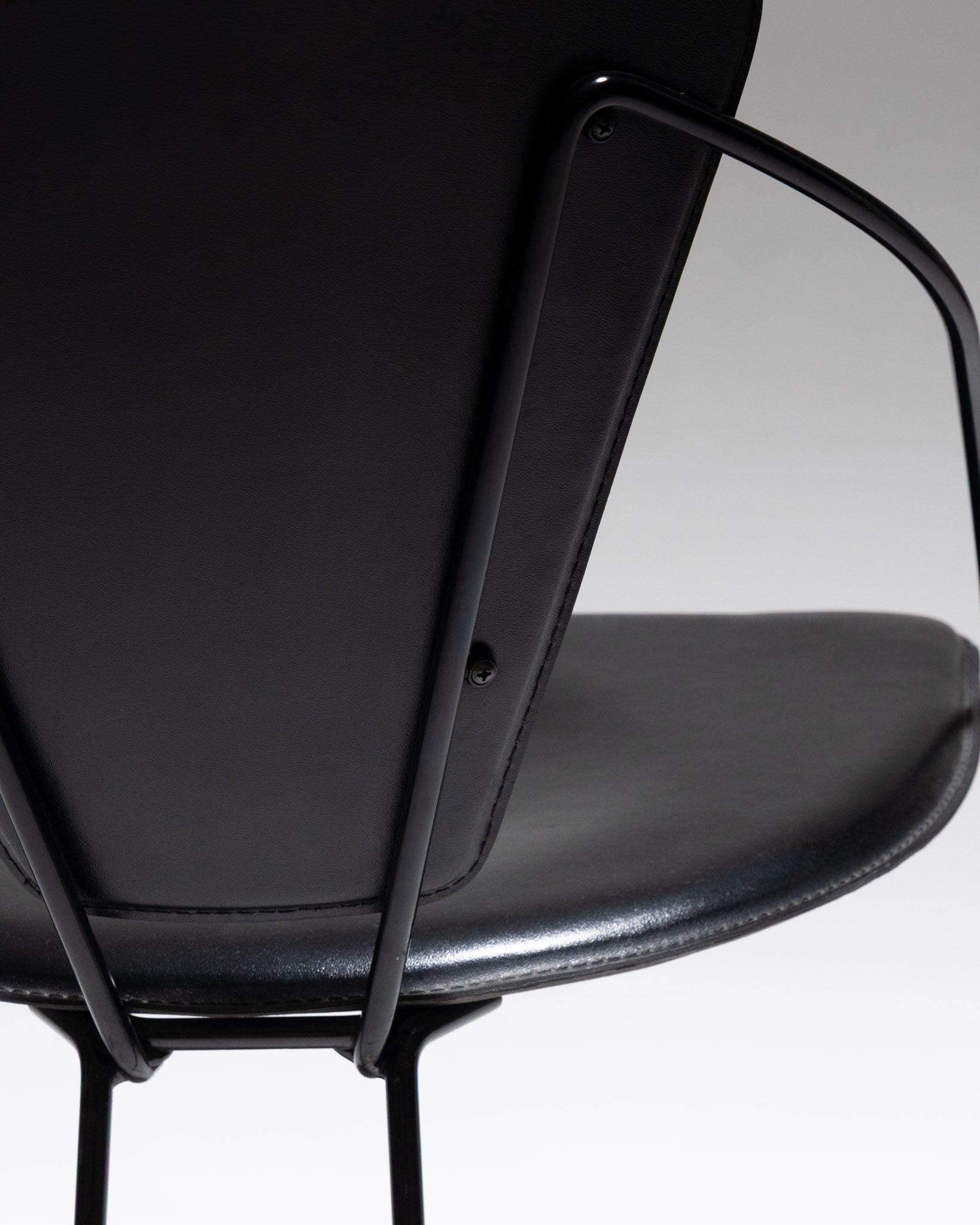 Set de 4 chaises modèle Linda, éditées par Arrben, années 1960. Structure en métal laqué noir formant un piètement luge avec arceau arrière cintré. Assise et dossier en métal recouverts de cuir noir.