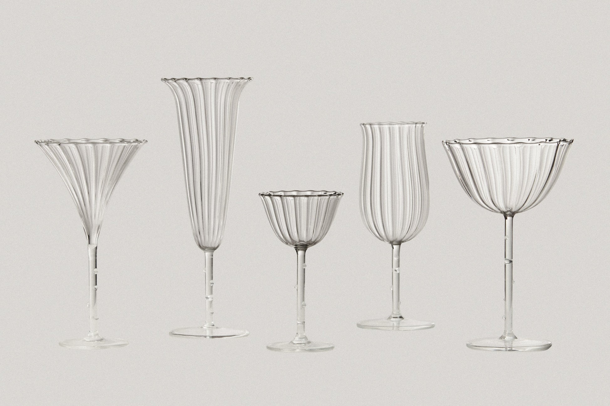 LA COLLECTION BOUQUET EST UNE SÉRIE DE CINQ VERRES À PIED EN VERRE BOROSILICATÉ, QUI BROUILLE LA FRONTIÈRE ENTRE OBJETS FONCTIONNELS ET DÉCORATIFS. CHAQUE CALICE ET REBORD S’ÉPANOUIT COMME UNE TÊTE DE FLEUR, FORMANT ENSEMBLE UN BOUQUET DE FLEURS SAUVAGES – CHAQUE FORME ÉTANT ADAPTÉE À UN TYPE DE BOISSON PARTICULIER TOUT EN S’UNISSANT DANS UNE COLLECTION HARMONIEUSE QUI PEUT ÊTRE DISPOSÉE CÔTE À CÔTE.