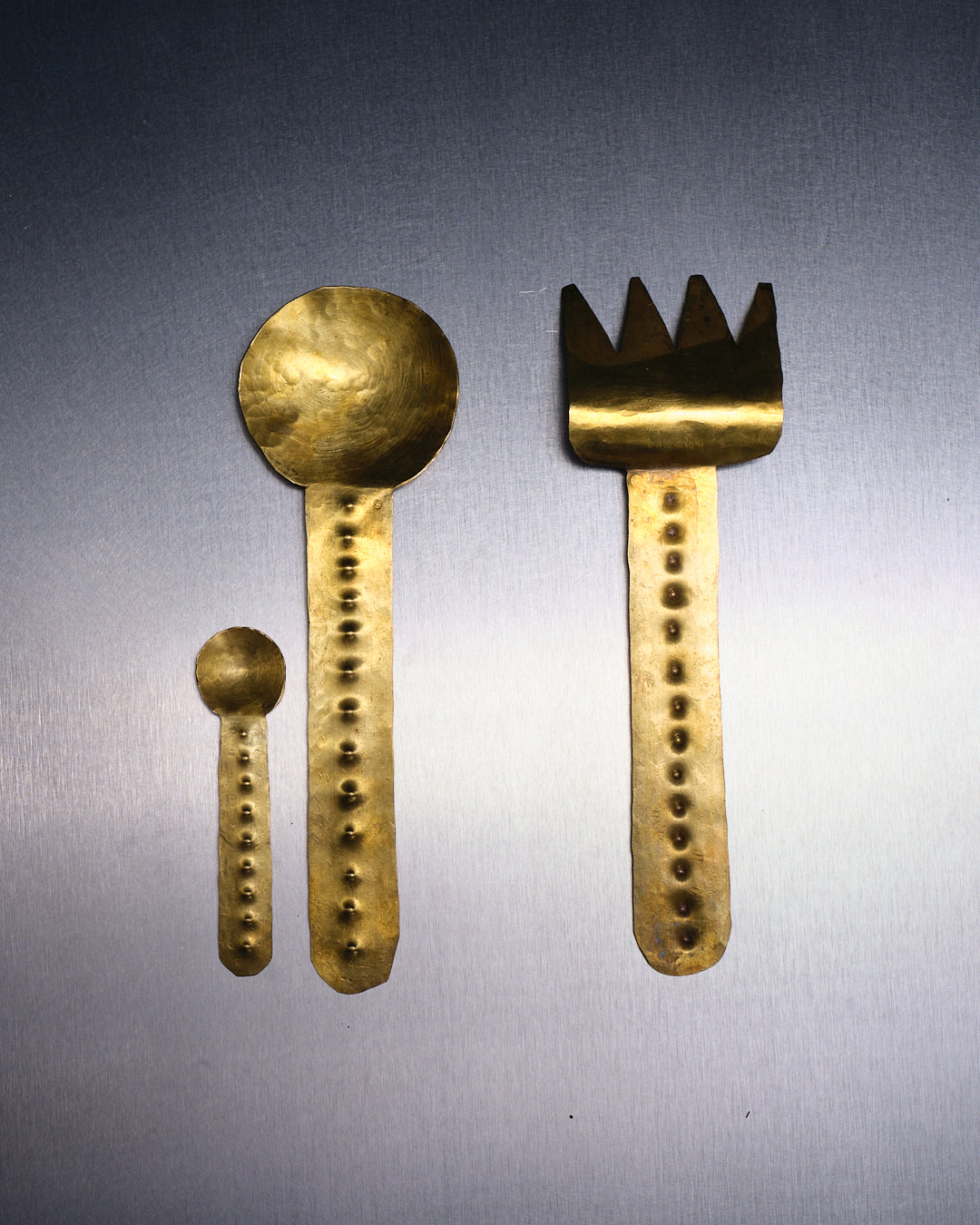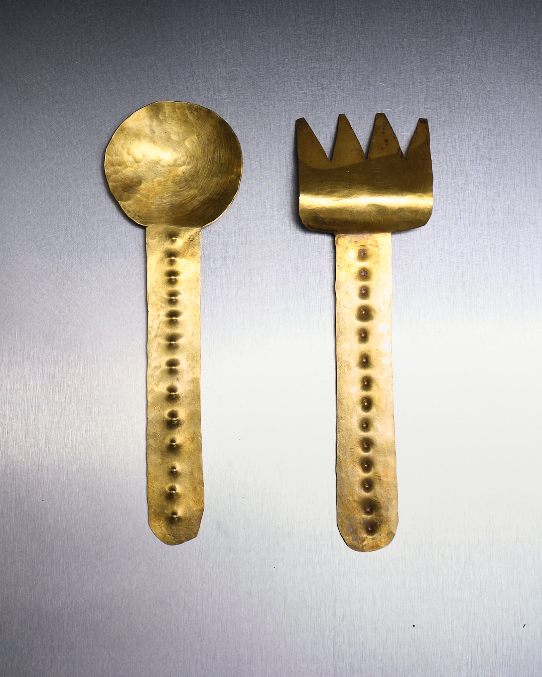 Set de couverts à salade "Crocodile" à manche plat en laiton doré, par le designer Sebastiao Lobo. Chaque pièce est unique.
