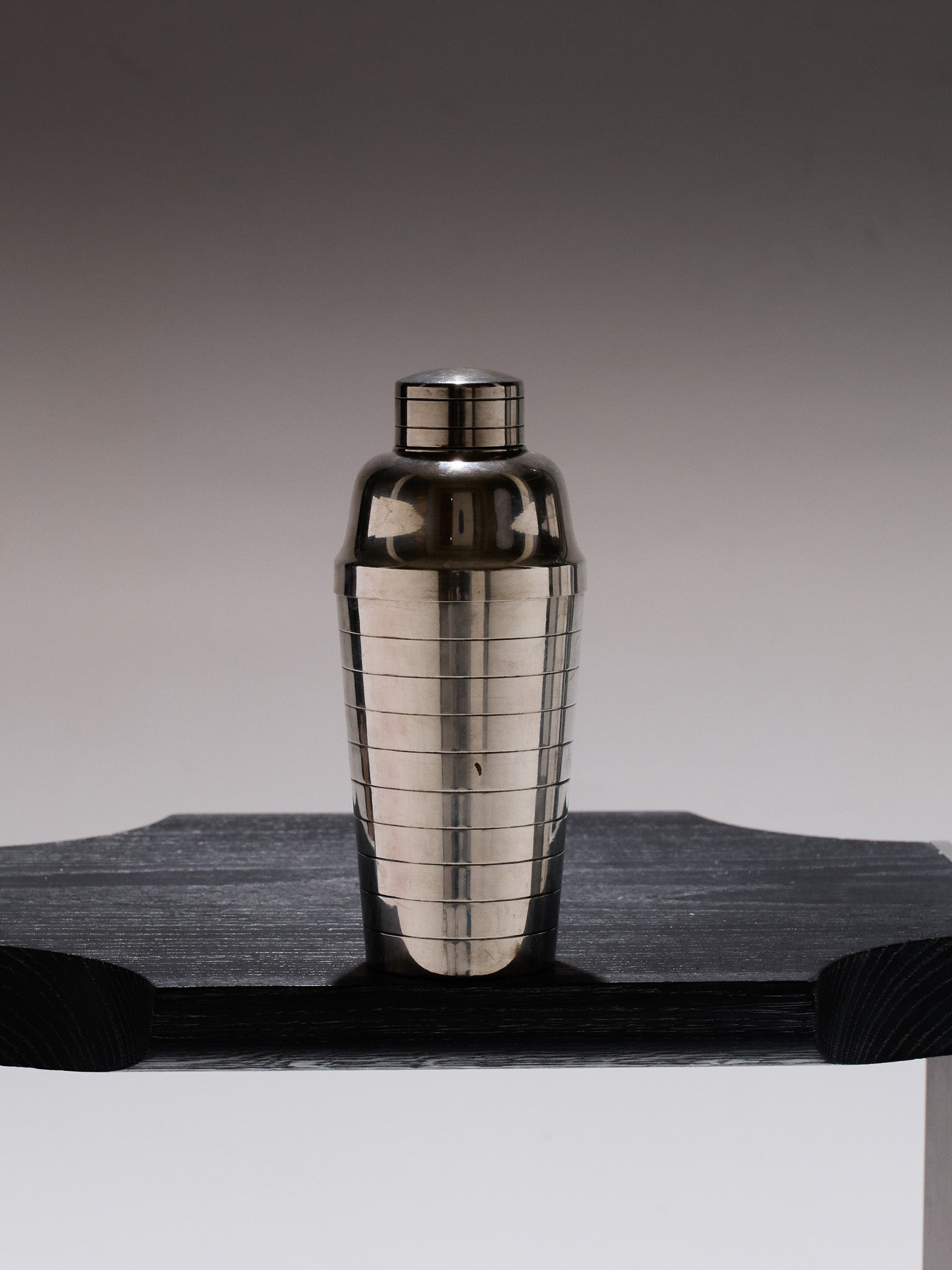 Shaker en métal argenté composé de trois éléments : corps, couvercle perforé et bouchon doseur. Corps cylindrique à pans doux, rythmé de fines stries horizontales. Travail milieu du XXe siècle.
